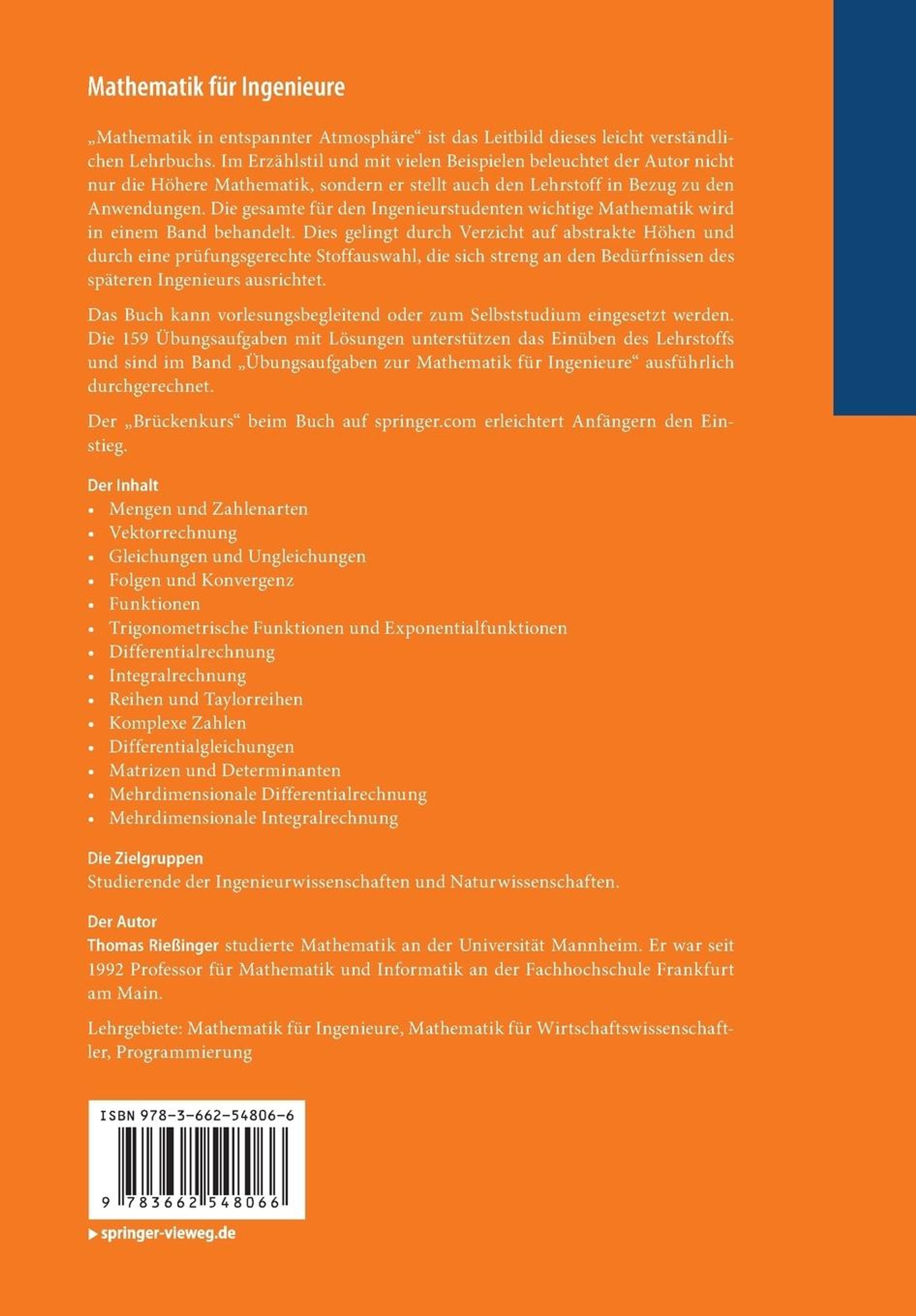 "Mathematik in entspannter Atmosphäre" ist das Leitbild dieses leicht verständlichen Lehrbuchs. Im Erzählstil und mit vielen Beispielen beleuchtet der Autor nicht nur die Höhere Mathematik, sondern er stellt auch den Lehrstoff in Bezug zu den Anwendungen. Die gesamte für den Ingenieurstudenten wichtige Mathematik wird in einem Band behandelt. Dies gelingt durch Verzicht auf abstrakte Höhen und durch eine prüfungsgerechte Stoffauswahl, die sich streng an den Bedürfnissen des späteren Ingenieurs ausrichtet. Das Buch kann vorlesungsbegleitend oder zum Selbststudium eingesetzt werden. Die 159 Übungsaufgaben mit Lösungen unterstützen das Einüben des Lehrstoffs und sind im Band "Übungsaufgaben zur Mathematik für Ingenieure" ausführlich durchgerechnet. Der "Brückenkurs" beim Buch auf springer. com erleichtert Anfängern den Einstieg.