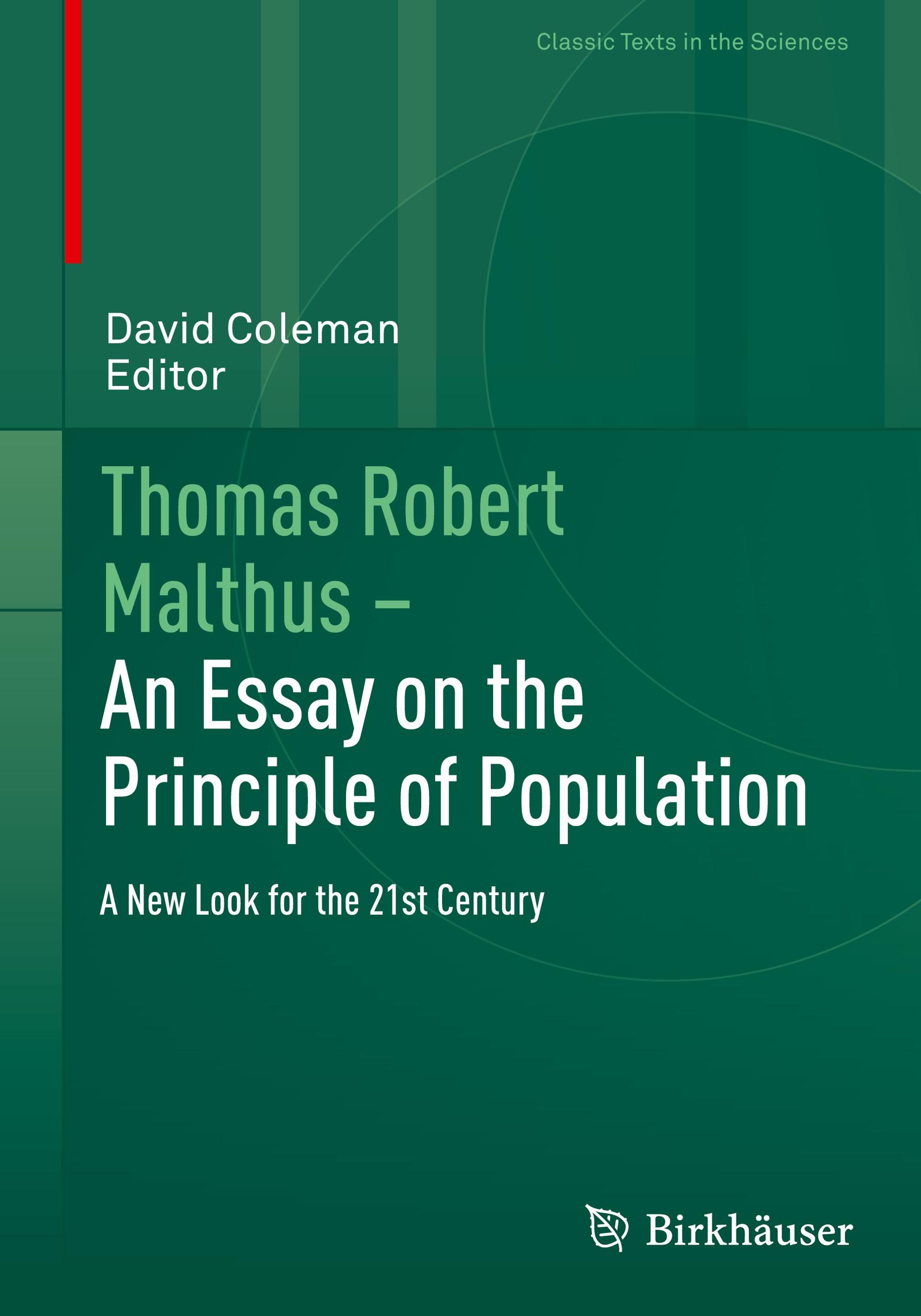 This book presents Thomas Robert Malthus' influential classic in the history of economic thought, "An Essay on the Principle of Population," 6th edition (1826), marking its 200th anniversary. The critical introduction accompanying the original text in this volume explains Malthus's view that human populations grow until checked by disease, hunger, and death. Malthus moderated his initially harsher views in later editions like this one, showing how societies could adopt measures to avert the severe consequences of population pressure on resources. His initial outburst was a reaction to utopian speculations. Malthus' ideas, influencing Darwin and Wallace, continue to provoke strong reactions. This introduction suggests that dismissing Malthus stems from ignorance or misunderstanding of demographic changes.
