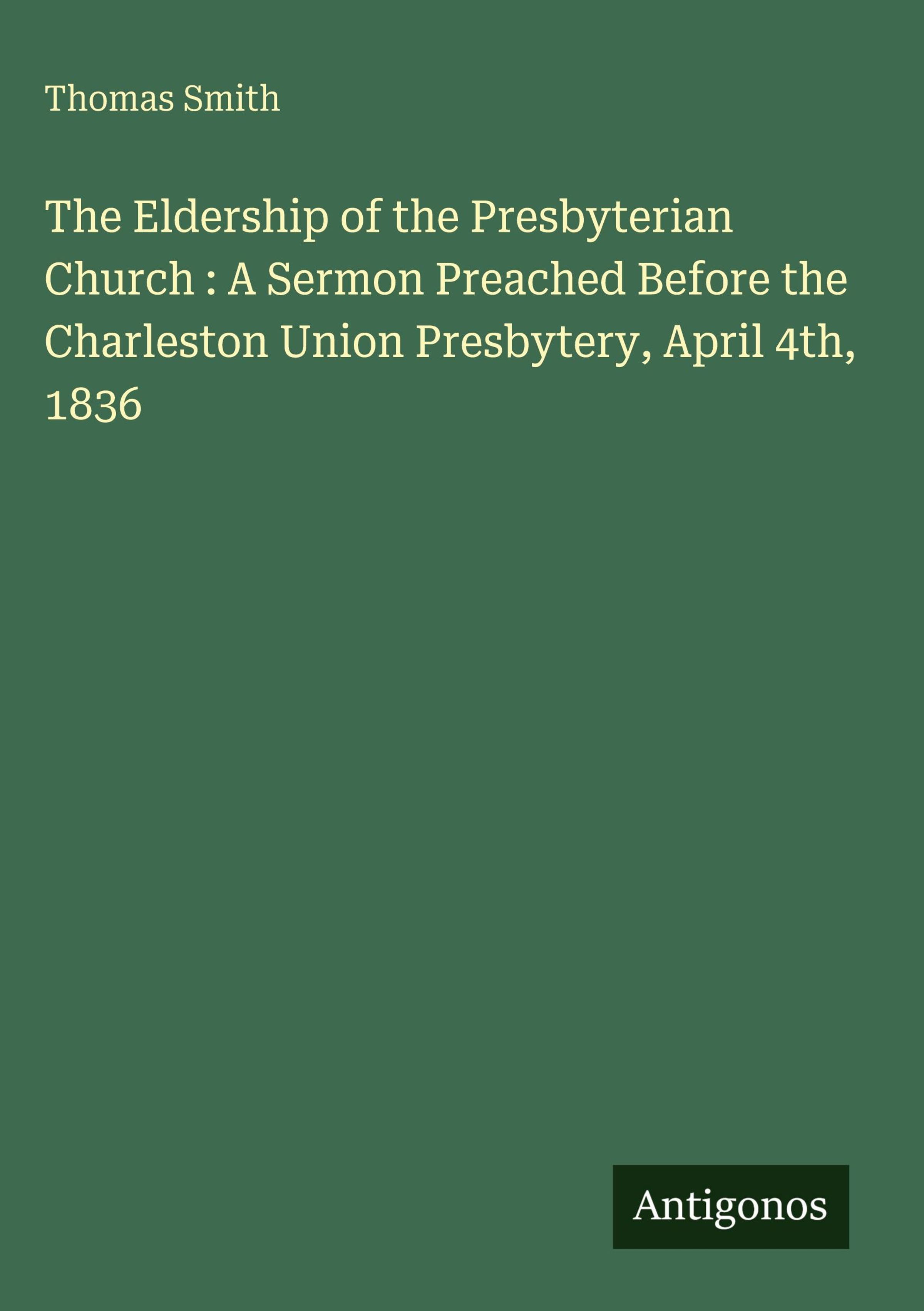 The Eldership of the Presbyterian Church : A Sermon Preached Before the Charleston Union Presbytery, April 4th, 1836