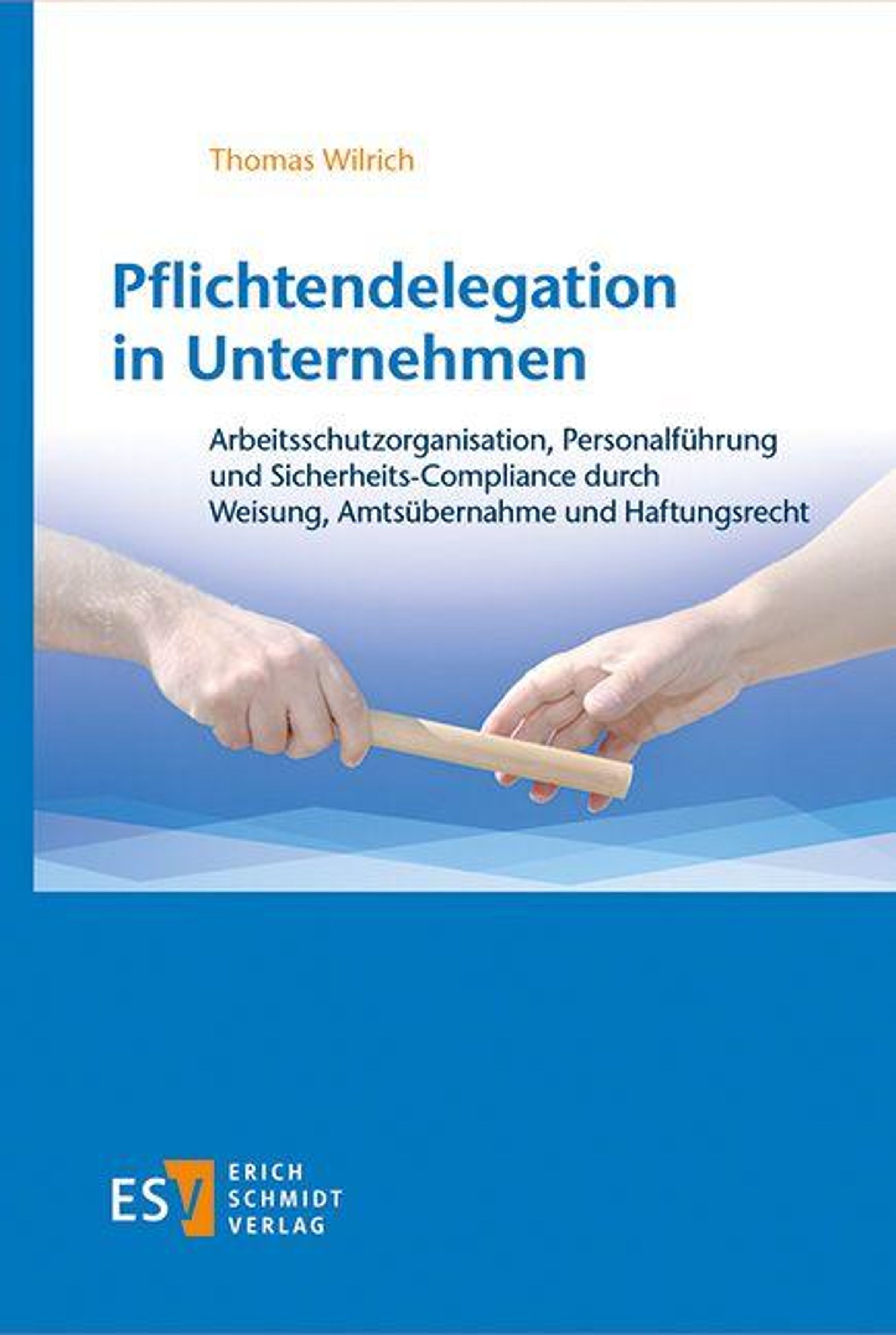 "Pflichtendelegation in Unternehmen" von Thomas Wilrich. Zwei Hände übergeben einen Stab. ESV Logo unten links., Buch