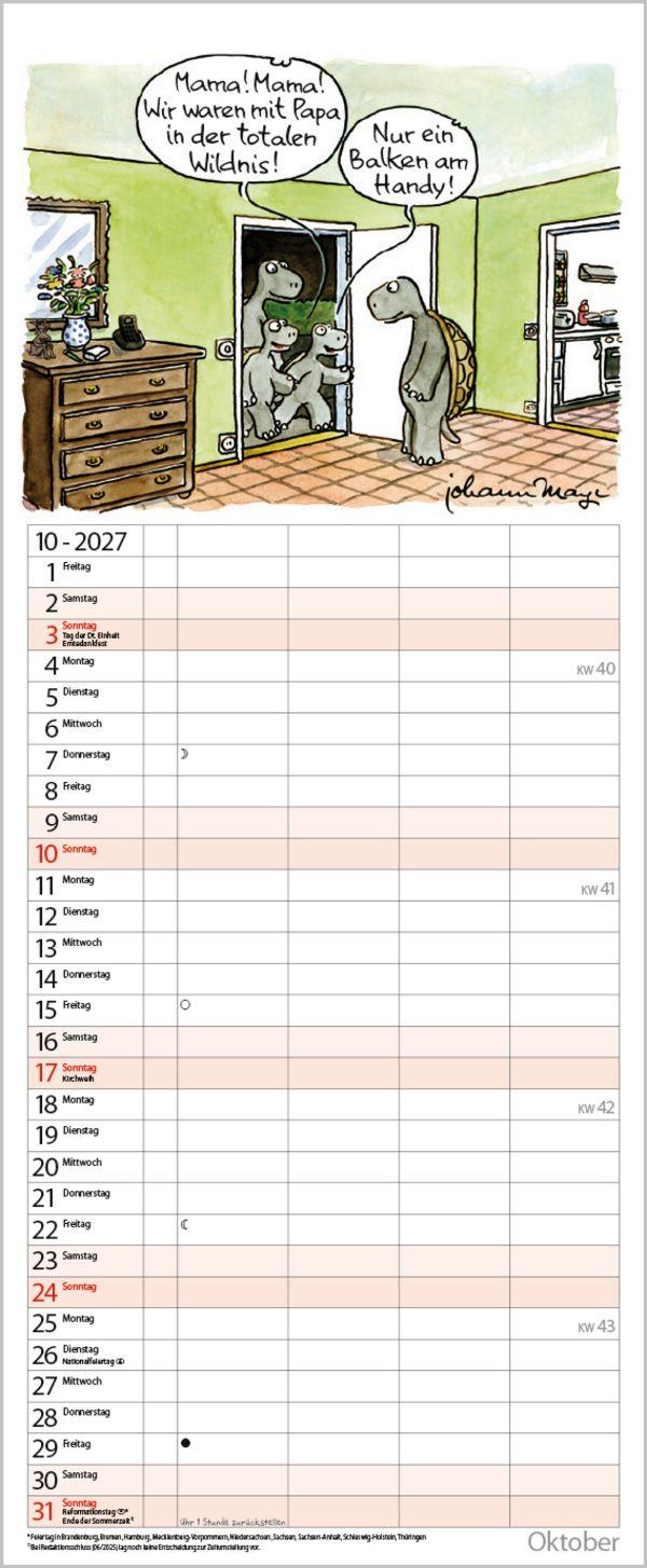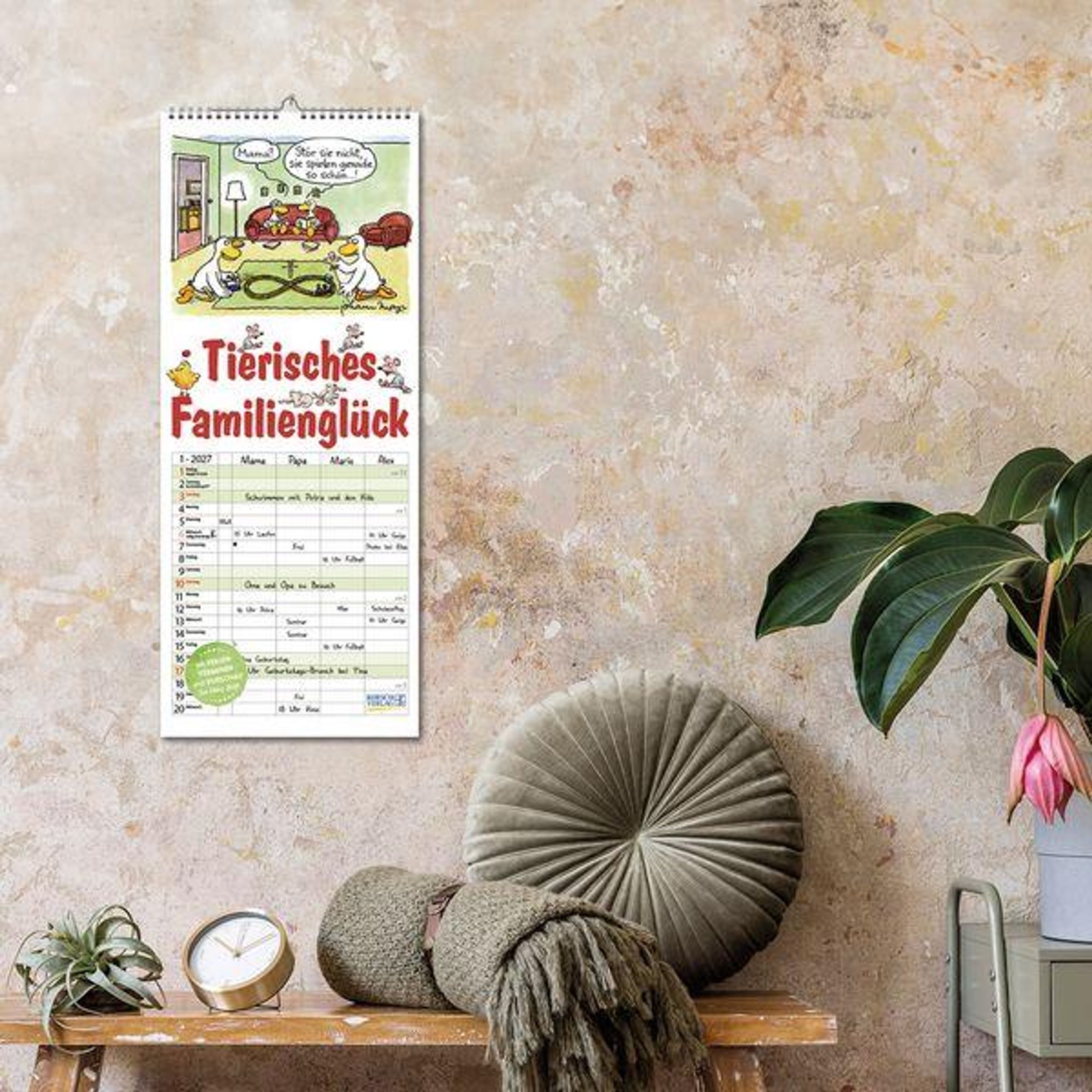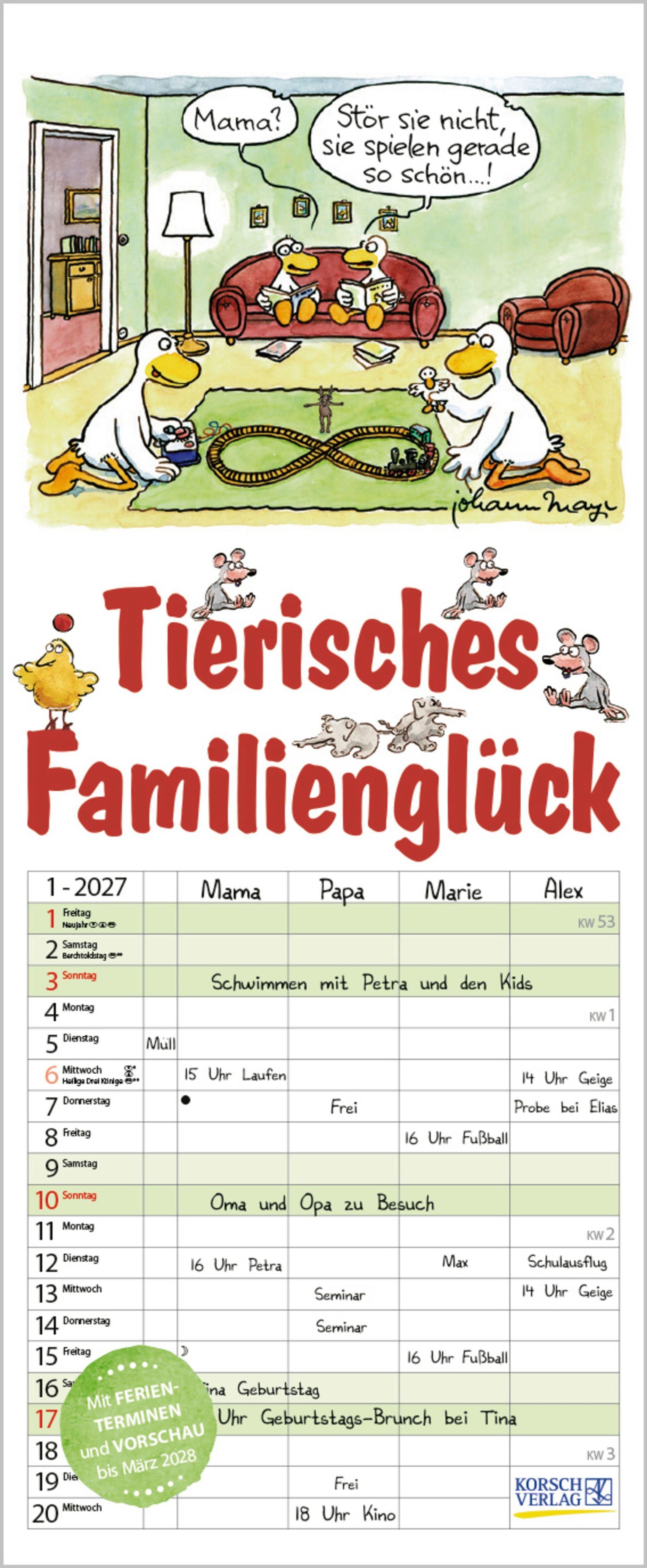 - Familienplaner - 4 große Spalten mit viel Platz. Familienkalender mit Tier-Comics, Ferienterminen und Vorschau bis März 2027. 19 x 46 cm.