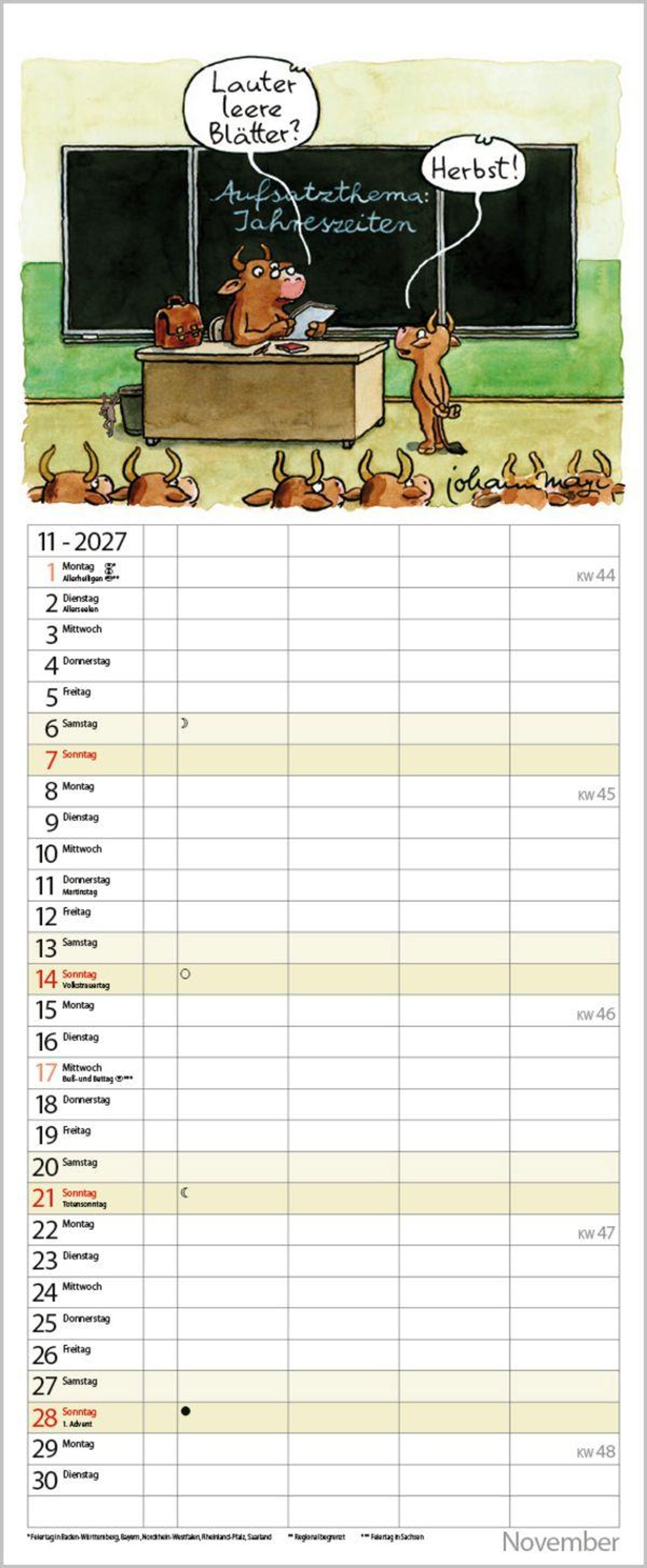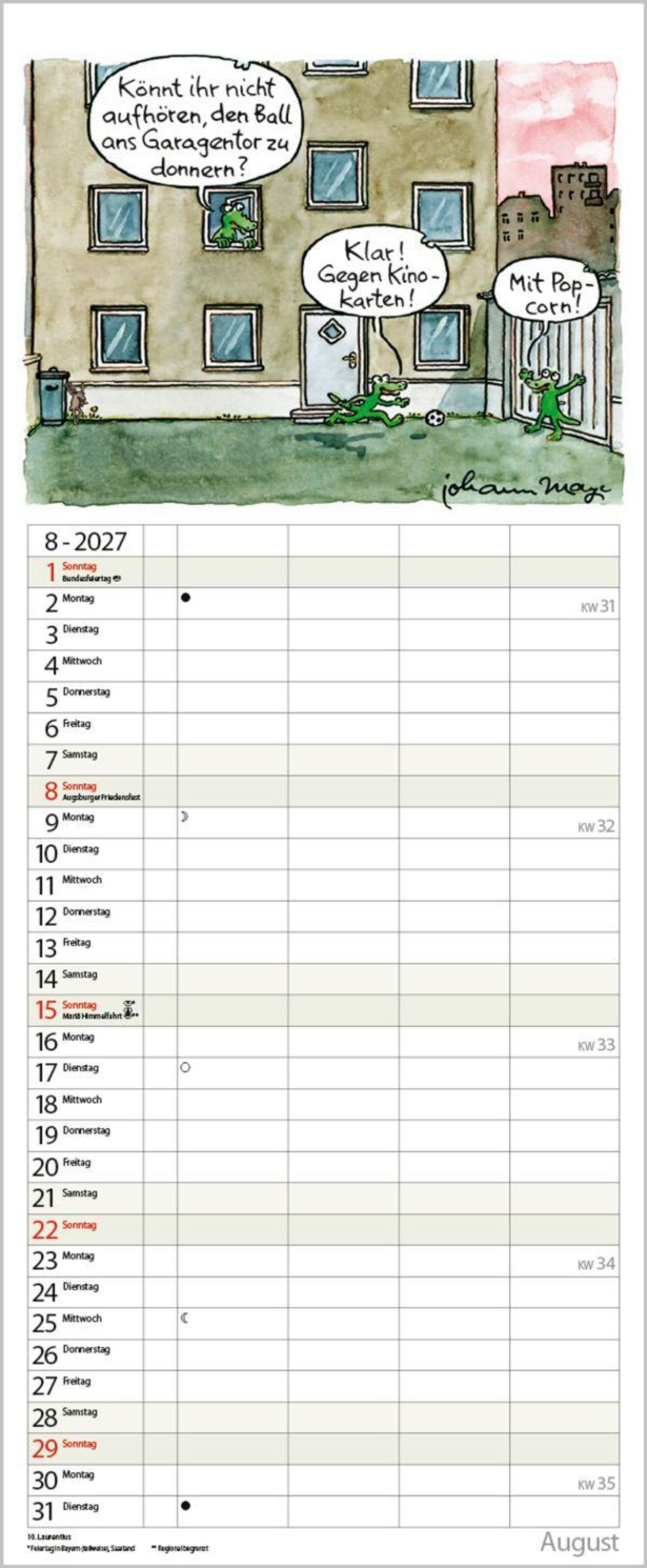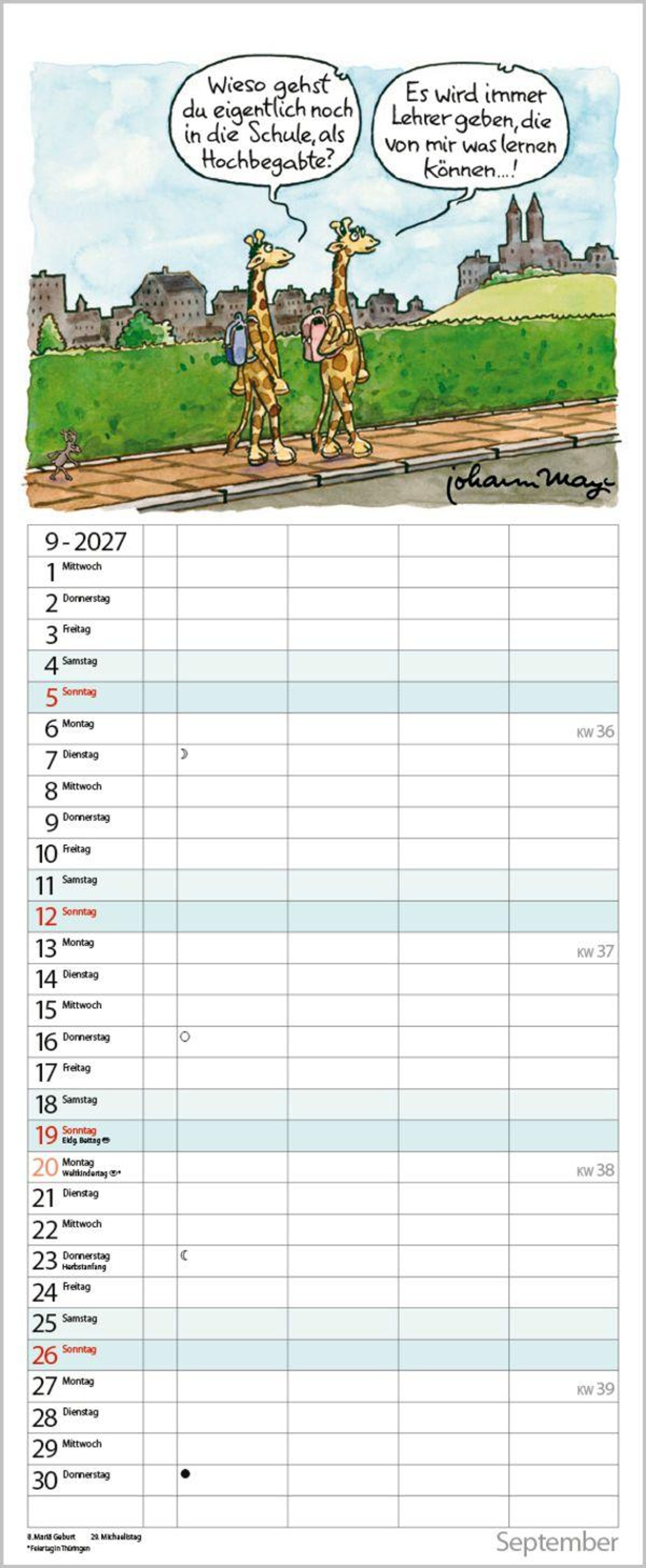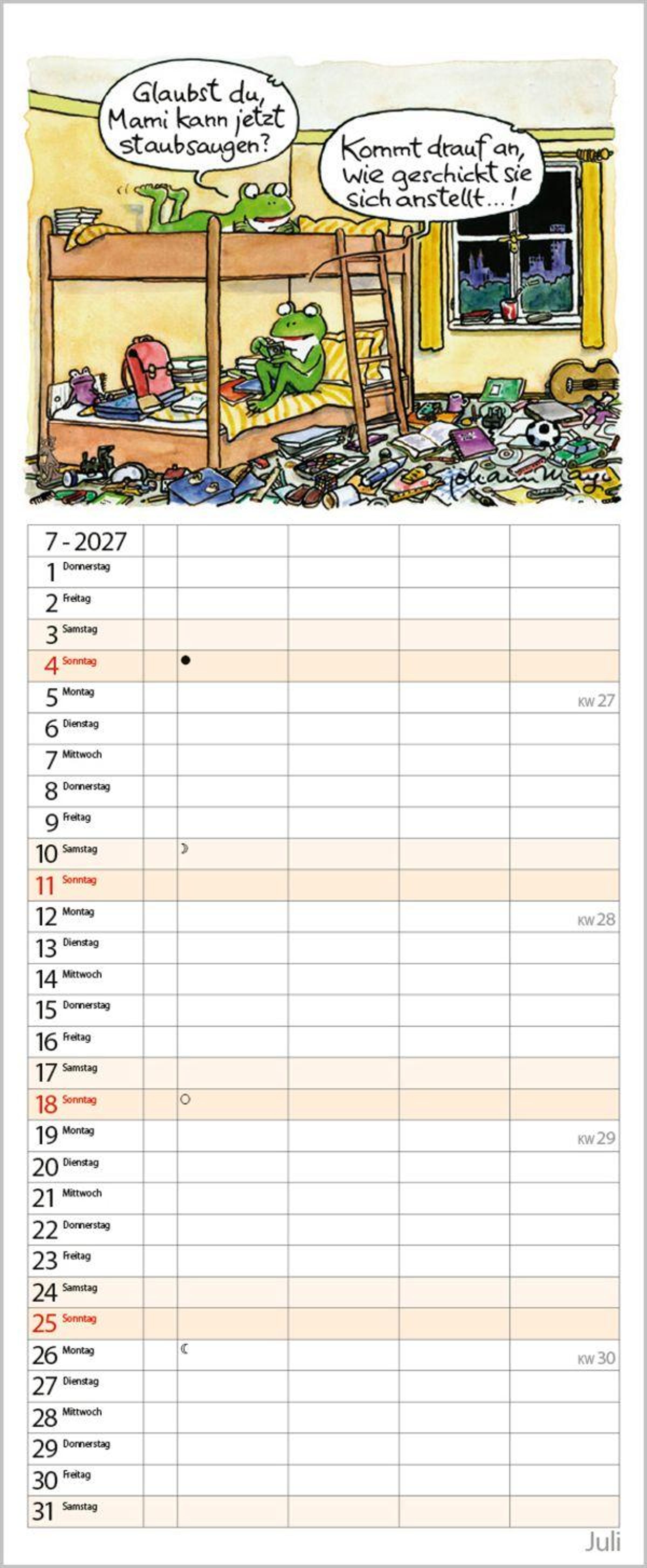 - Familienplaner - 4 große Spalten mit viel Platz. Familienkalender mit Tier-Comics, Ferienterminen und Vorschau bis März 2027. 19 x 46 cm.