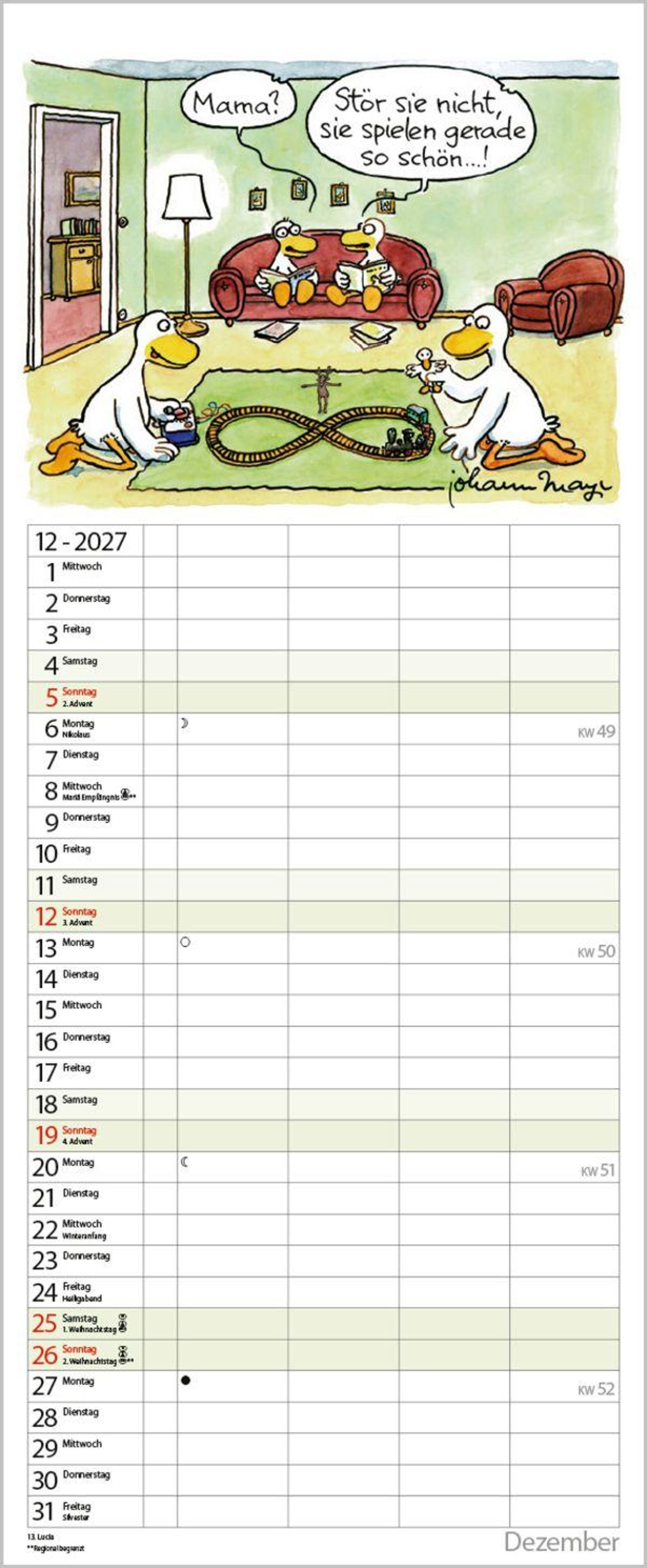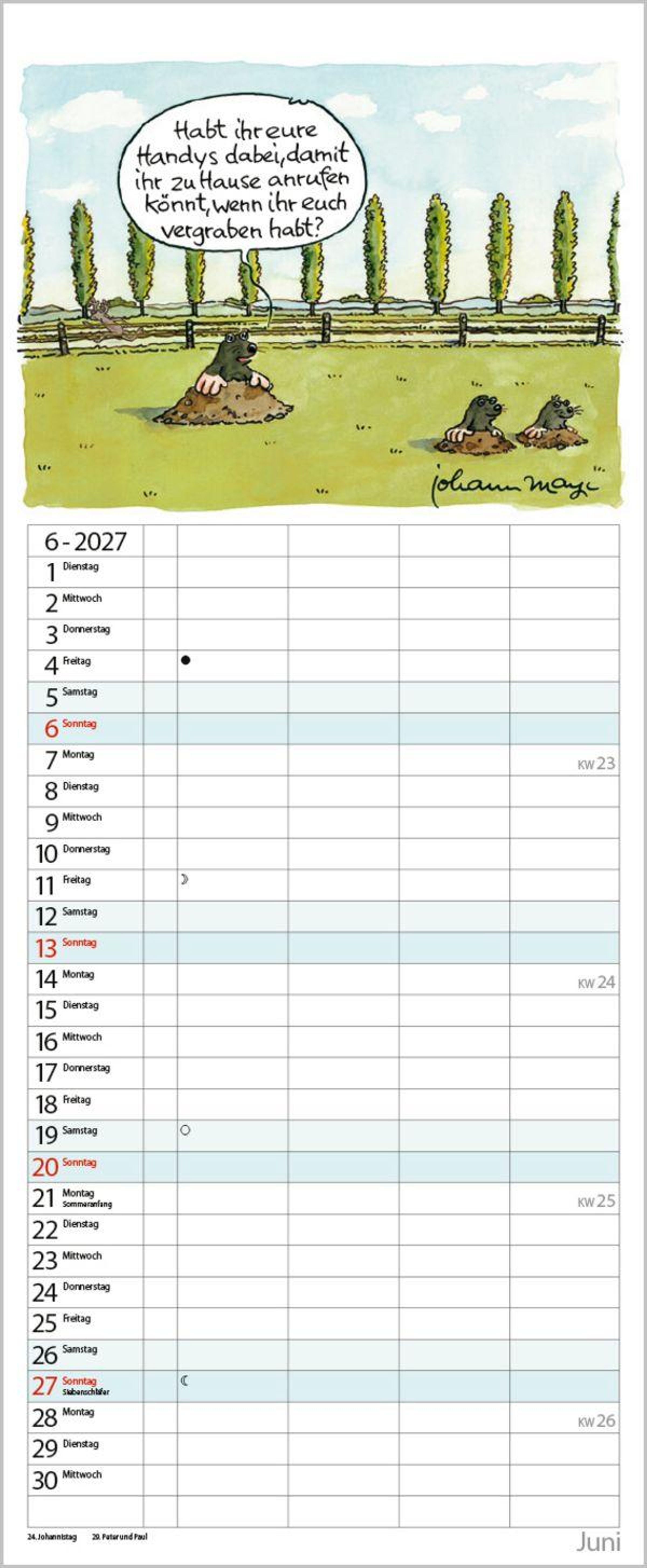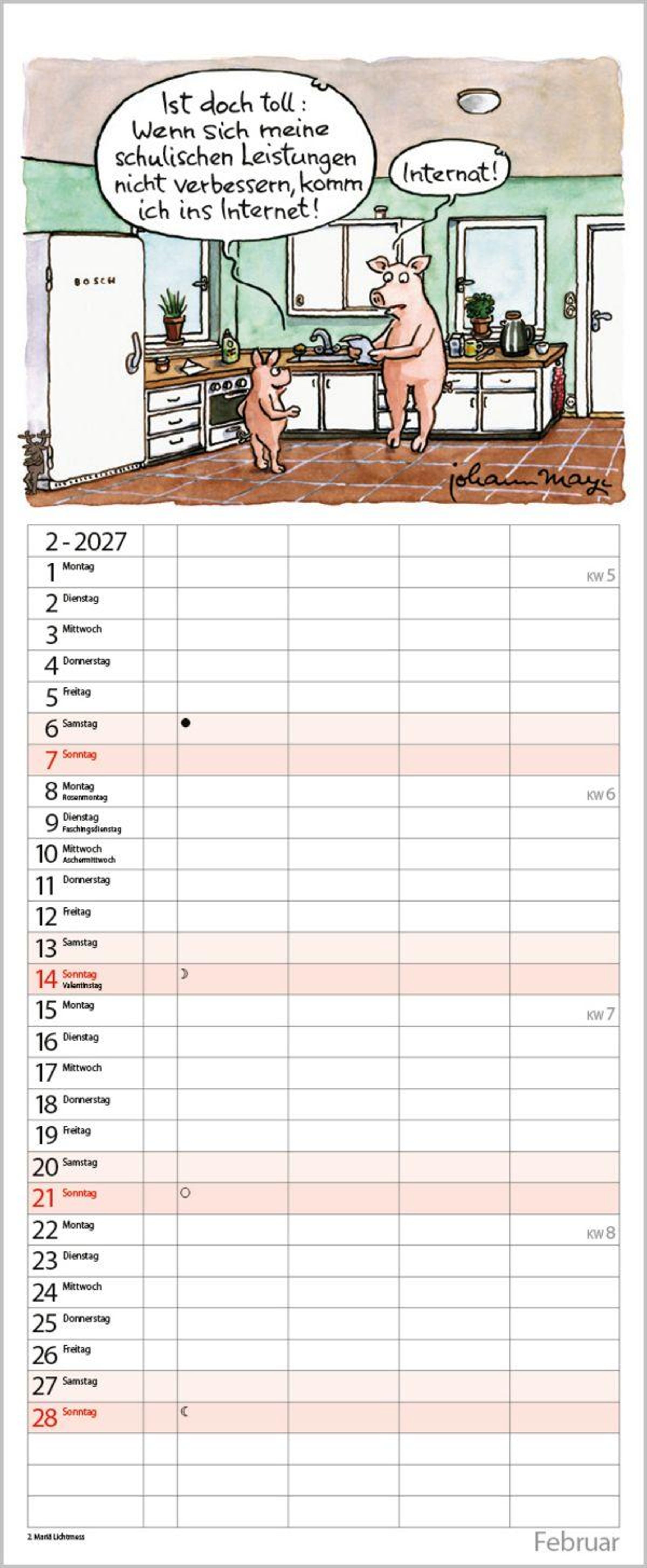 Praktischer Timer mit 4 Spalten und witzigen Familiencartoons von Johann Mayr. Neben dem gesamten Kalenderjahr enthält der Wandplaner auch eine Vorschau bis März des Folgejahres.