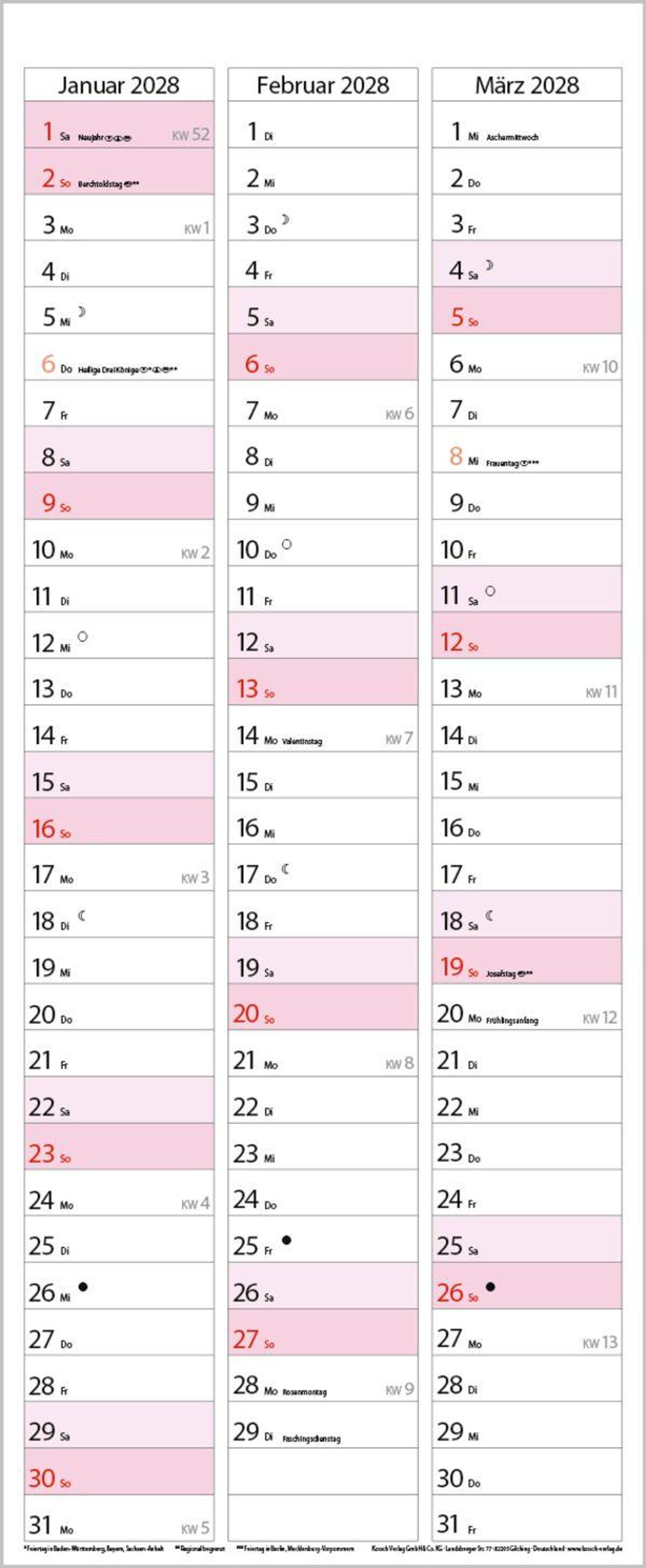 Weitere Informationen wie Mondphasen , Ferientermine und Feiertage (auch regionale) sowie deutlich lesbare Kalenderwochen runden den Kalender ab und sorgen für einen vollständigen Überblick Ihres Jahres.