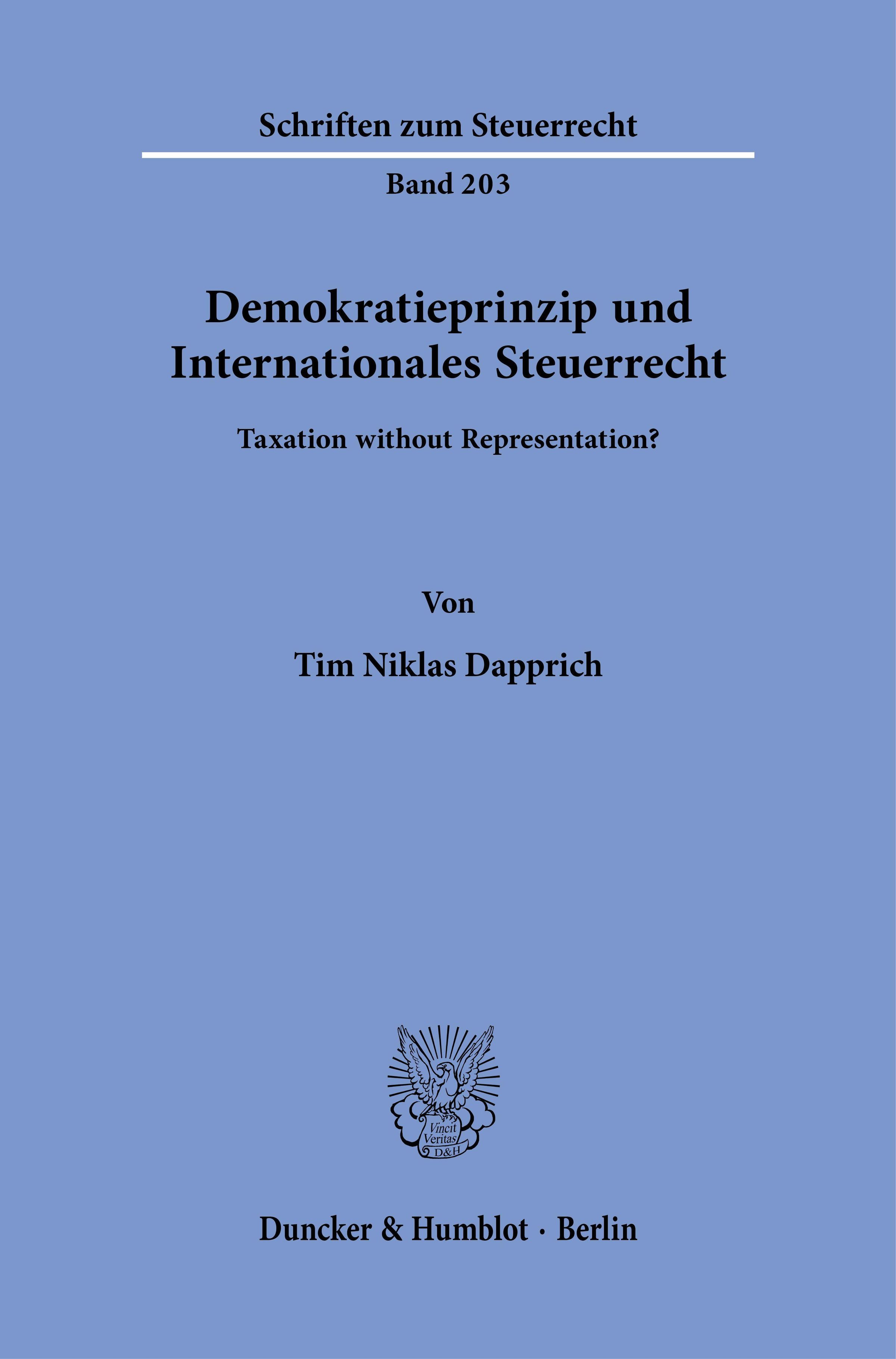 'The Principle of Democracy and International Tax Law. Taxation without Representation?': International tax law faces challenges with respect to the legitimation and representation requirements of the German constitutional principle of democracy. Based on the close connection between taxation and democracy, this work highlights deficits in the internal and external system of international tax law in the realization of the principle of democracy and develops approaches to mitigate them.
