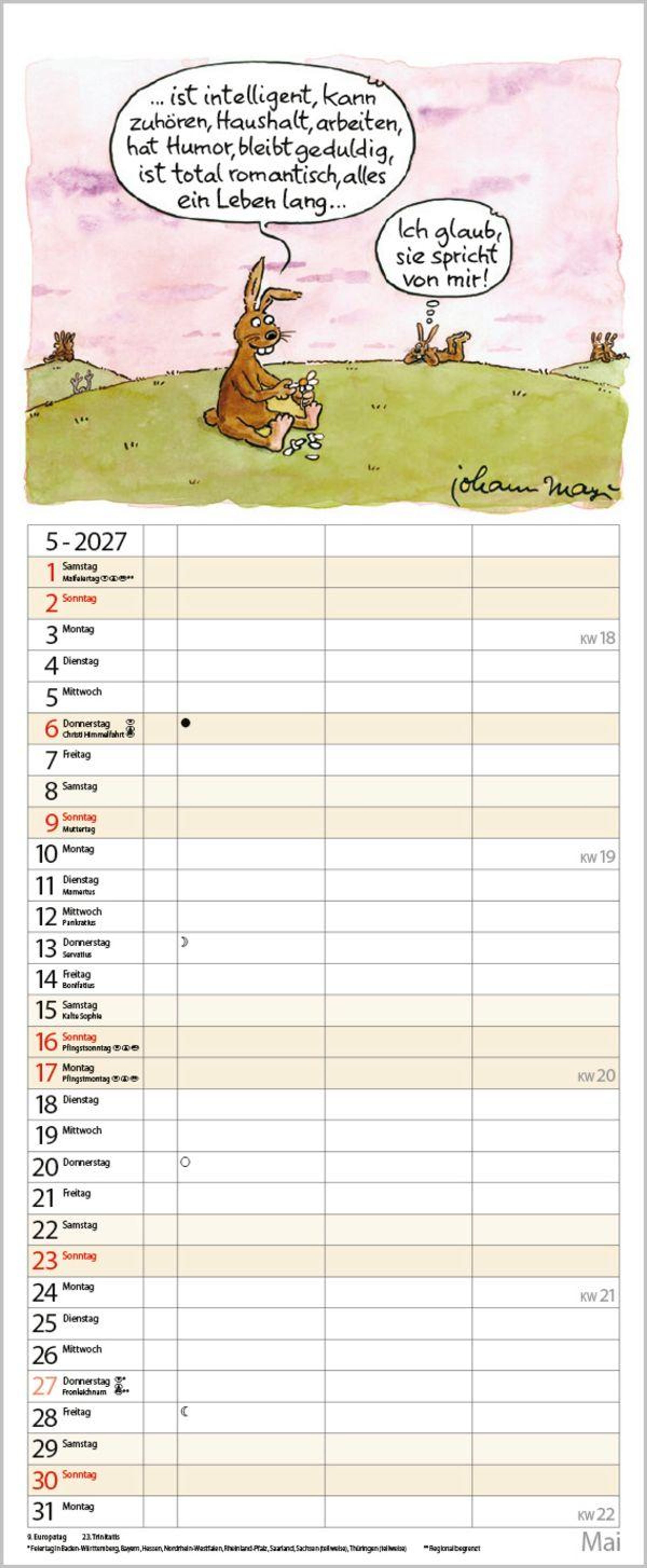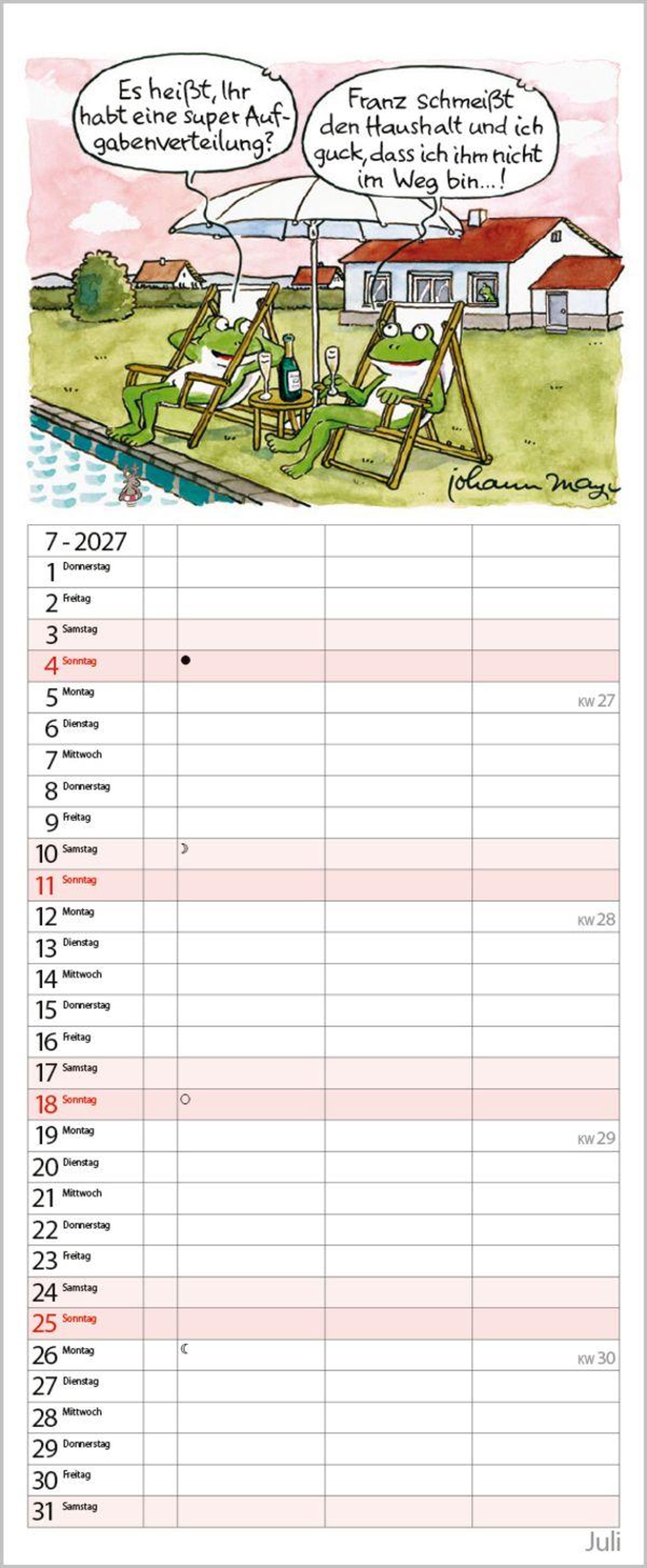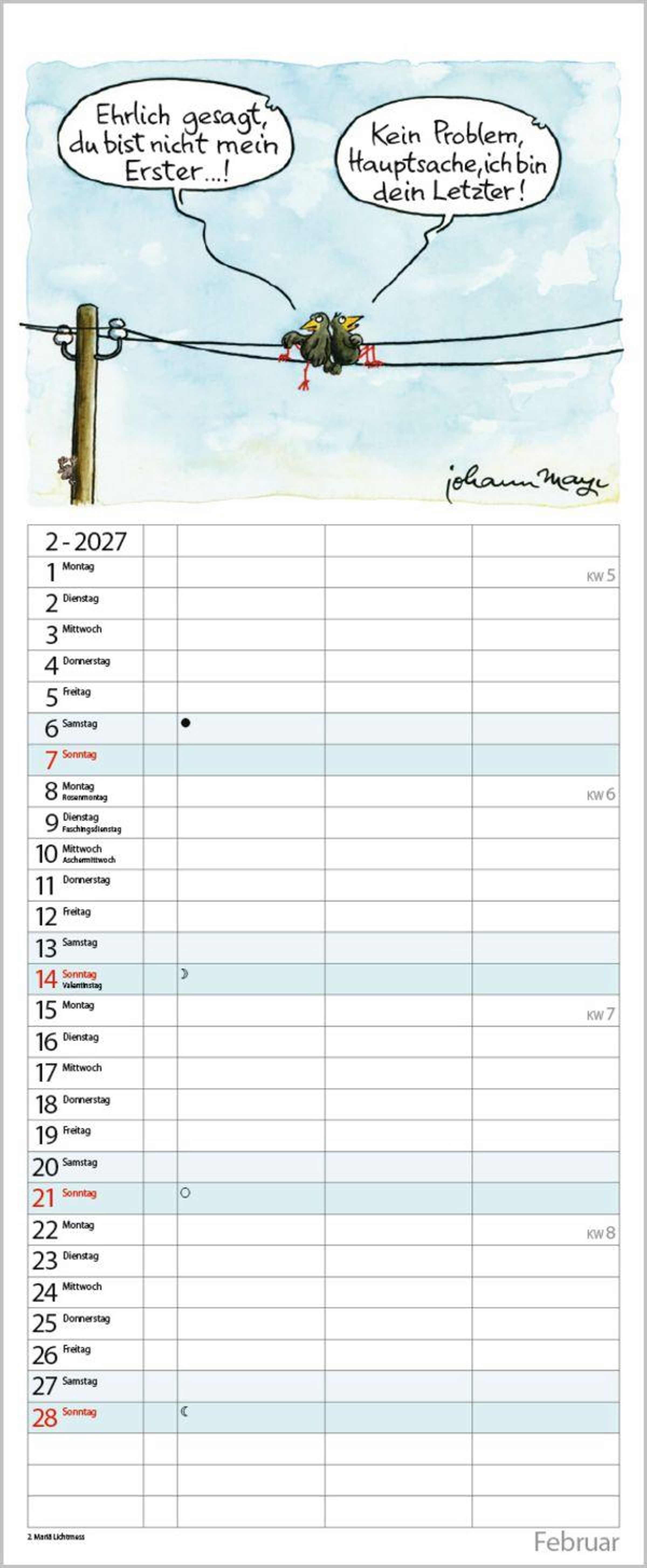 Die witzigen Paarszenen von Johann Mayr begleiten mit viel Charme durch das Jahr. Neben dem gesamten Kalenderjahr enthält der Wandplaner auch eine Vorschau bis März des Folgejahres.