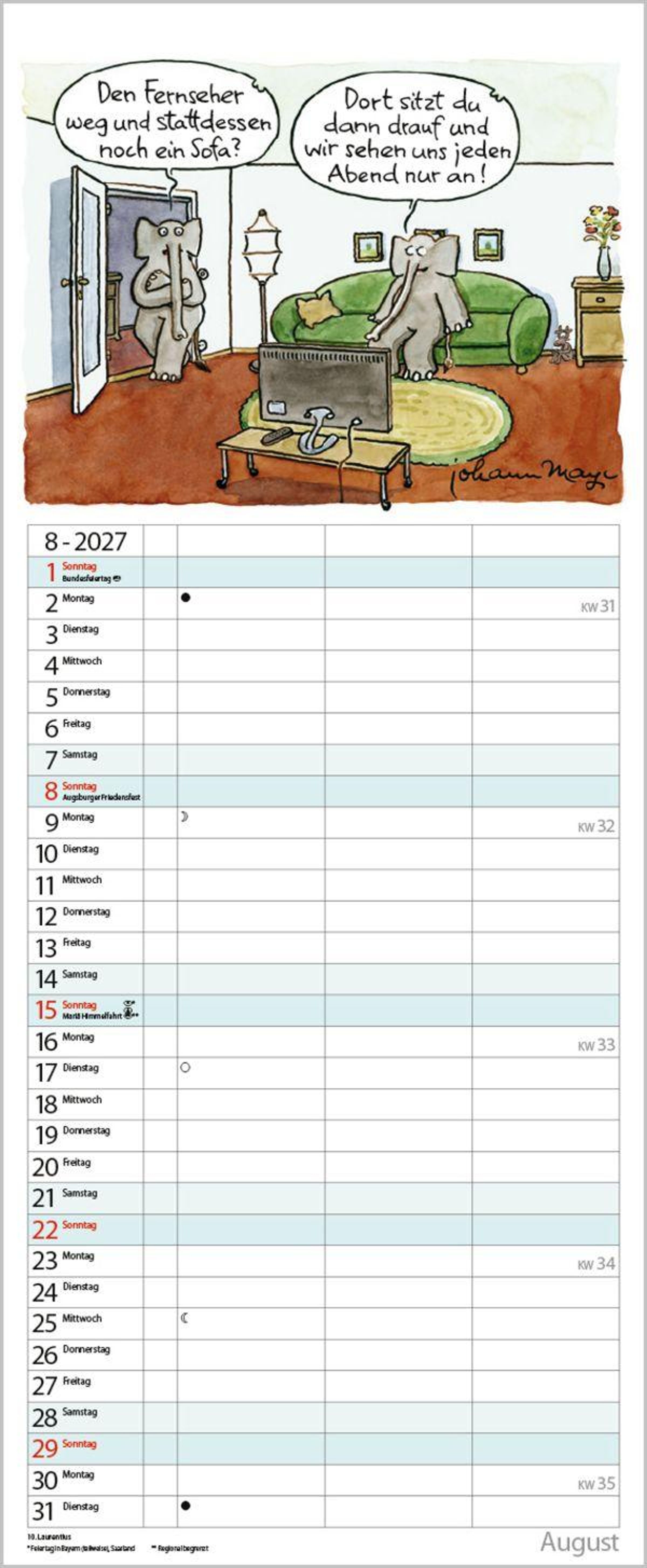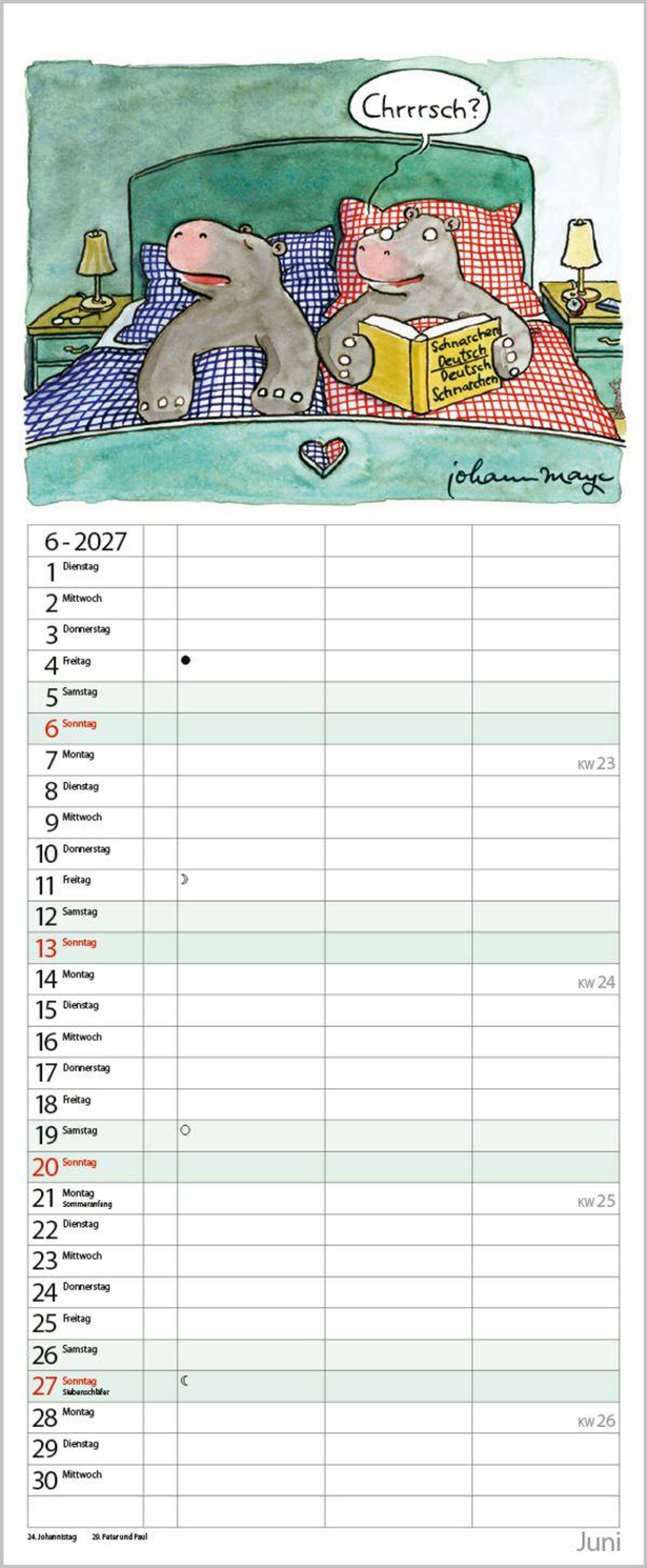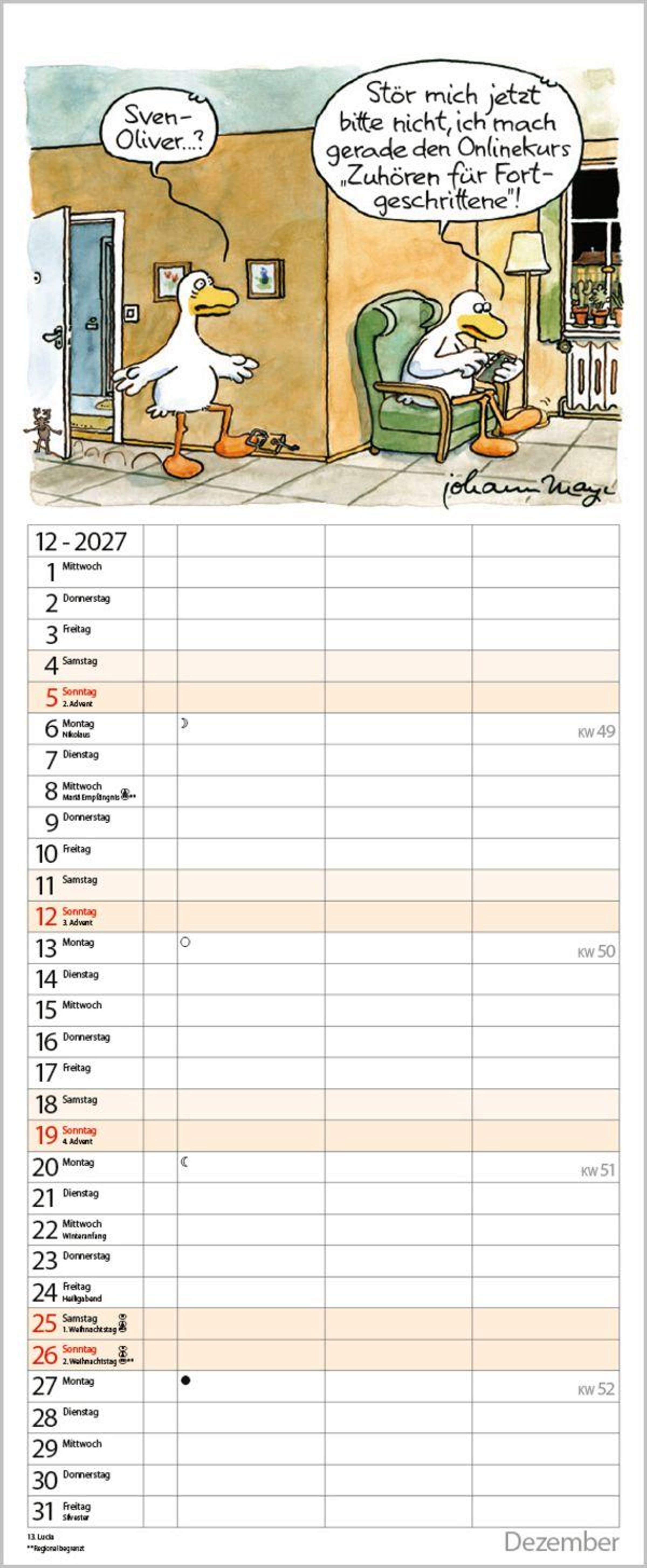 Die witzigen Paarszenen von Johann Mayr begleiten mit viel Charme durch das Jahr. Neben dem gesamten Kalenderjahr enthält der Wandplaner auch eine Vorschau bis März des Folgejahres.