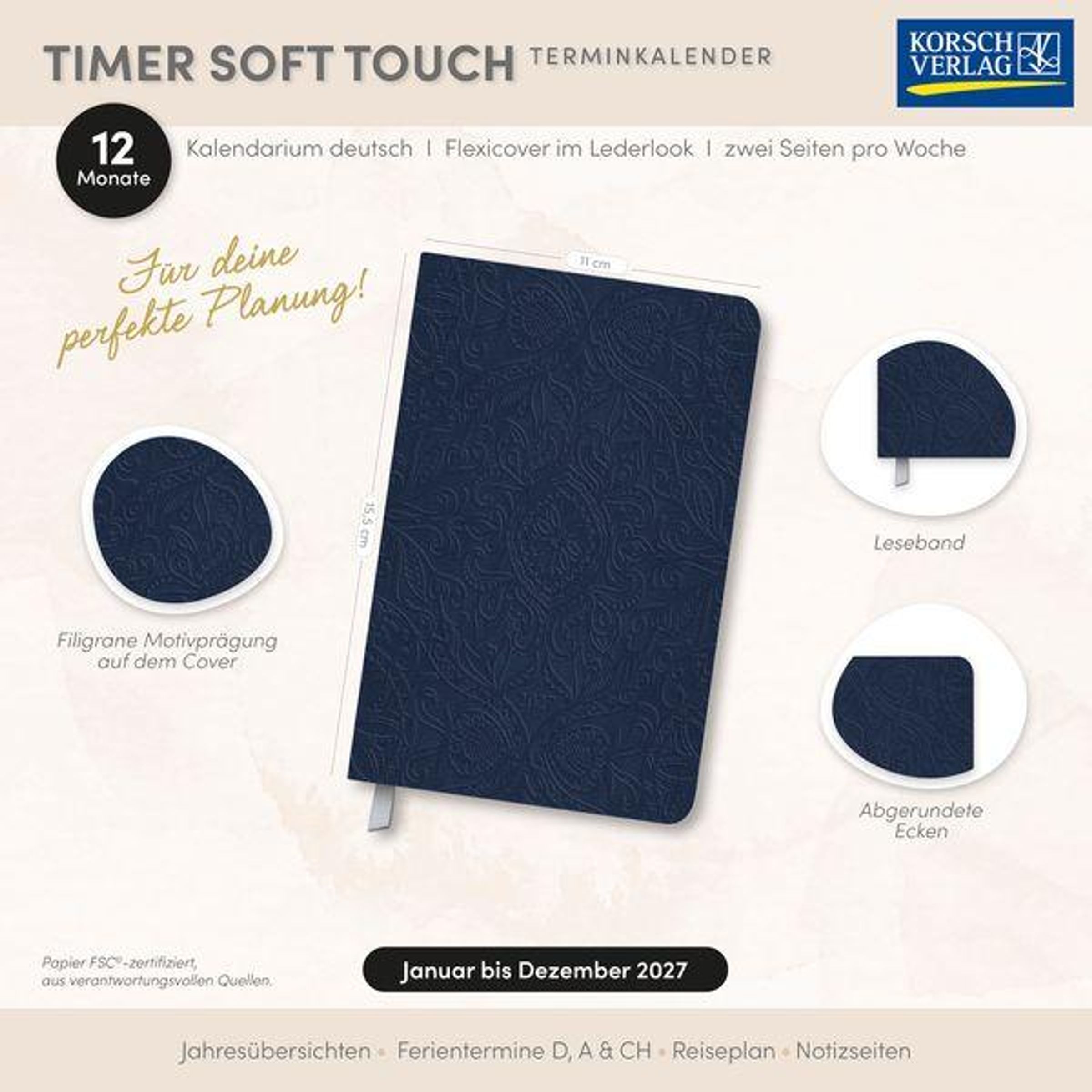 Dieser trendige Timer sieht nicht nur gut aus, er fühlt sich auch gut an. Sein weicher Einband im Lederlook mit filigraner Motivprägung verführt dazu, den Kalender nicht mehr aus der Hand legen zu wollen. Ein 12-monatiges, deutschsprachiges Kalendarium, 128 Seiten, pro Woche 2 Seiten mit viel Platz für Notizen und Leseband runden diesen hochwertigen Taschenkalender ab.