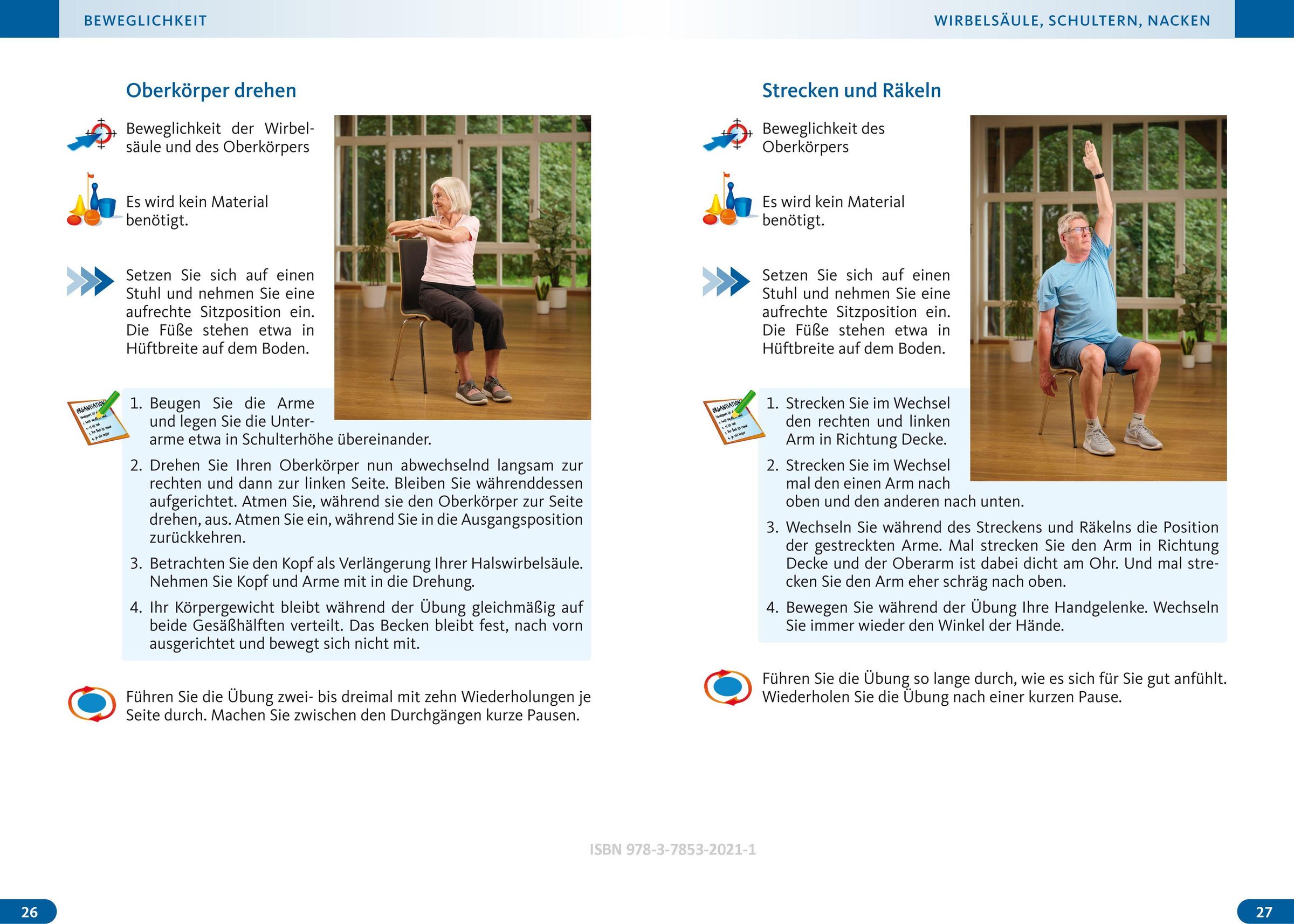 Fitness und eine kräftige Muskulatur sind Grundvoraussetzungen dafür, sich bis ins hohe Alter Selbstständigkeit und Mobilität bewahren zu können. Regelmäßige Übungen zur Förderung von Kraft- und Bewegungsfähigkeit sind somit wichtige Faktoren, um die Lebensqualität allgemein zu verbessern. Wie dies alleine und mit einfachen Mitteln in den eigenen vier Wänden erreicht werden kann, zeigt dieses Buch, denn es stellt über 80 abwechslungsreiche und effiziente Übungen vor, für die lediglich ein Stuhl oder andere, in jedem Haushalt verfügbare Gegenstände benötigt werden. Alle Beispiele sind speziell auf Menschen im fortgeschrittenen Alter zugeschnitten, insbesondere auch solche, denen aufgrund vorhandener Einschränkungen eine Teilnahme an Gruppenübungen oder der Besuch eines Fitnessstudios nicht möglich ist.