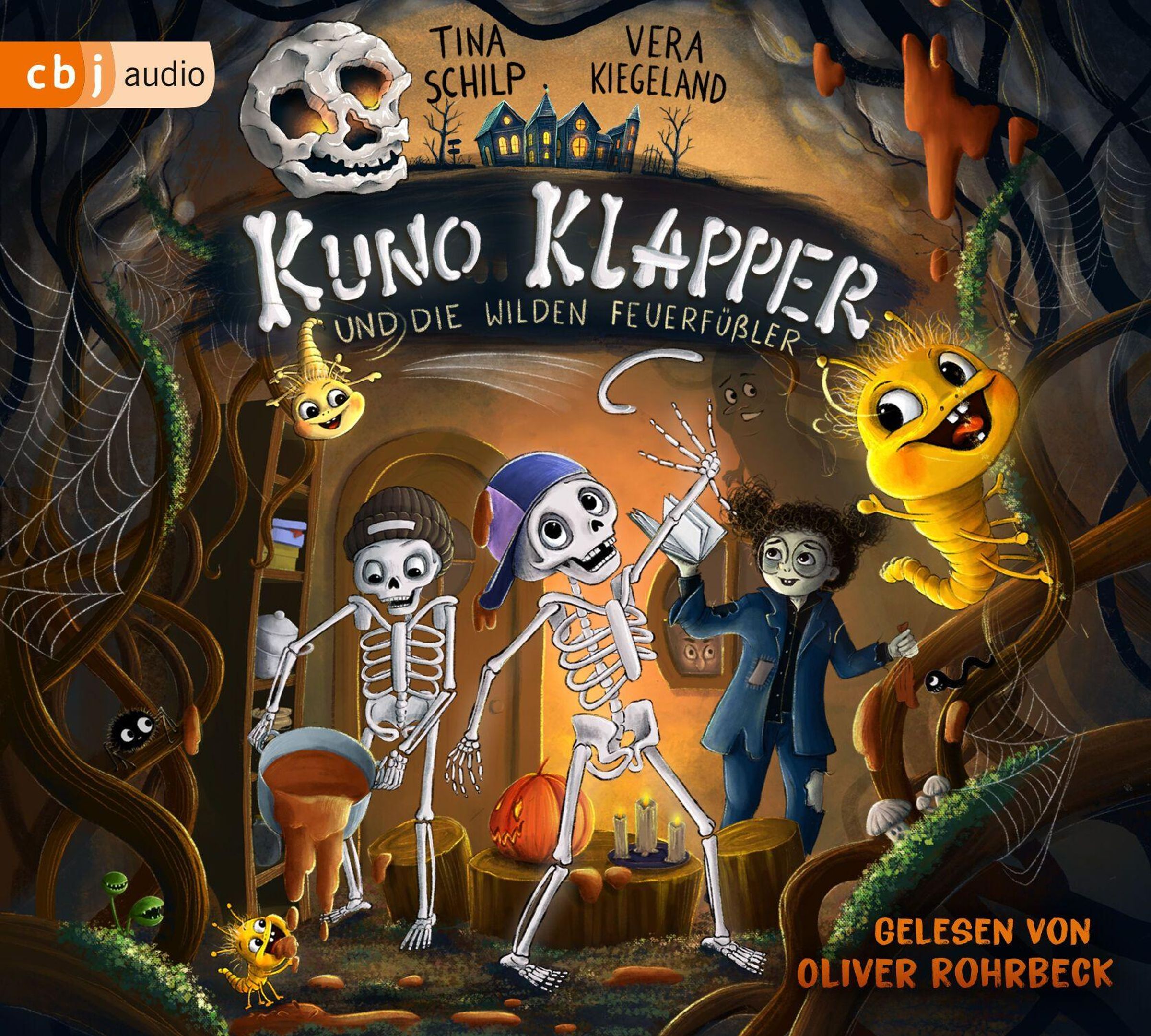 „Kuno Klapper und die wilden Feuerfüßler“, Illustration: Zwei Skelette, ein Junge und ein gelbes Wesen in einer Höhle., 2 CDs