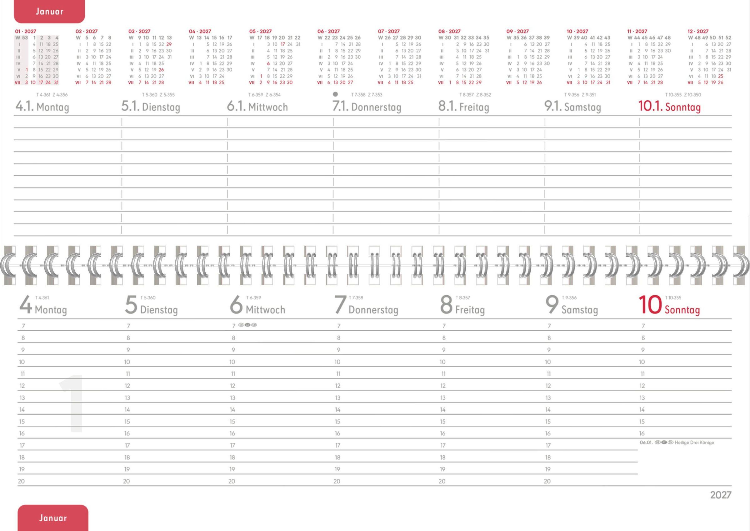 Übersichtliches Kalendarium: 1 Woche auf 2 Seiten -- obere Seite mit Notizfläche & Jahresübersicht, untere Seite mit Zeiteinteilung von 8--21 Uhr