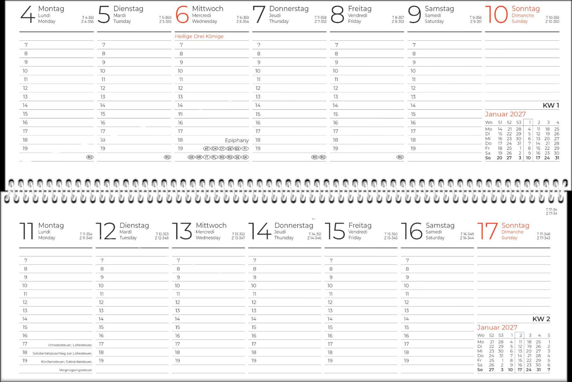 Der Tischkalender Classic blue 2027 von Zettler ist der ideale Tischquerkalender für alle, die ihre Woche klar und unkompliziert planen möchten. Im schlichten, professionellen Design bietet jede Seite eine komplette Woche -- übersichtlich strukturiert und mit ausreichend Raum für kurze Eintragungen. Praktische Zusatzinformationen machen den Kalender besonders alltagstauglich: Neben Feiertagen findest du auch Steuertermine sowie eine Tages-, Wochen- und Zinstagezählung -- perfekt fürs Büro oder Homeoffice.