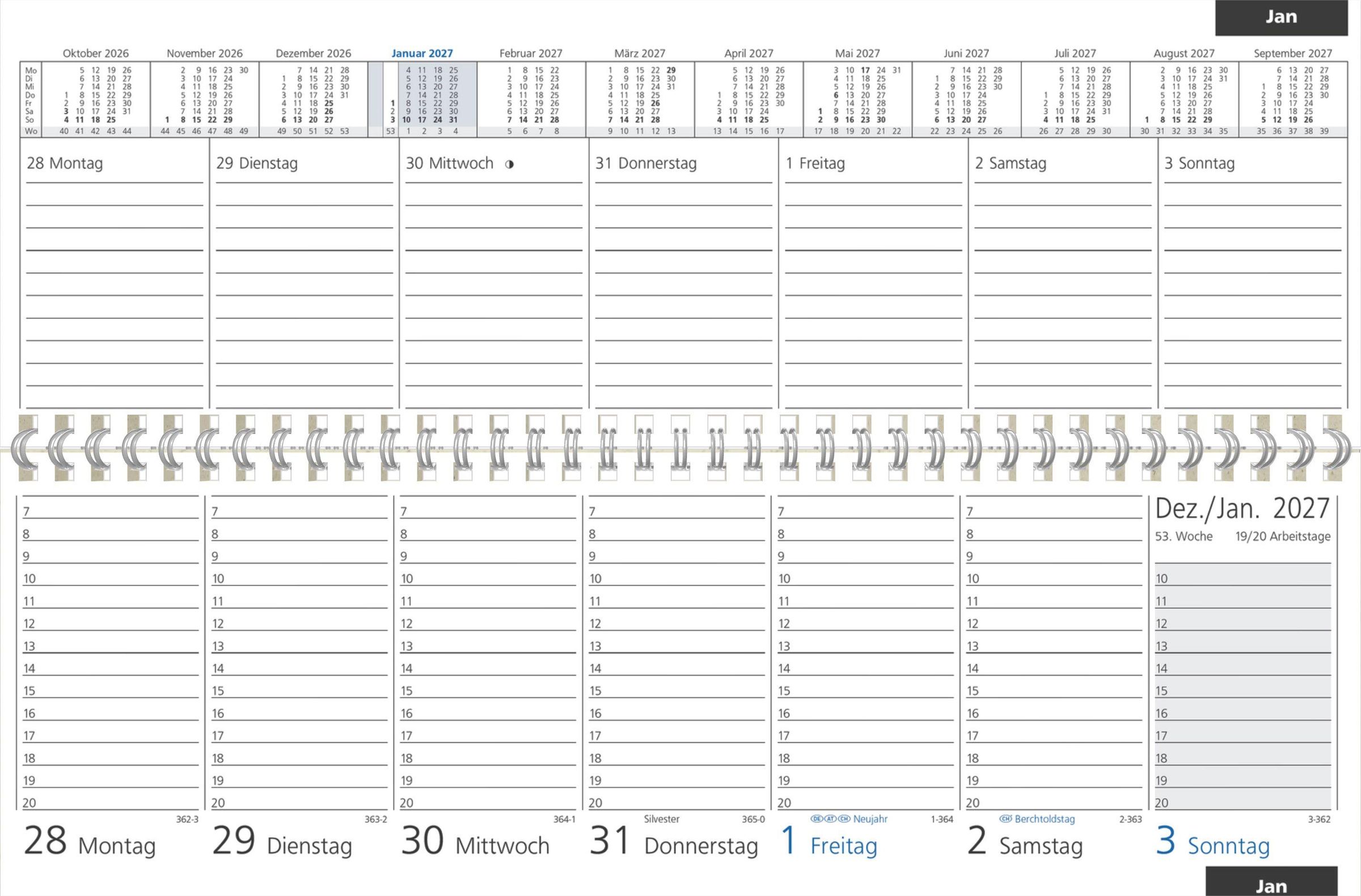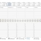 Übersichtliche Struktur: 1 Woche auf 2 Seiten, mit hervorgehobenen Sonn- und Feiertagen sowie Monatsübersichten über den Wochentagen