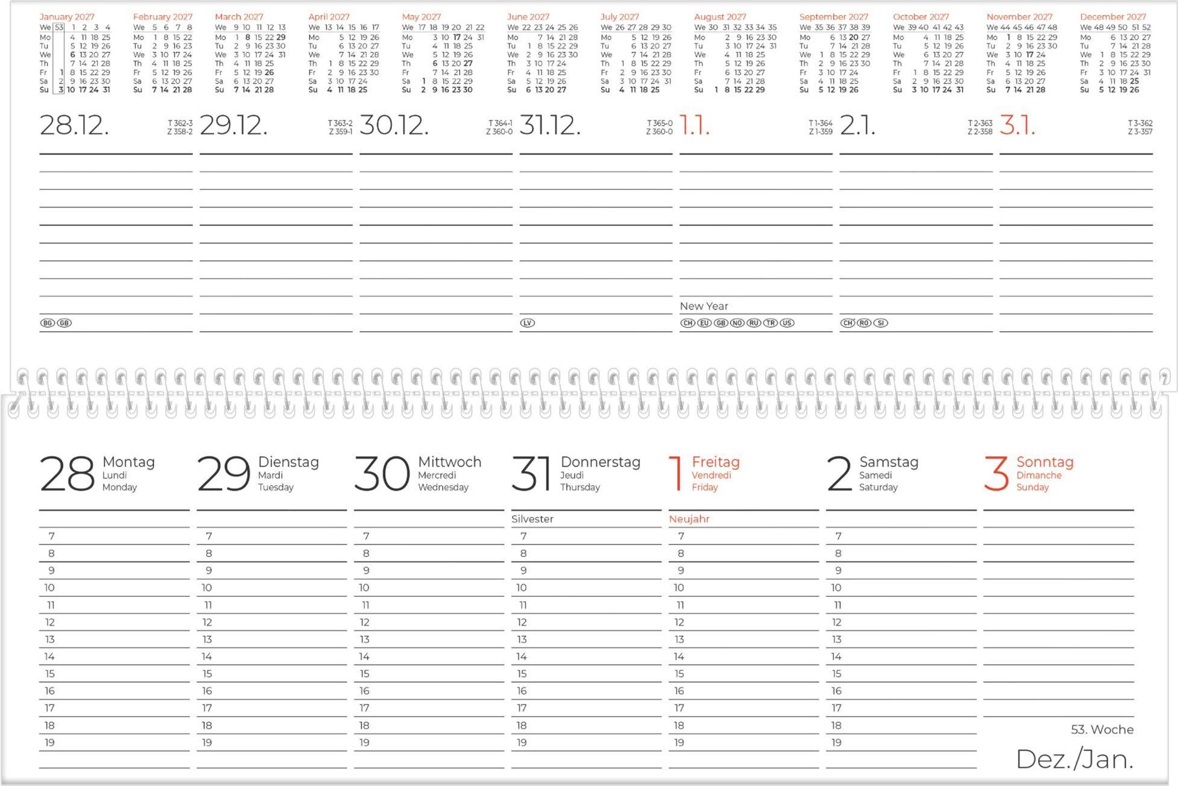 - Mehrsprachig: 3-sprachiges Kalendarium (DE/FR/GB) mit hervorgehobenen Sonn- & Feiertagen