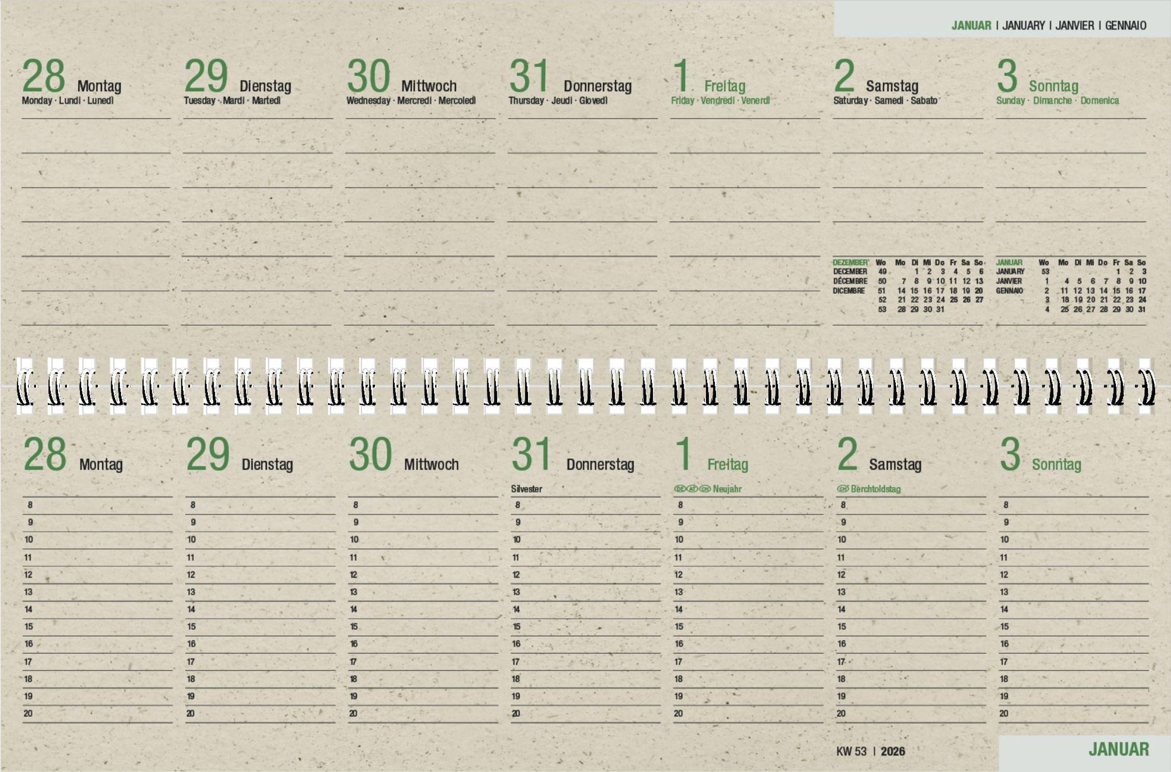 International einsetzbar: 4-sprachiges Kalendarium (DE/GB/FR/IT) -- perfekt für internationale Teams oder Reisen