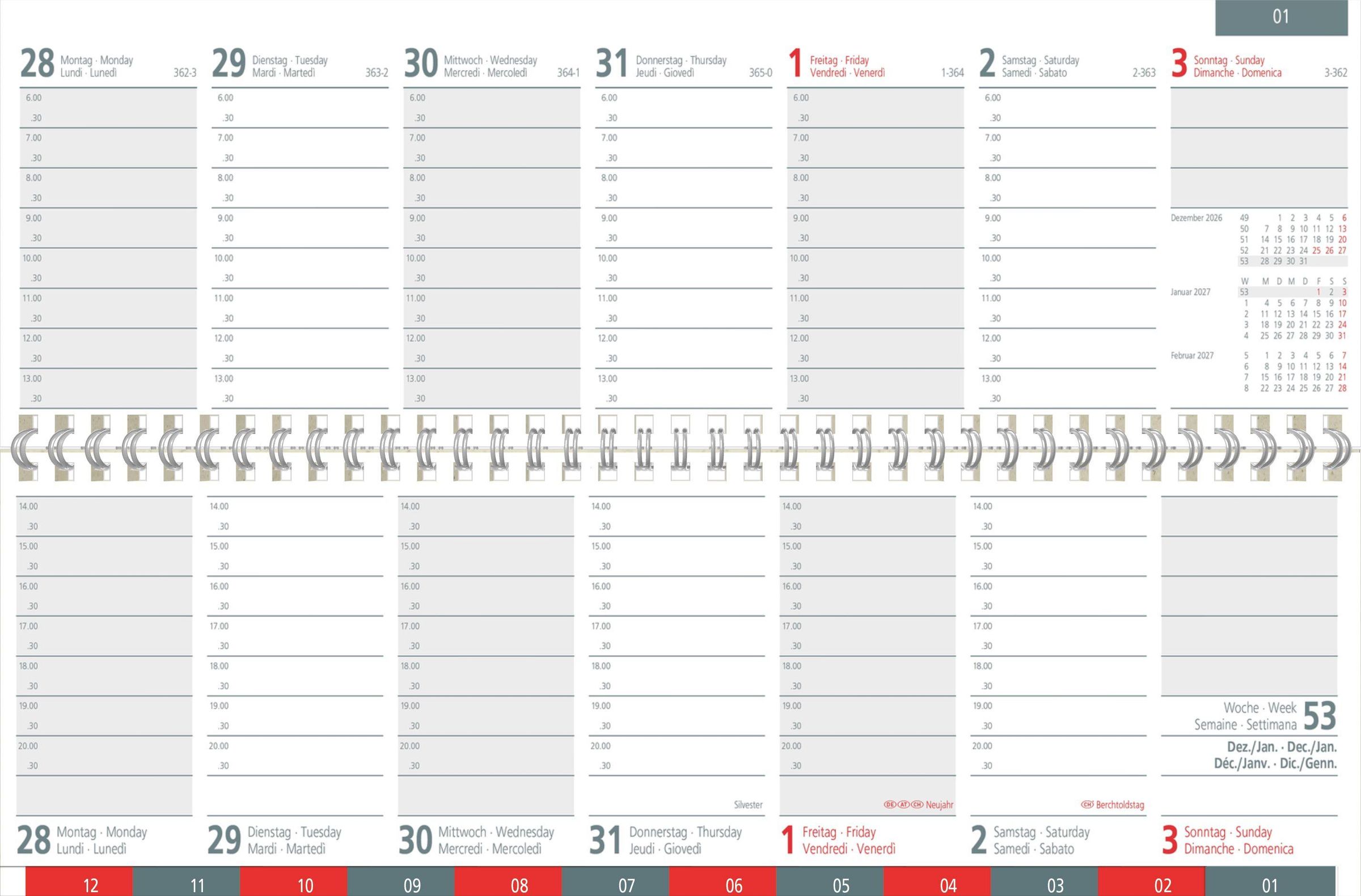 Übersichtliche Struktur: 1 Woche auf 2 Seiten, mit hervorgehobenen Sonn- und Feiertagen, Tages-, Wochen- und Zinstagezählung