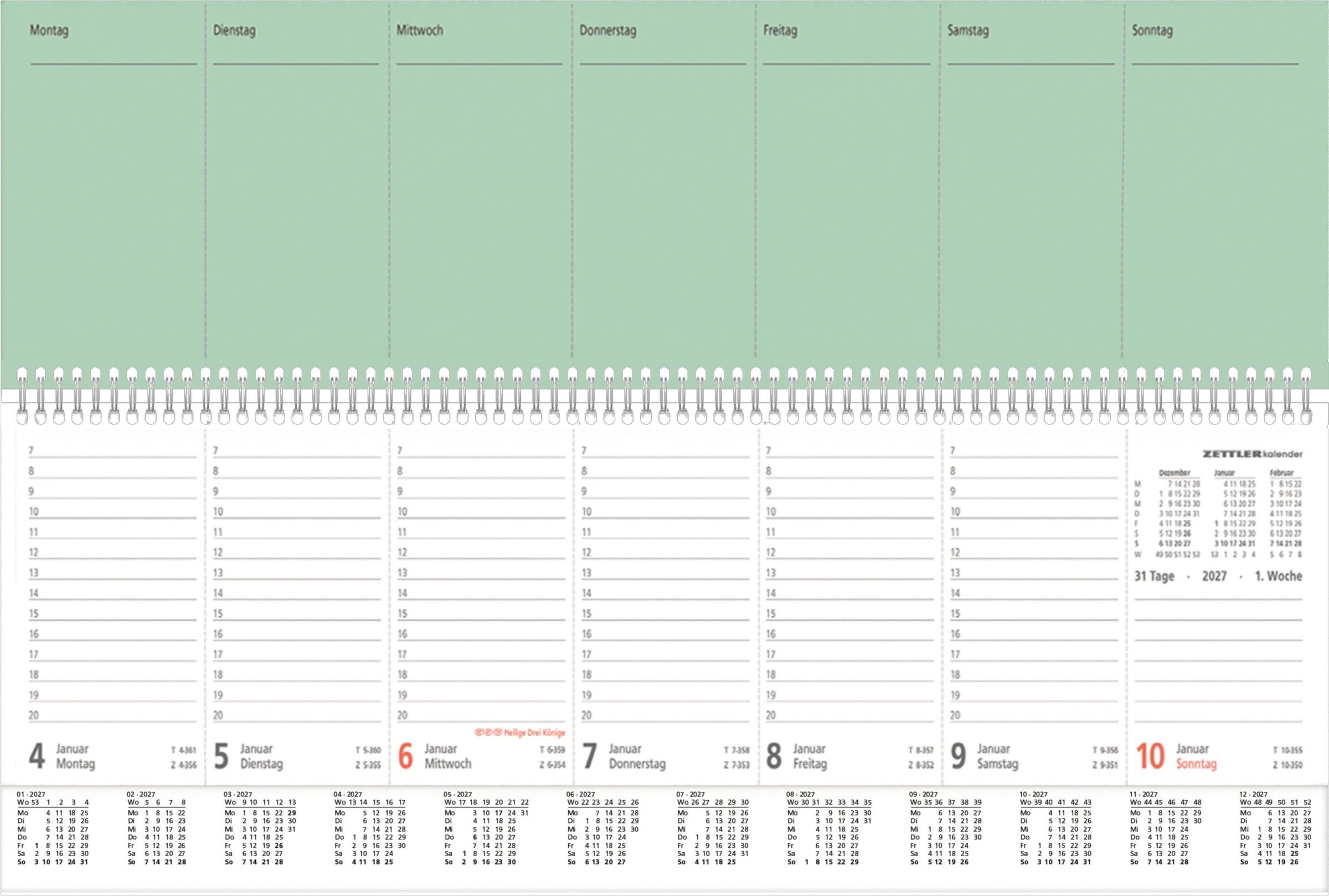 Übersichtliches Wochenlayout: 1 Woche auf 2 Seiten, mit hervorgehobenen Sonn- und Feiertagen, Wochenzählung und Dreimonatsübersicht