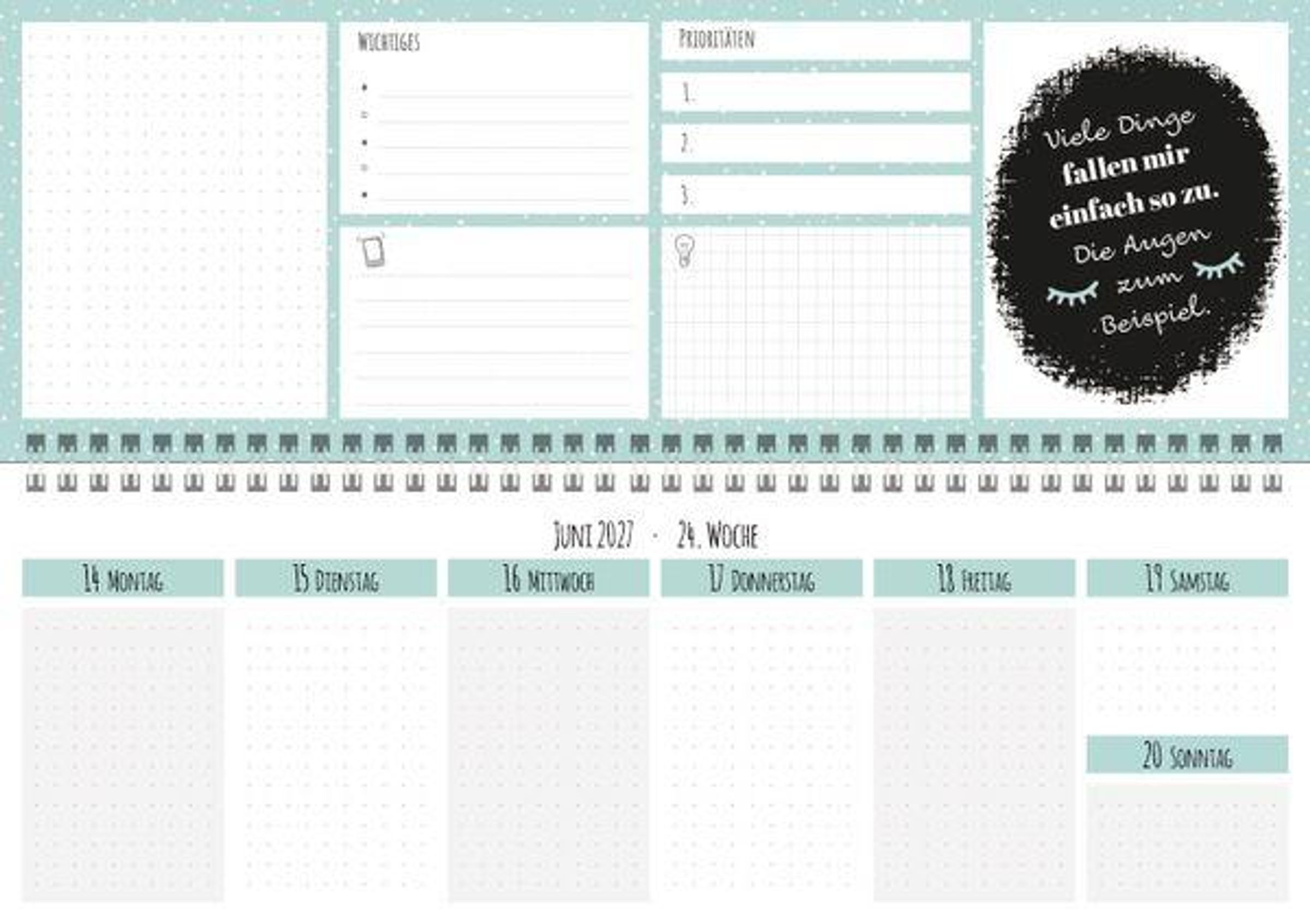 Jede Woche hält er auf 2 Seiten viel Platz für deine tägliche Terminplanung bereit: Listen für wöchentliche To-dos und Prioritäten sowie Raum für Notizen und spontane Ideen. Dabei kommt er überhaupt nicht kleinkariert daher, sondern im trendigen "dotted" Design undnd bietet somit individuelle Gestaltungsfreiheit bei deiner Planung. Vorschau für 2028.