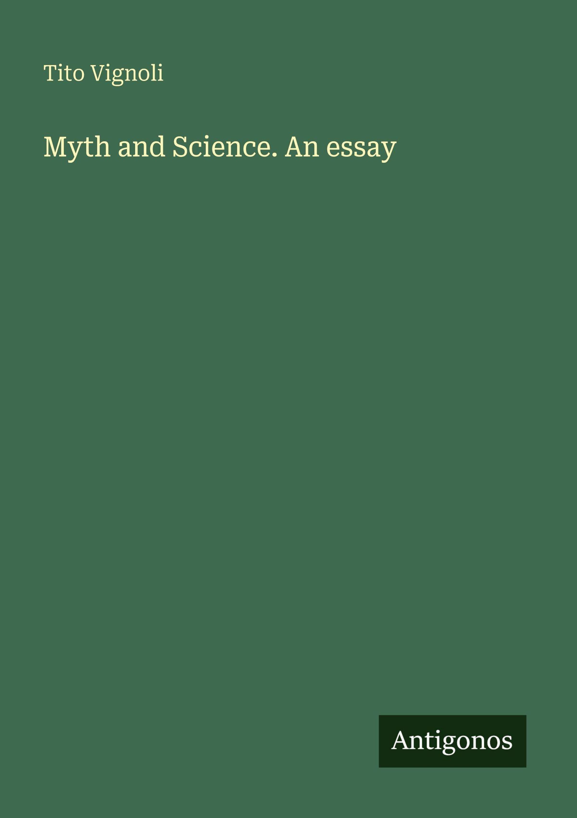 Titel: "Myth and Science. An essay." Autor: Tito Vignoli. Unten: "Antigonos". Einfaches Design, dunkler Hintergrund., Buch