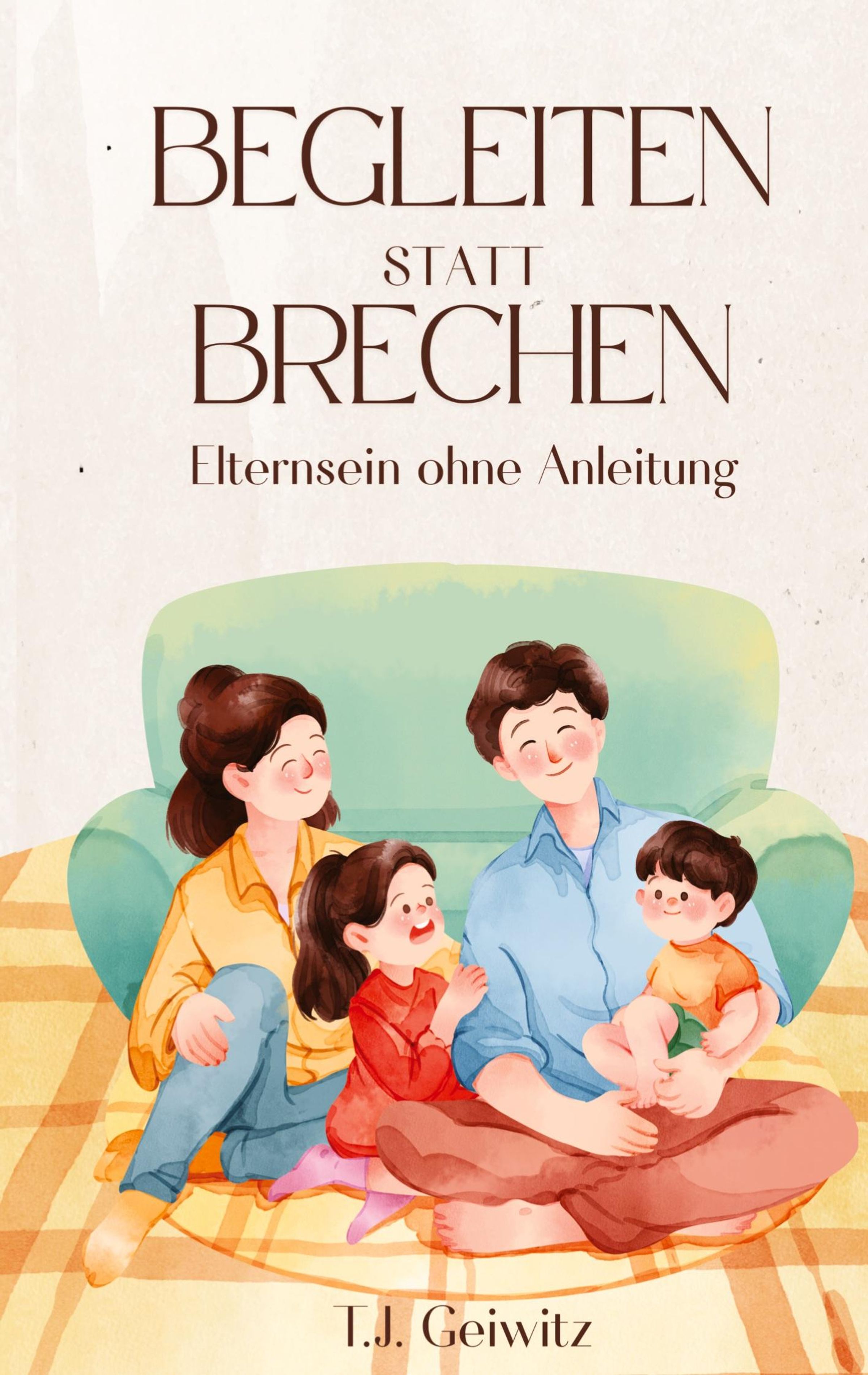 „BEGLEITEN STATT BRECHEN. Elternsein ohne Anleitung.“ Illustration: Glückliche Familie auf einem Sofa entspannt., Buch