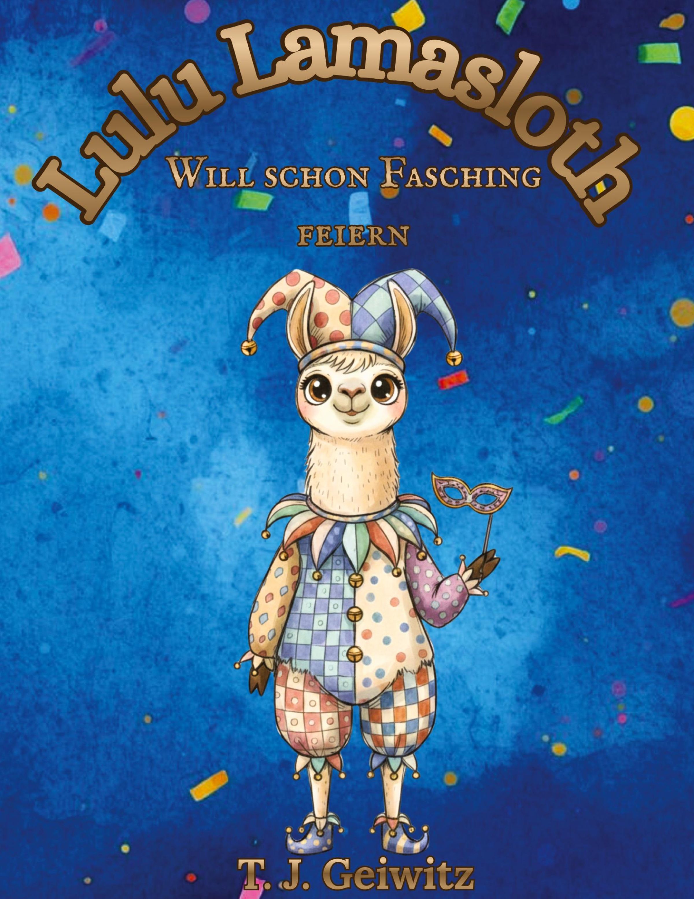 „Lulu Lamasloth will schon Fasching feiern“ von T. J. Geiwitz. Illustration eines verkleideten Lamalustigen., Buch