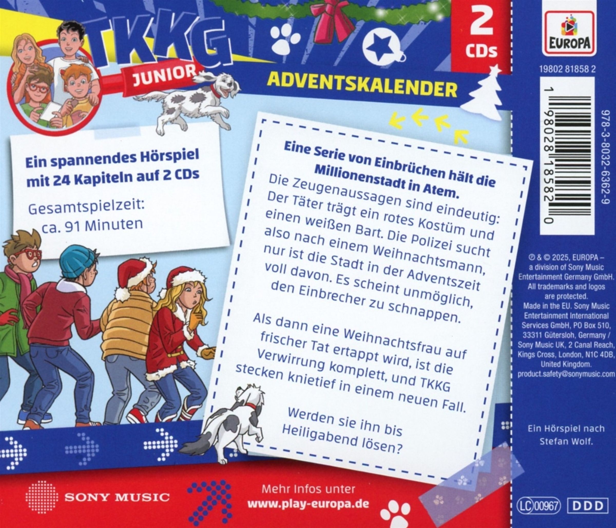 Eine Serie von Einbrüchen hält die Millionenstadt in Atem. Die Zeugenaussagen sind eindeutig: der Täter trägt ein rotes Kostüm und einen weißen Bart. Die Polizei sucht also nach einem Weihnachtsmann, nur ist die Stadt in der Adventszeit voll davon. Es scheint unmöglich, den Einbrecher zu schnappen. Als dann eine Weihnachtsfrau auf frischer Tat ertappt wird, ist die Verwirrung komplett, und TKKG stecken knietief in einem neuen Fall. Werden sie ihn bis Heiligabend lösen?