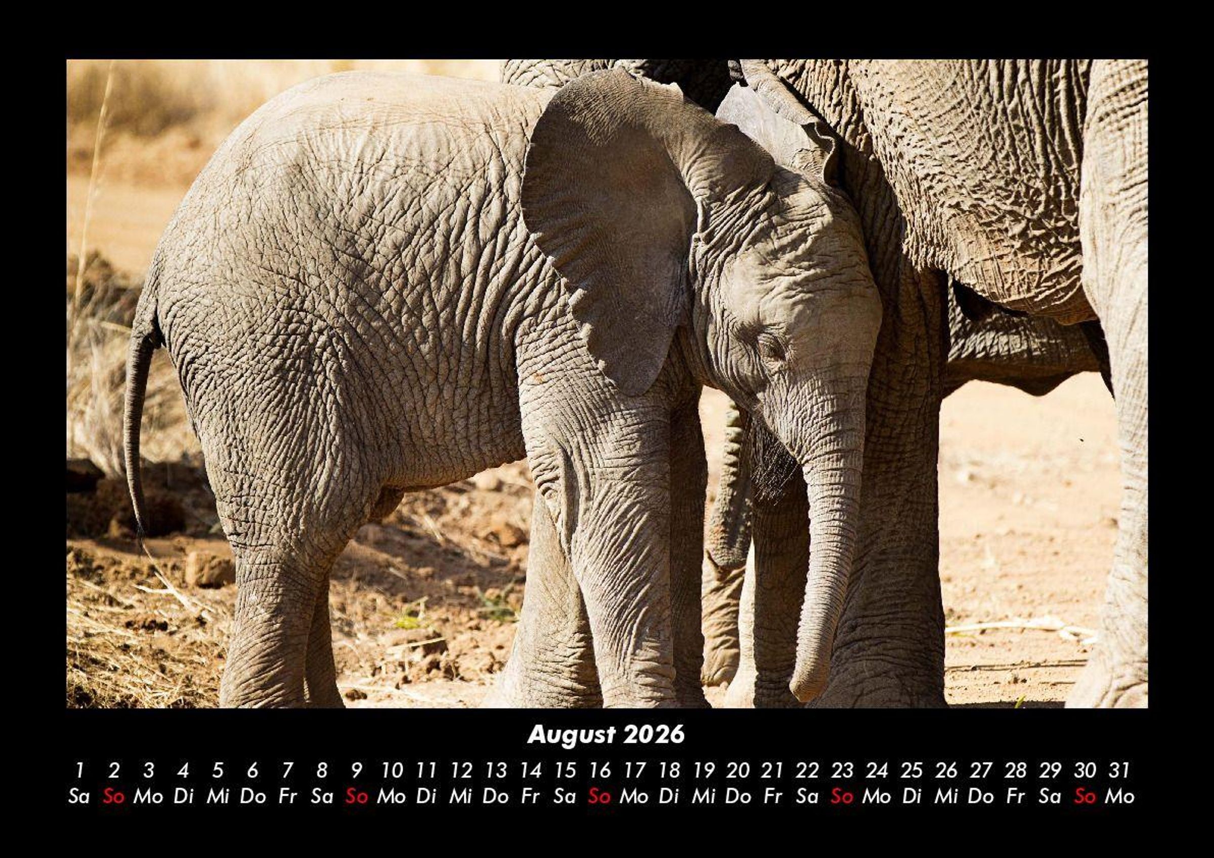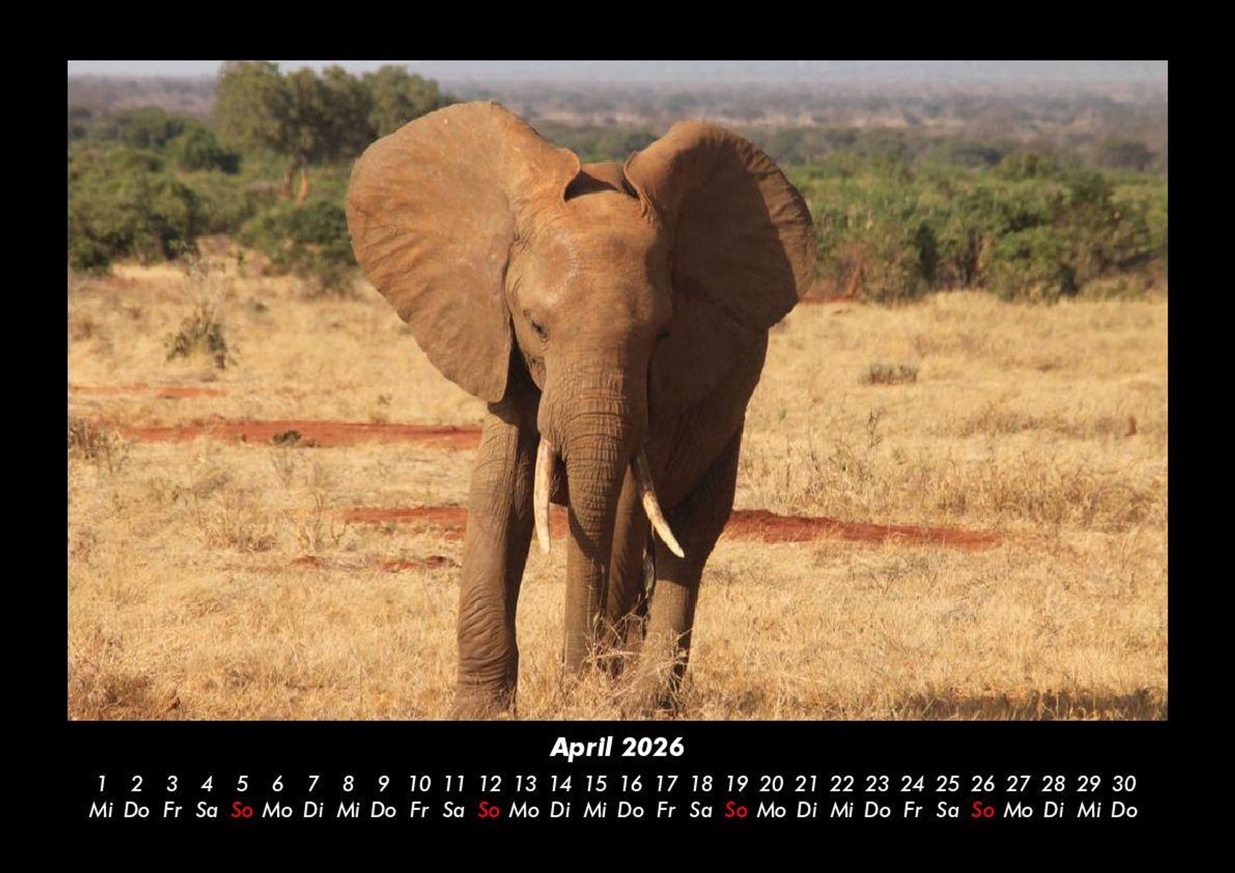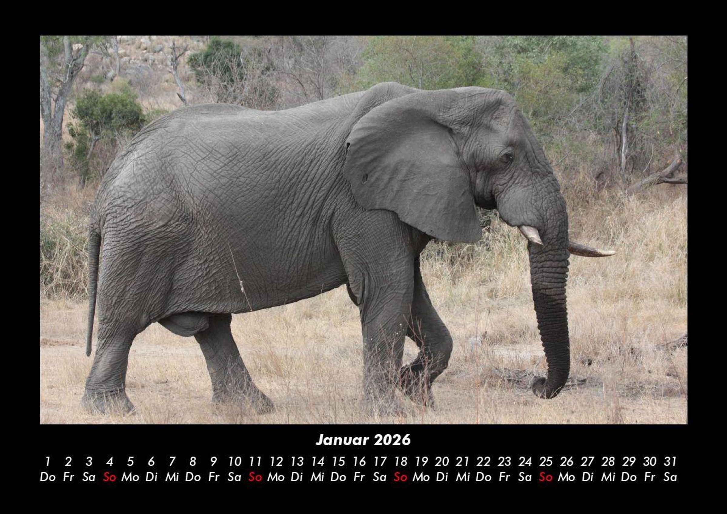 Elefanten - Die sanften Riesen Afrikas 2026 Motivkalender DIN A3 Vero-Kalender erhalten Sie mit Motiven aus den verschiedensten Themenbereichen wie Natur, Blumen und Landschaft, Tierwelt, Architektur, Reise und Urlaub, Technik, Automobil und Eisenbahn, Emotionen, Sport und Musik. Gedruckt werden die Monats-Kalender aus dem Vero Verlag auf hochwertigem Kalenderbogen in Premium-Qualität und verschiedenen Größen. Die Vielfältigkeit der Motive unserer Foto-Kalender ist dank der Zusammenarbeit mit kreativen Fotografen möglich.