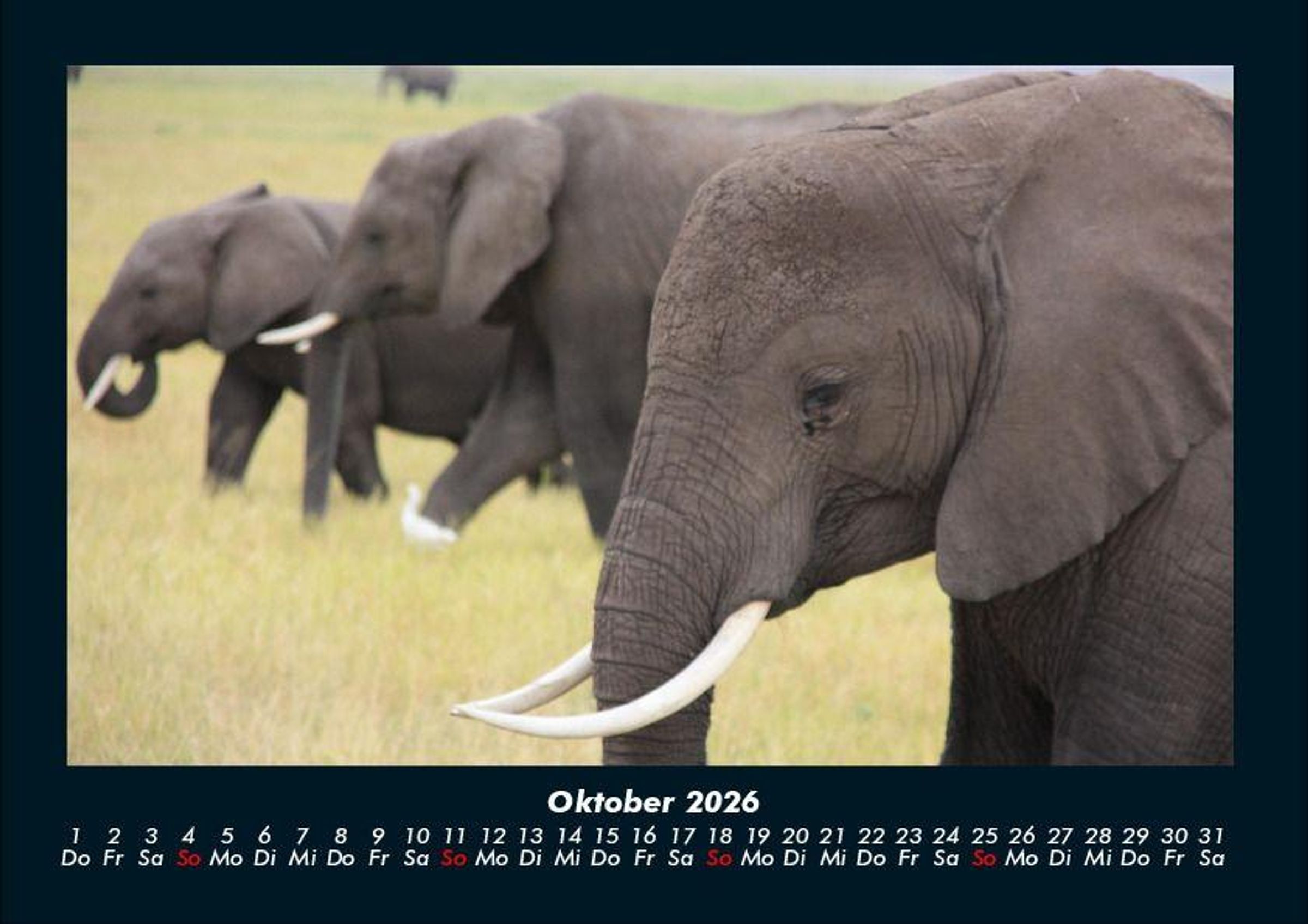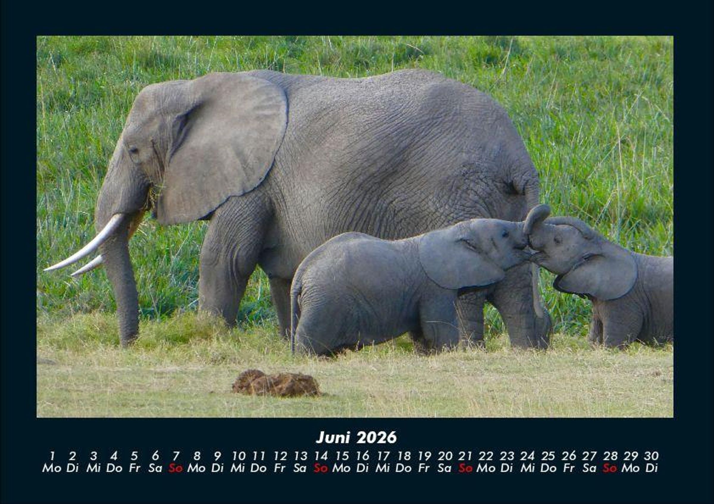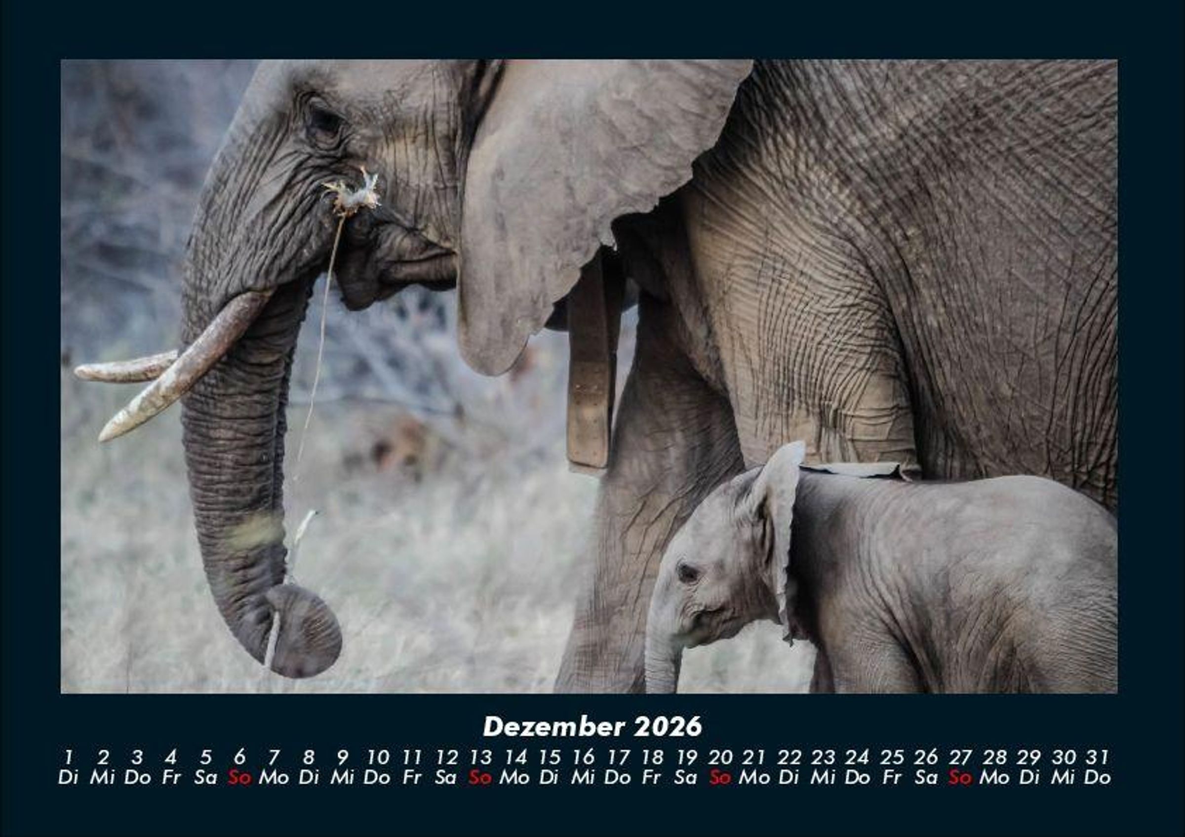 Elefanten - Die sanften Riesen Afrikas 2026 Motivkalender DIN A4 Vero-Kalender erhalten Sie mit Motiven aus den verschiedensten Themenbereichen wie Natur, Blumen und Landschaft, Tierwelt, Architektur, Reise und Urlaub, Technik, Automobil und Eisenbahn, Emotionen, Sport und Musik. Gedruckt werden die Monats-Kalender aus dem Vero Verlag auf hochwertigem Kalenderbogen in Premium-Qualität und verschiedenen Größen. Die Vielfältigkeit der Motive unserer Foto-Kalender ist dank der Zusammenarbeit mit kreativen Fotografen möglich.
