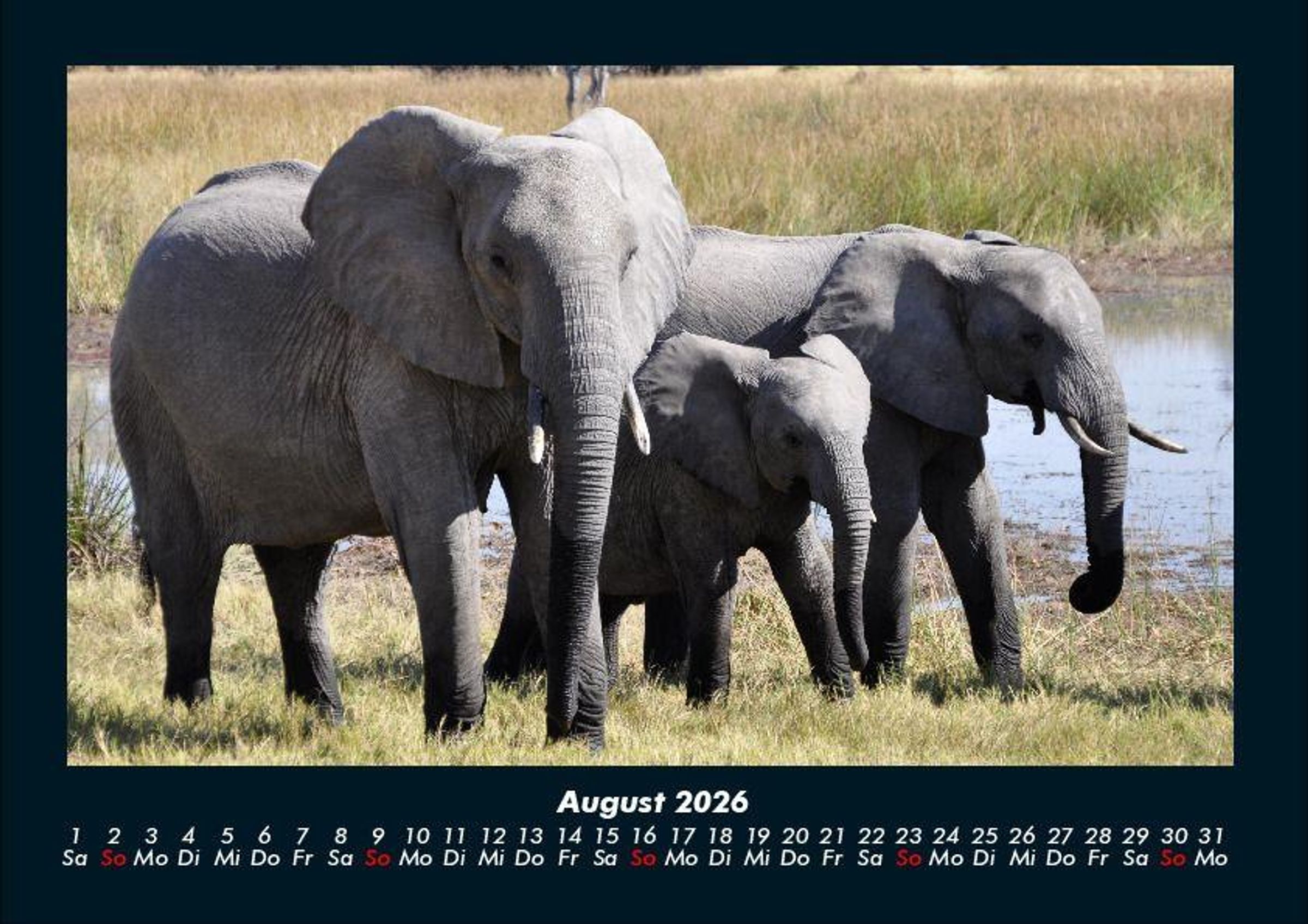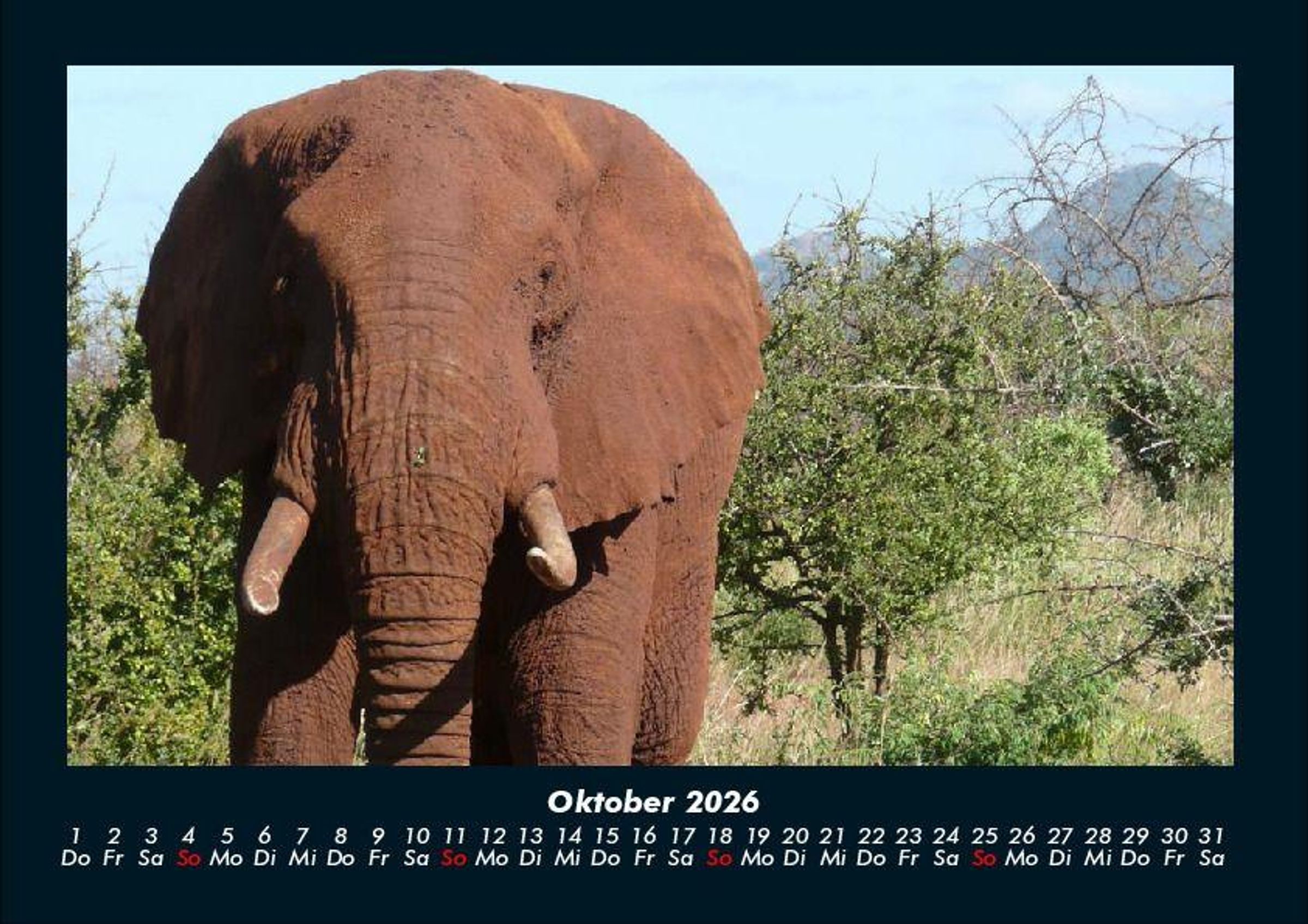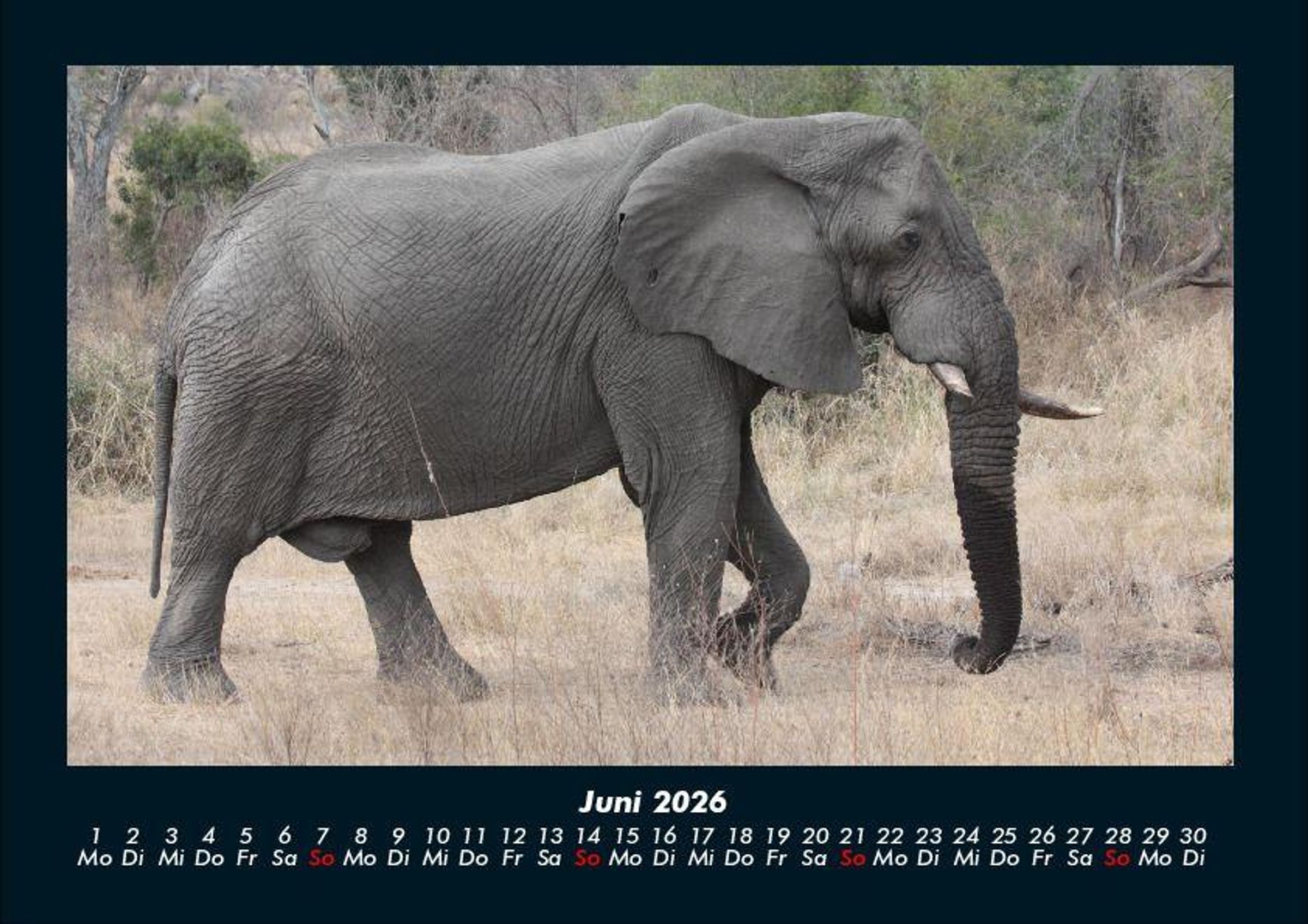 Elefanten - Die sanften Riesen Afrikas 2026 Motivkalender DIN A4 Vero-Kalender erhalten Sie mit Motiven aus den verschiedensten Themenbereichen wie Natur, Blumen und Landschaft, Tierwelt, Architektur, Reise und Urlaub, Technik, Automobil und Eisenbahn, Emotionen, Sport und Musik. Gedruckt werden die Monats-Kalender aus dem Vero Verlag auf hochwertigem Kalenderbogen in Premium-Qualität und verschiedenen Größen. Die Vielfältigkeit der Motive unserer Foto-Kalender ist dank der Zusammenarbeit mit kreativen Fotografen möglich.