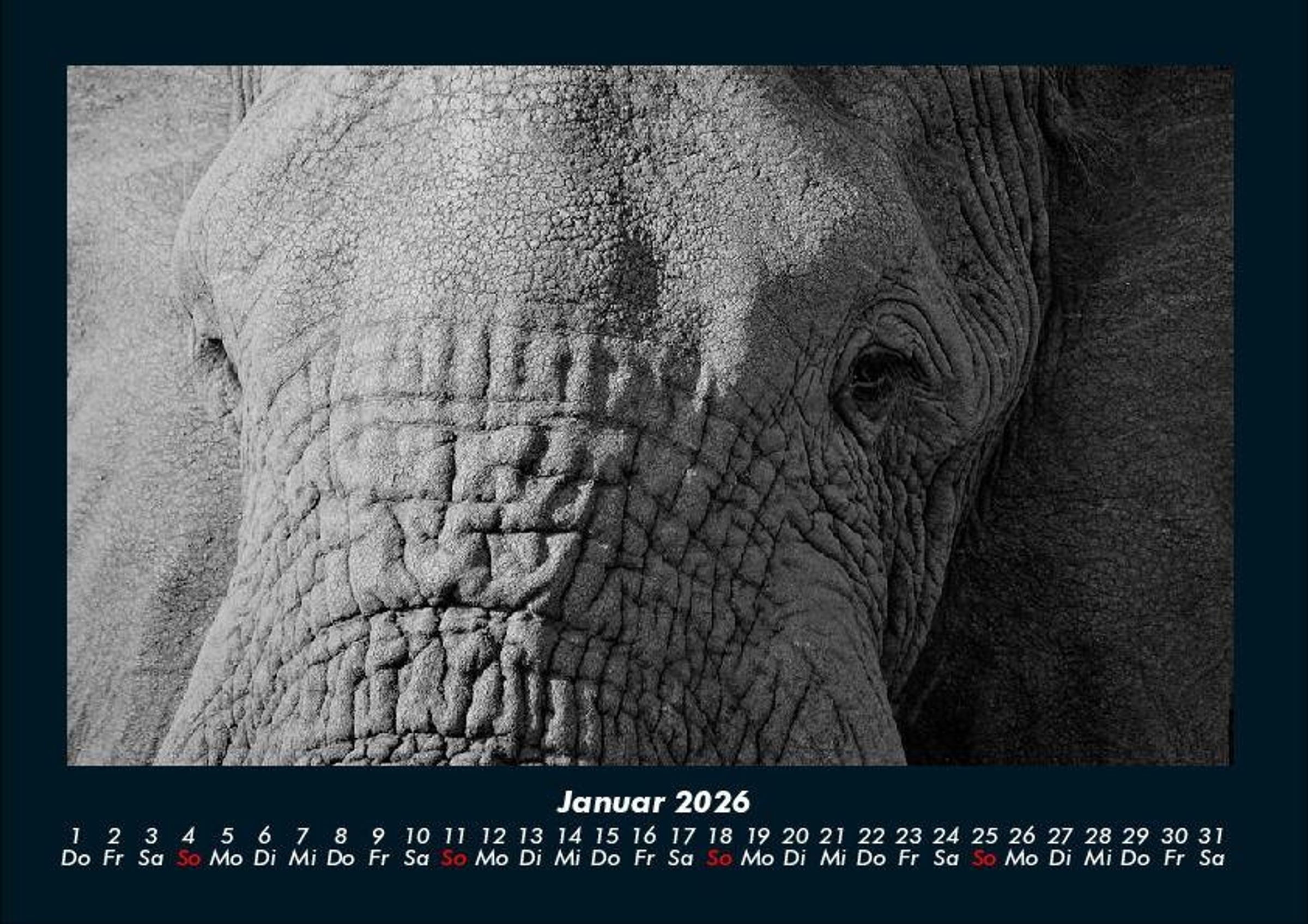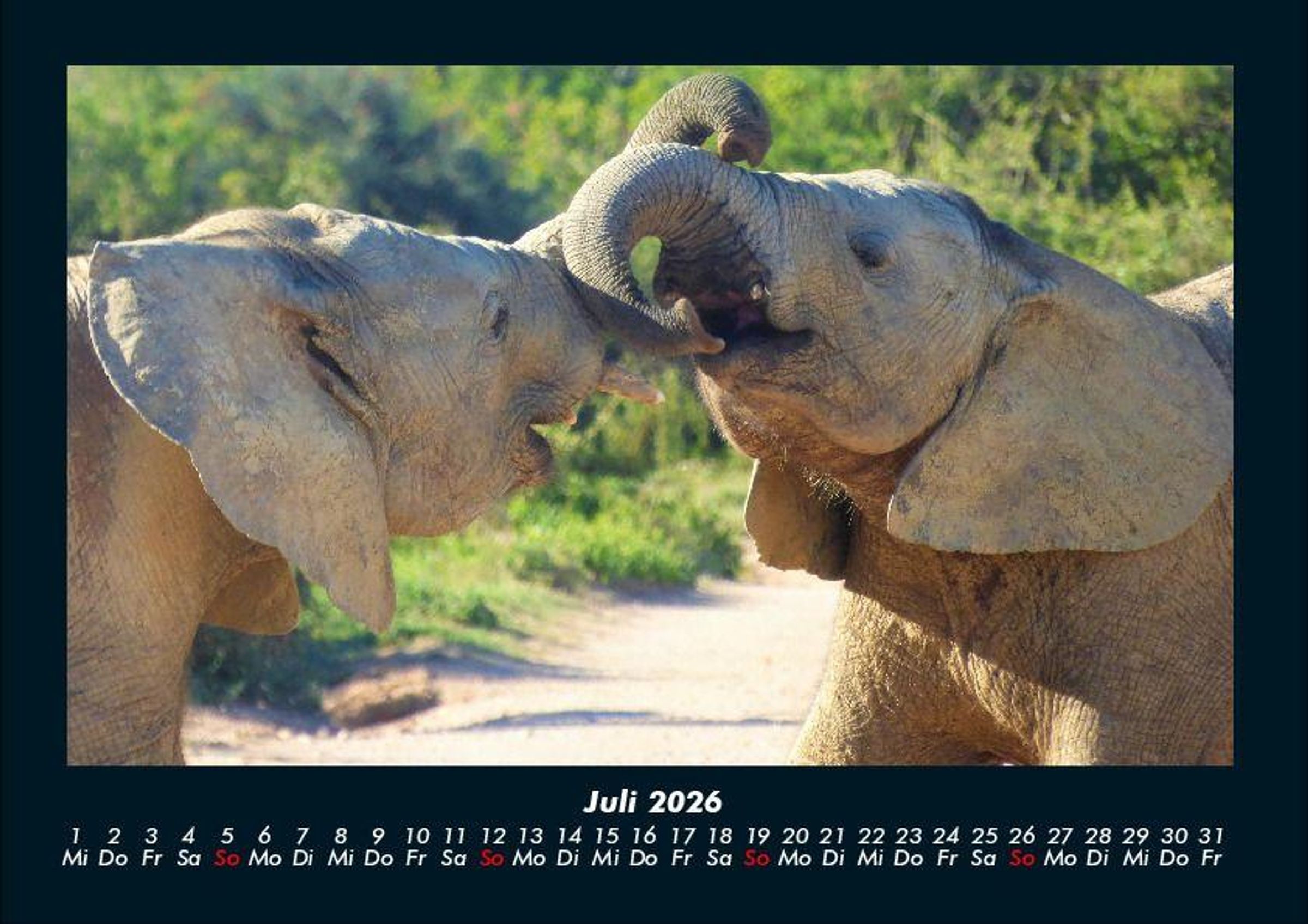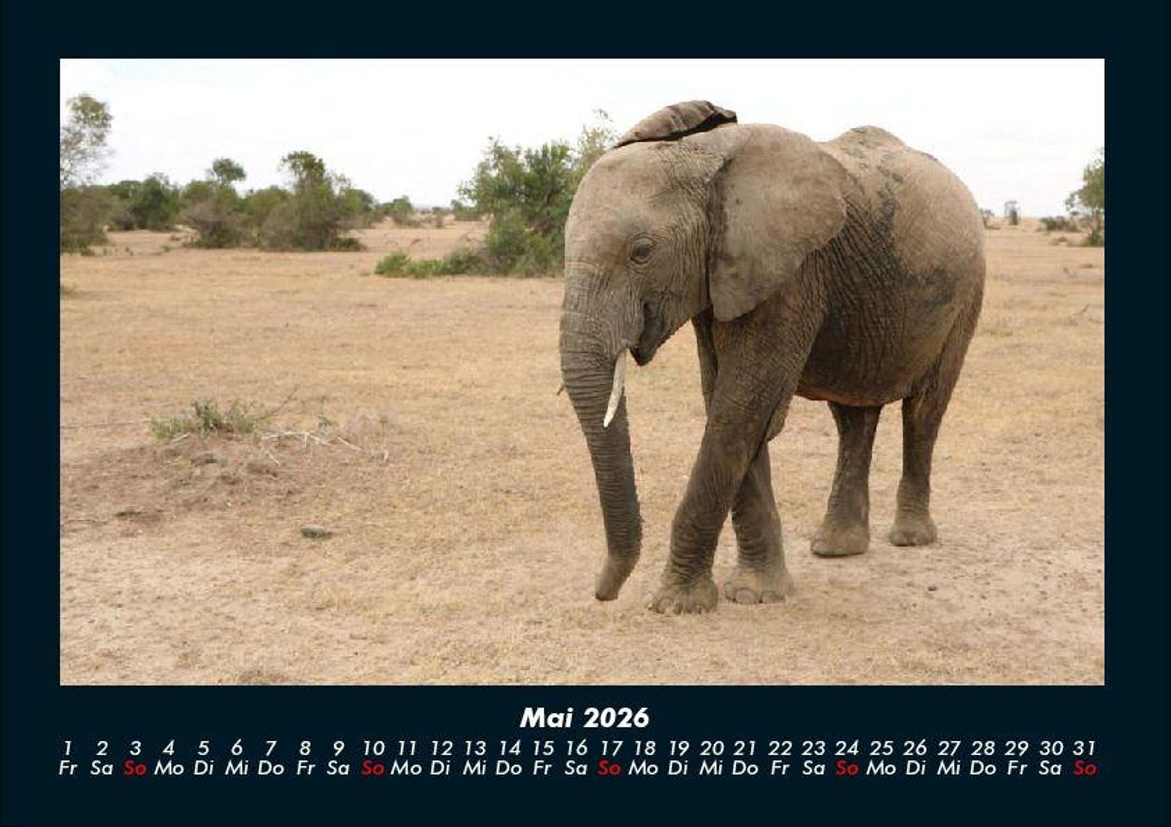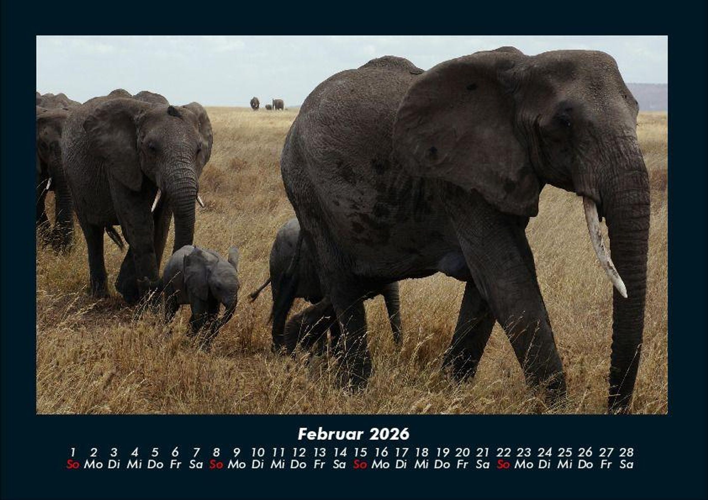 Elefanten - Die sanften Riesen Afrikas 2026 Motivkalender DIN A4 Vero-Kalender erhalten Sie mit Motiven aus den verschiedensten Themenbereichen wie Natur, Blumen und Landschaft, Tierwelt, Architektur, Reise und Urlaub, Technik, Automobil und Eisenbahn, Emotionen, Sport und Musik. Gedruckt werden die Monats-Kalender aus dem Vero Verlag auf hochwertigem Kalenderbogen in Premium-Qualität und verschiedenen Größen. Die Vielfältigkeit der Motive unserer Foto-Kalender ist dank der Zusammenarbeit mit kreativen Fotografen möglich.