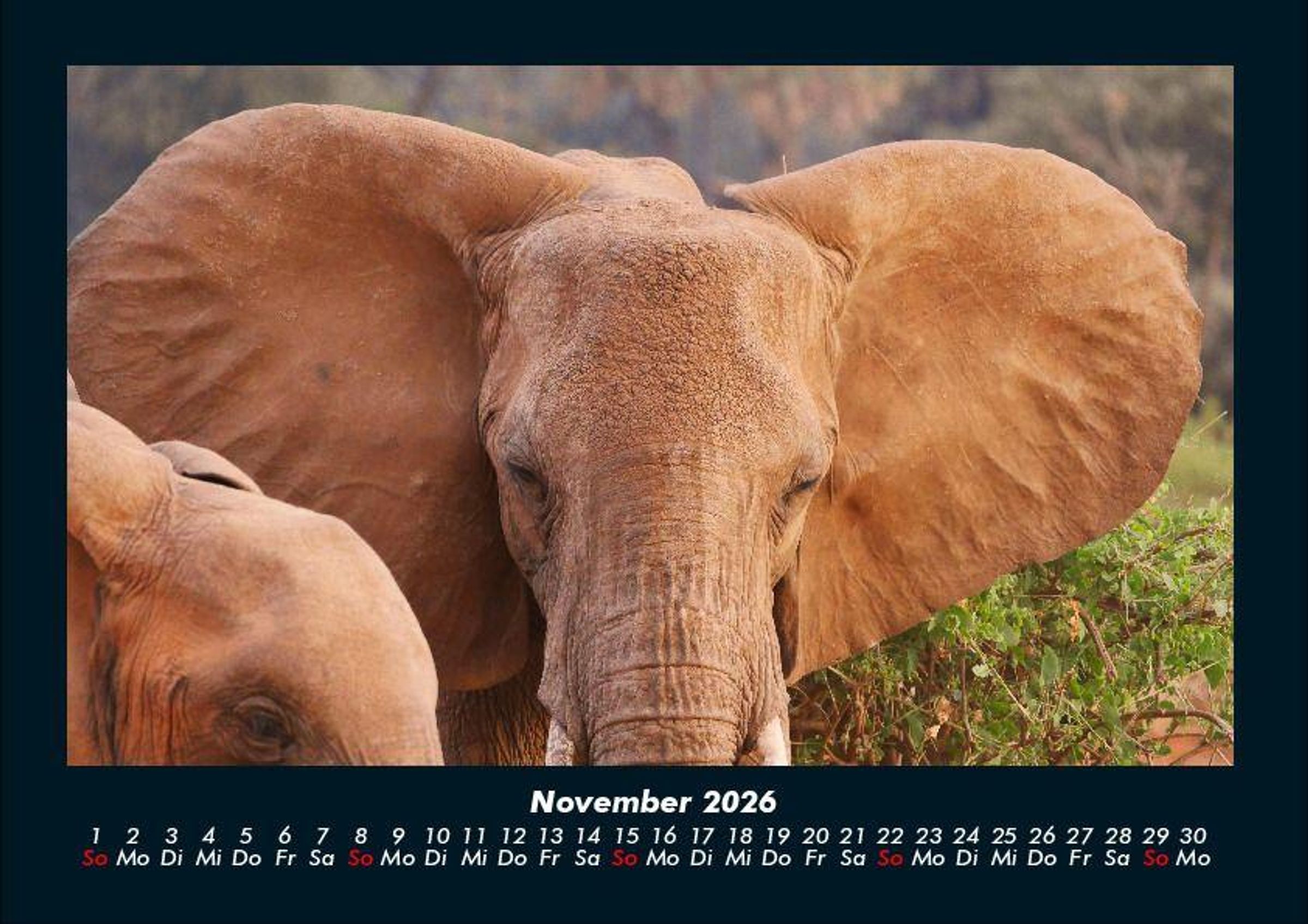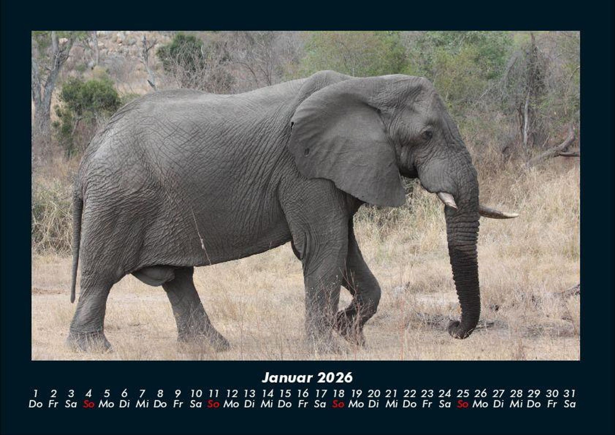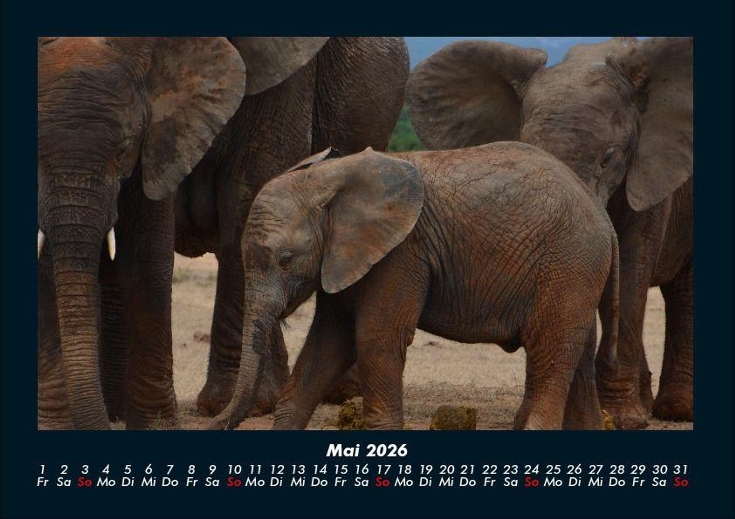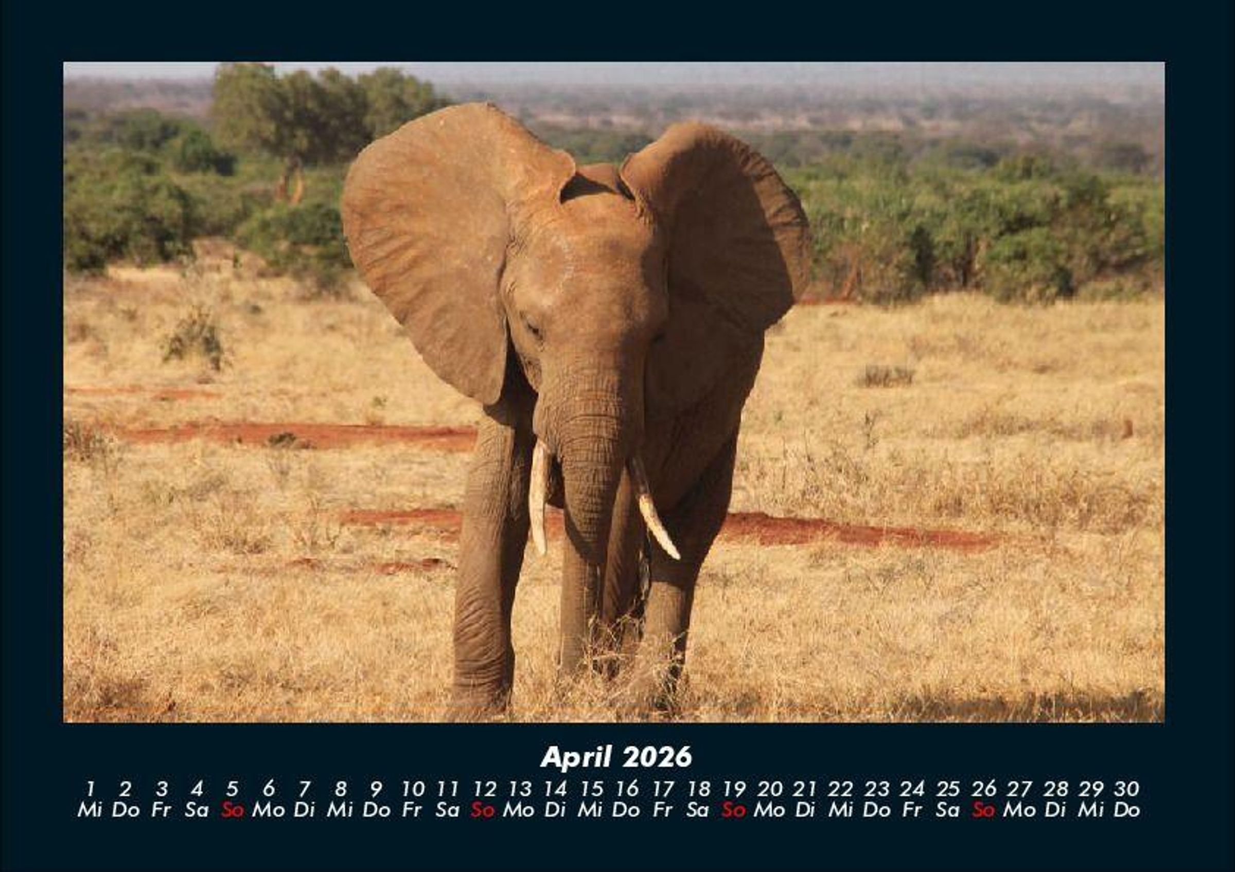 Elefanten - Die sanften Riesen Afrikas 2026 Motivkalender DIN A4 Vero-Kalender erhalten Sie mit Motiven aus den verschiedensten Themenbereichen wie Natur, Blumen und Landschaft, Tierwelt, Architektur, Reise und Urlaub, Technik, Automobil und Eisenbahn, Emotionen, Sport und Musik. Gedruckt werden die Monats-Kalender aus dem Vero Verlag auf hochwertigem Kalenderbogen in Premium-Qualität und verschiedenen Größen. Die Vielfältigkeit der Motive unserer Foto-Kalender ist dank der Zusammenarbeit mit kreativen Fotografen möglich.