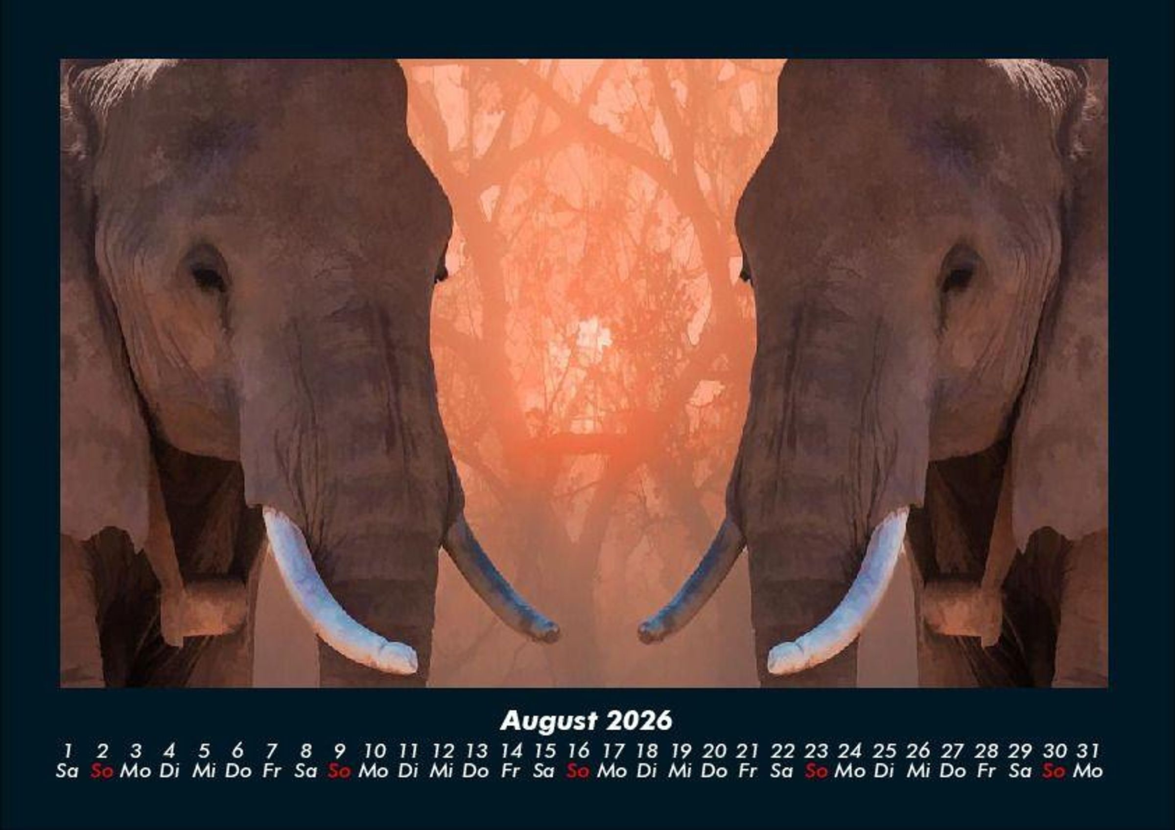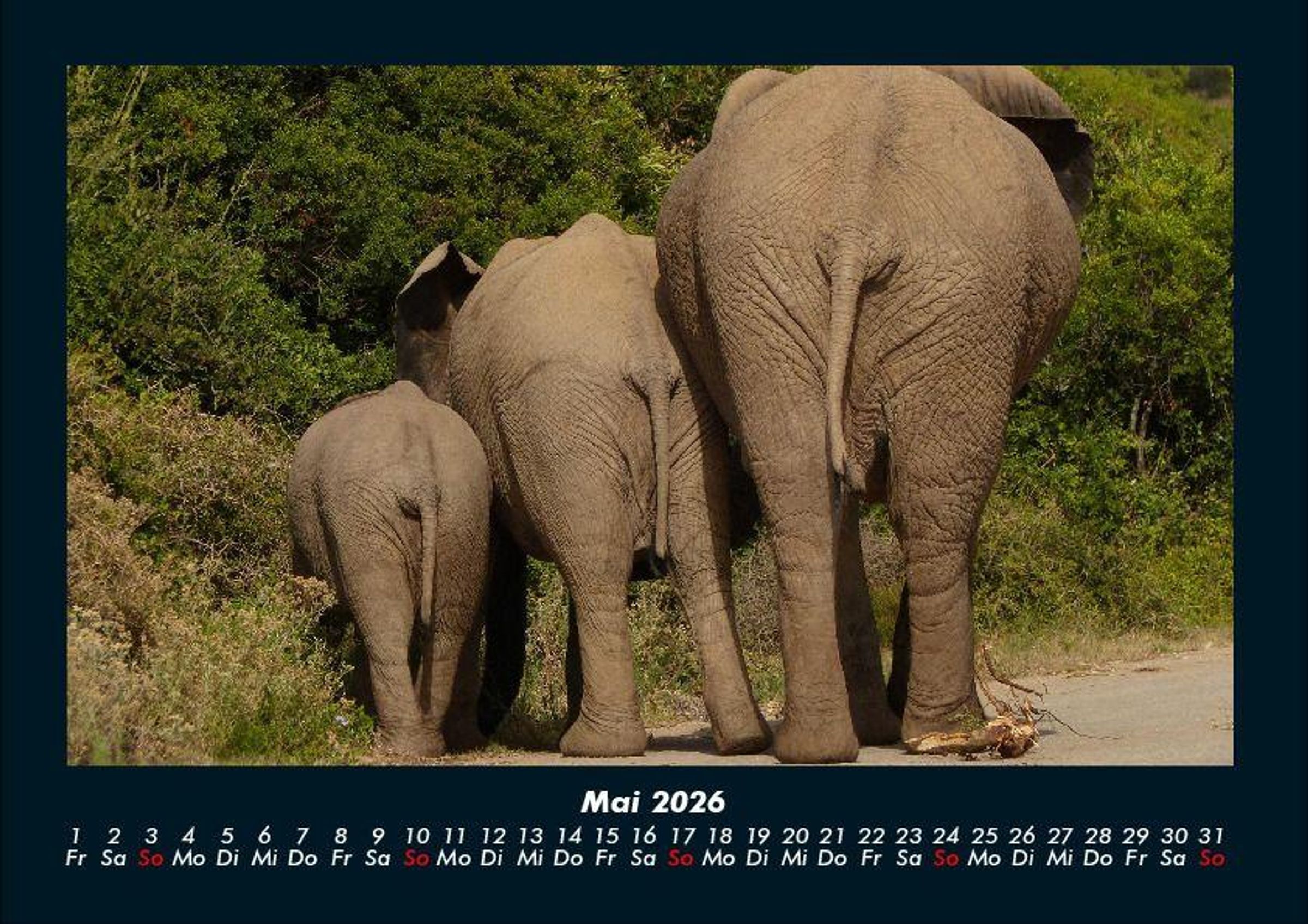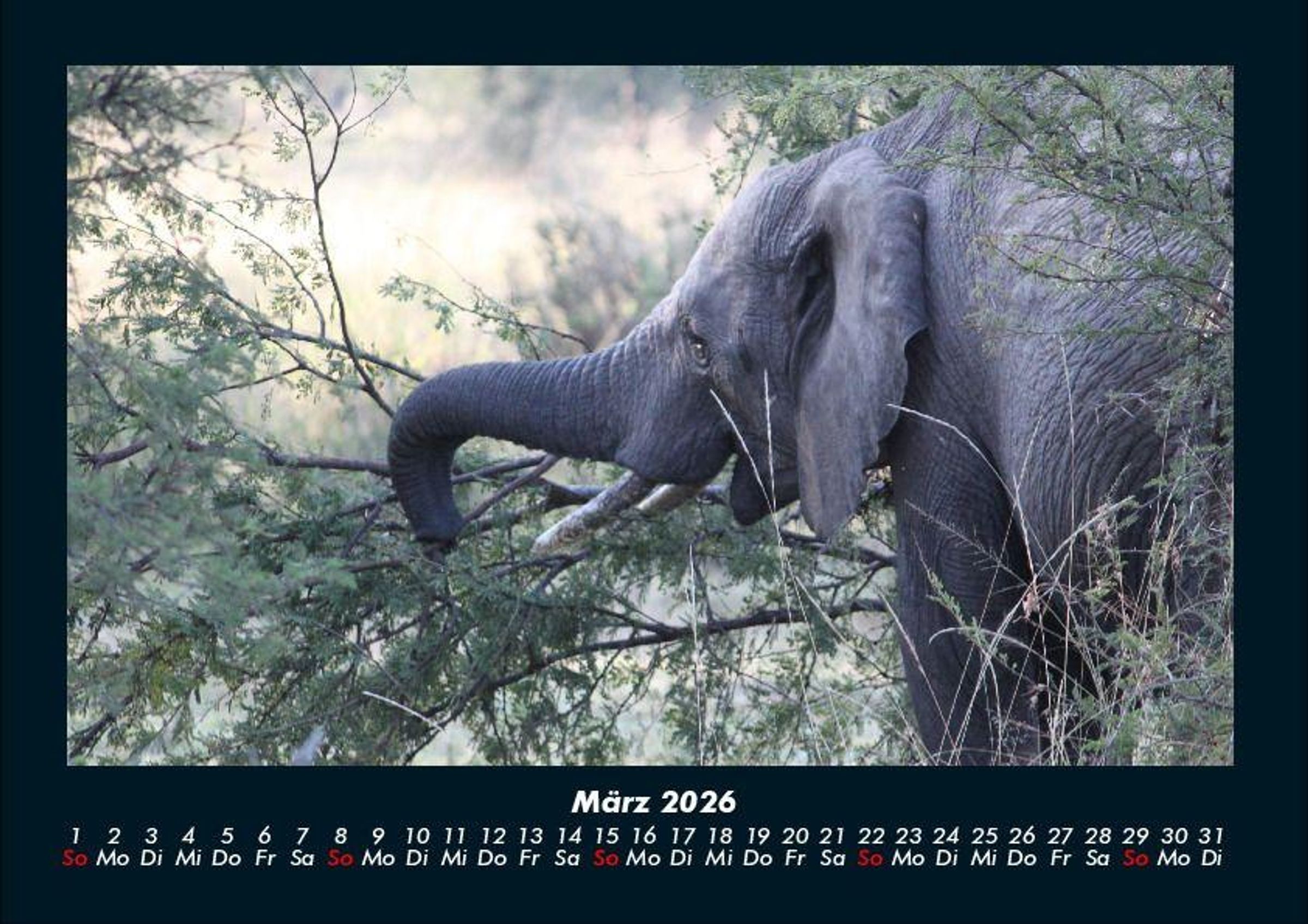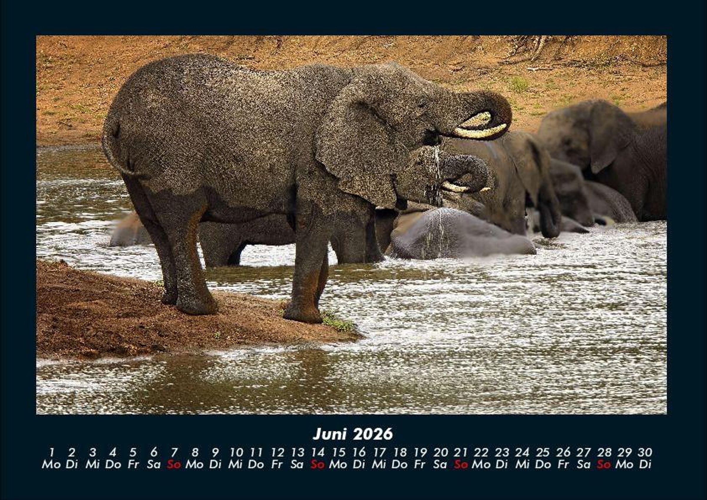 Elefanten - Die sanften Riesen Afrikas 2026 Motivkalender DIN A4 Vero-Kalender erhalten Sie mit Motiven aus den verschiedensten Themenbereichen wie Natur, Blumen und Landschaft, Tierwelt, Architektur, Reise und Urlaub, Technik, Automobil und Eisenbahn, Emotionen, Sport und Musik. Gedruckt werden die Monats-Kalender aus dem Vero Verlag auf hochwertigem Kalenderbogen in Premium-Qualität und verschiedenen Größen. Die Vielfältigkeit der Motive unserer Foto-Kalender ist dank der Zusammenarbeit mit kreativen Fotografen möglich.