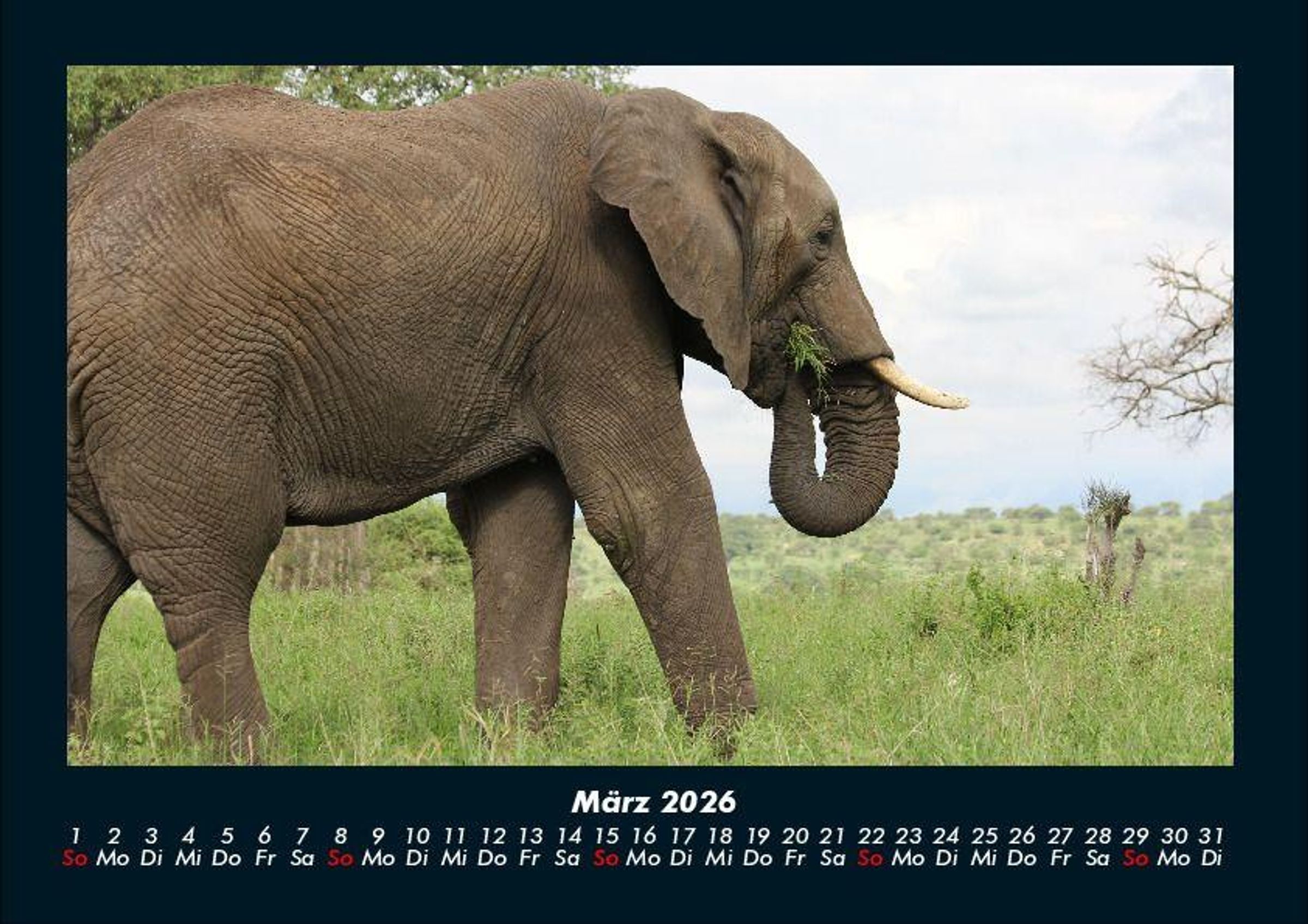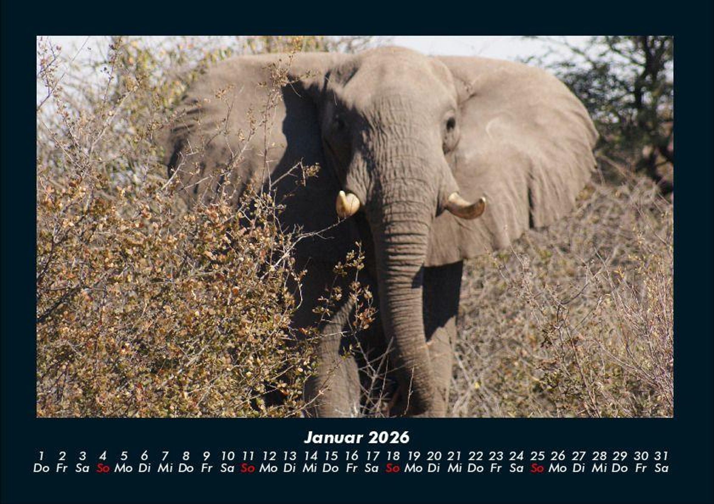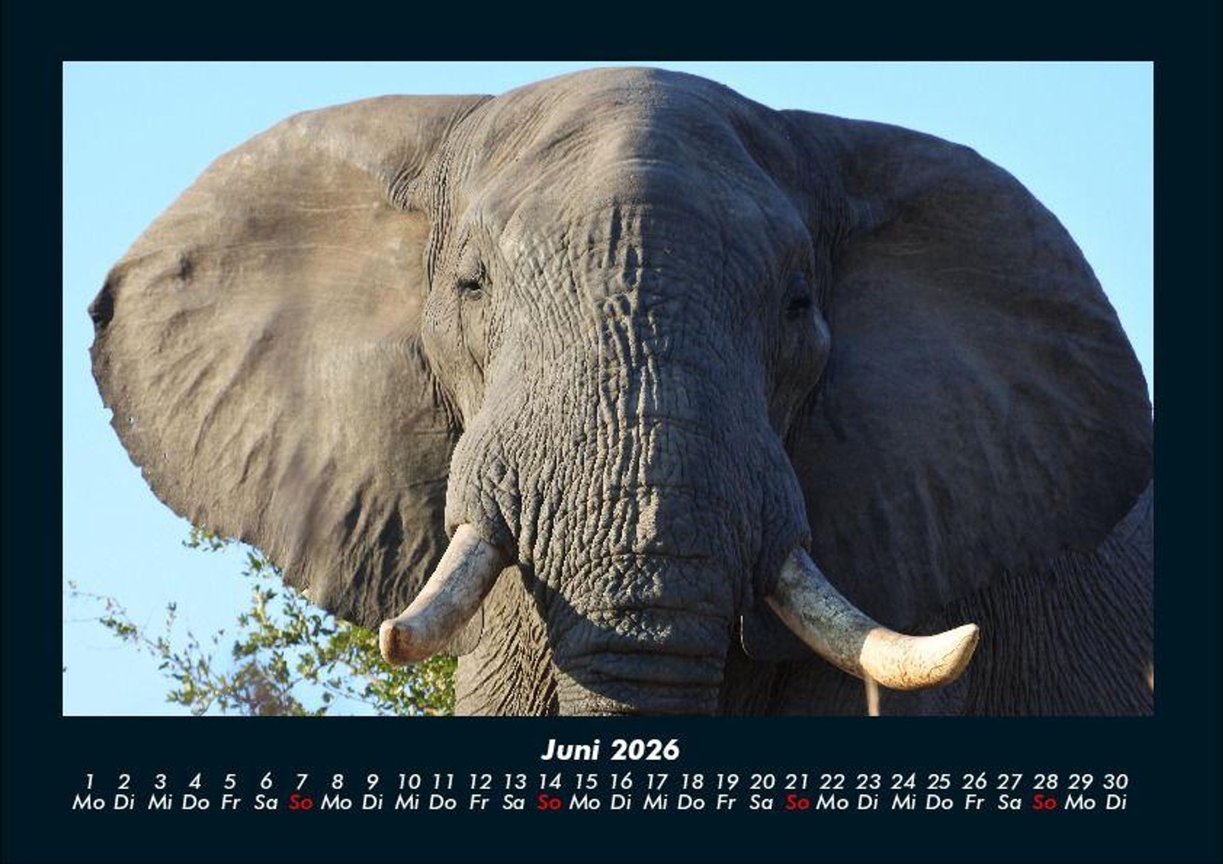 Elefanten - Die sanften Riesen Afrikas 2026 Motivkalender DIN A4 Vero-Kalender erhalten Sie mit Motiven aus den verschiedensten Themenbereichen wie Natur, Blumen und Landschaft, Tierwelt, Architektur, Reise und Urlaub, Technik, Automobil und Eisenbahn, Emotionen, Sport und Musik. Gedruckt werden die Monats-Kalender aus dem Vero Verlag auf hochwertigem Kalenderbogen in Premium-Qualität und verschiedenen Größen. Die Vielfältigkeit der Motive unserer Foto-Kalender ist dank der Zusammenarbeit mit kreativen Fotografen möglich.