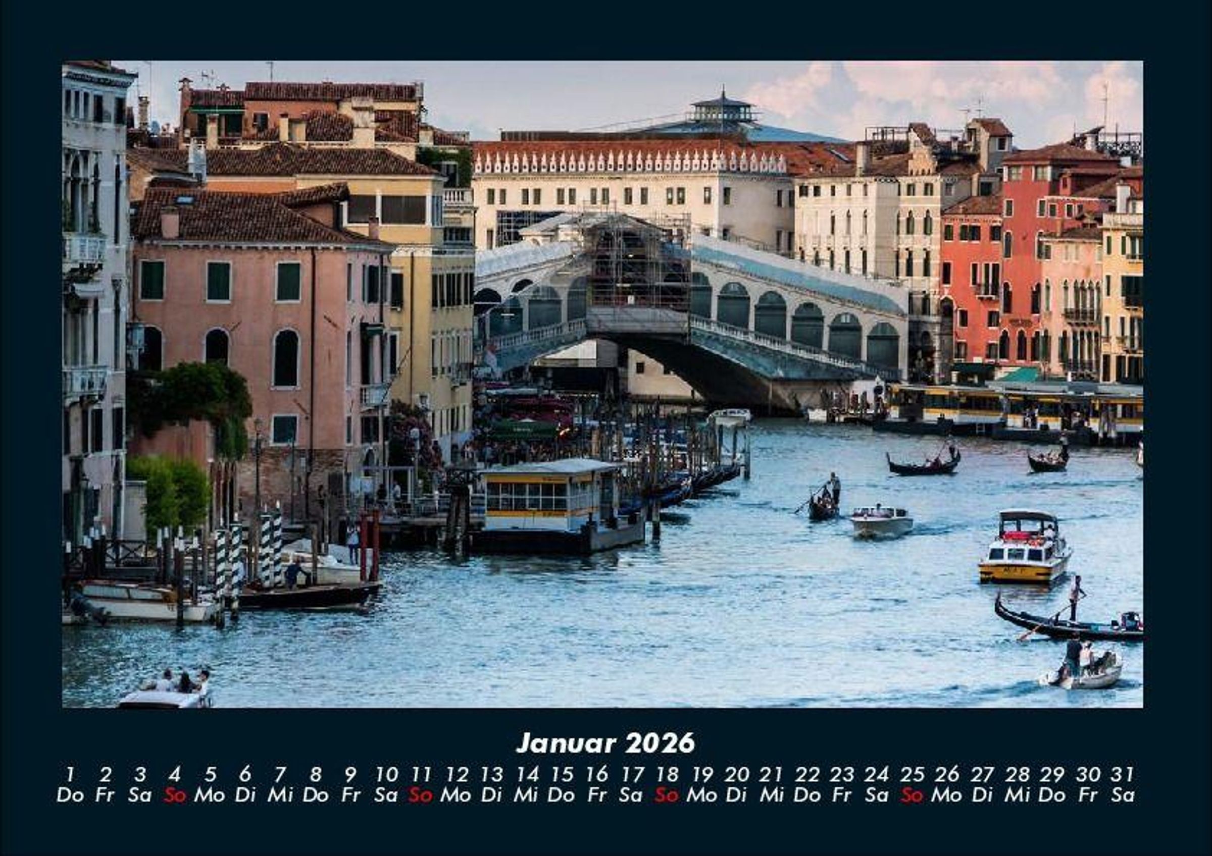 Venedigs Schönheit 2026 Motivkalender DIN A4 Vero-Kalender erhalten Sie mit Motiven aus den verschiedensten Themenbereichen wie Natur, Blumen und Landschaft, Tierwelt, Architektur, Reise und Urlaub, Technik, Automobil und Eisenbahn, Emotionen, Sport und Musik. Gedruckt werden die Monats-Kalender aus dem Vero Verlag auf hochwertigem Kalenderbogen in Premium-Qualität und verschiedenen Größen. Die Vielfältigkeit der Motive unserer Foto-Kalender ist dank der Zusammenarbeit mit kreativen Fotografen möglich.