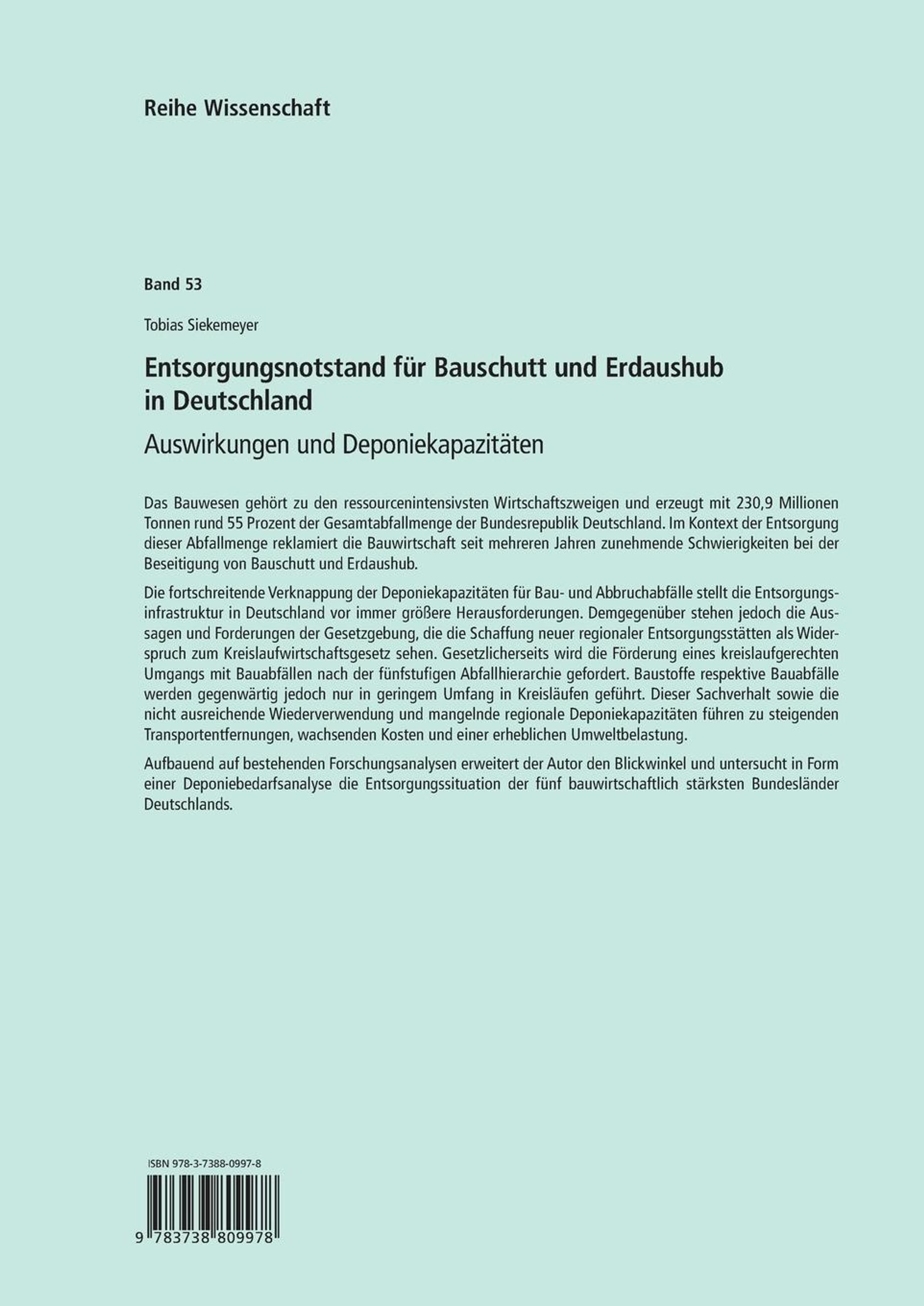 Aufbauend auf bestehenden Forschungsanalysen erweitert der Autor den Blickwinkel und untersucht in Form einer Deponiebedarfsanalyse die Entsorgungssituation der fünf bauwirtschaftlich stärksten Bundesländer Deutschlands.