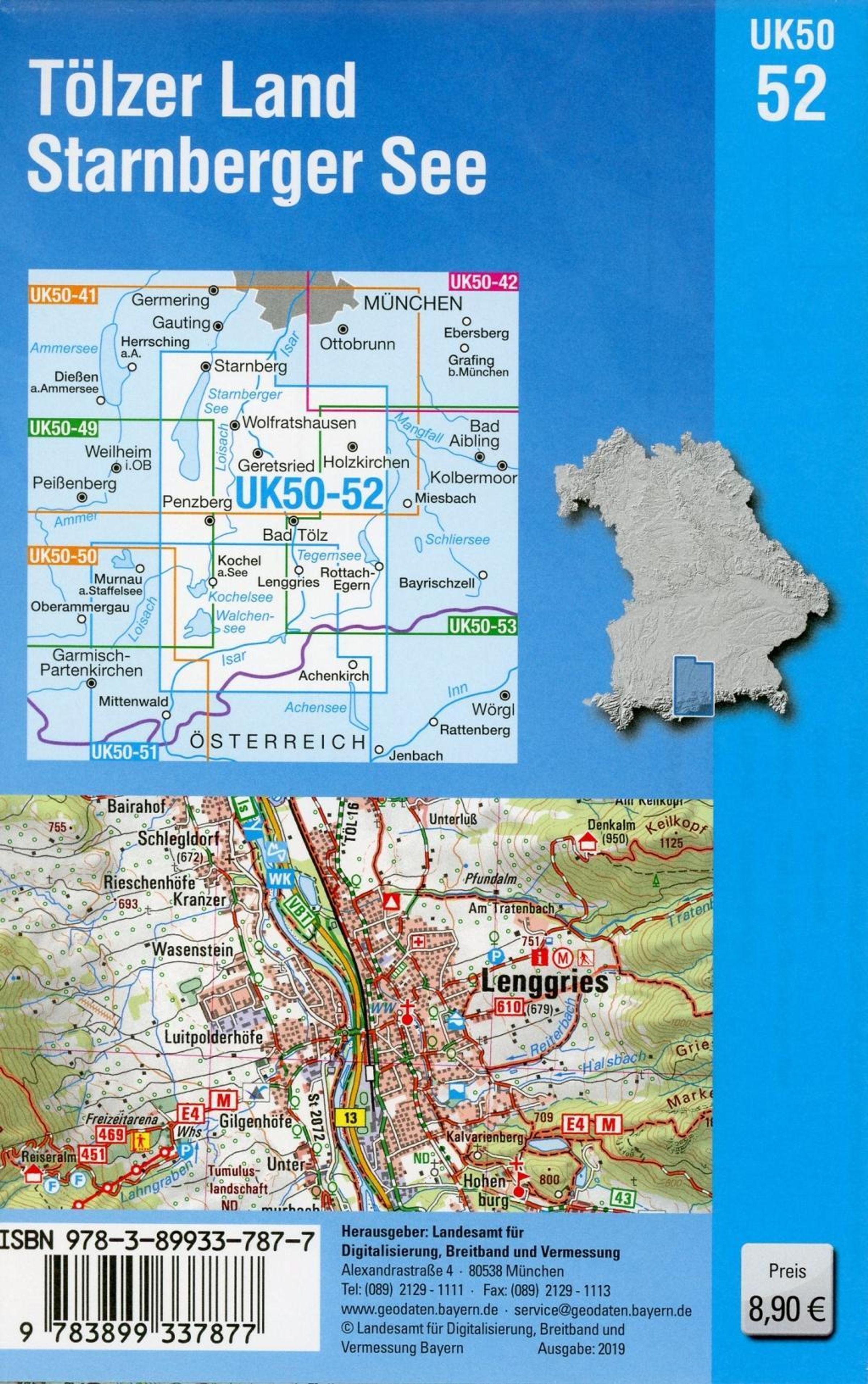 Die UK50-52 zeigt uns das Bad Tölzer Land mit dem Starnberger See im Nordwesten der Karte. "Bayerische Bilderbuchlandschaft", Berge und Seen - diese Beschreibung trifft auf jeden Fall auf's Tölzer Land zu. Der Starnberger See lädt an warmen Sommertagen nicht nur zu einer Erfrischung im kühlen Nass ein. Drumherum lässt es sich auch bestens wandern und radeln. Das Wolfratshauser Becken mit seinen hügeligen Rändern bietet weitere Möglichkeiten zur körperlichen Betätigung. Richtung Berge und besonders entlang der Loisach bis hinunter zum Kochelsee warten Moore mit ihrer faszinierenden Vegetation. Ein landschaftlicher Höhepunkt ist der Isarwinkel. Er reicht von Bad Tölz über Lenggries und den Sylvensteinsee bis Wallgau. Bergsteiger toben sich auf Benediktenwand, Herzogstand, Heimgarten und Jochberg aus. Wen es ganz nach oben zieht, findet in der Soierngruppe Ziele bis immerhin 2200 m. Der Kulturbeflissene besucht malerische Städte wie Bad Tölz und Wolfratshausen. Auch die altehrwürdigen Klöster wie Benediktbeuern und Schlehdorf sind ein Ausflug wert. Besondere Highlights für Familien sind die Freizeitbäder und Sommerrodelbahnen der Region.