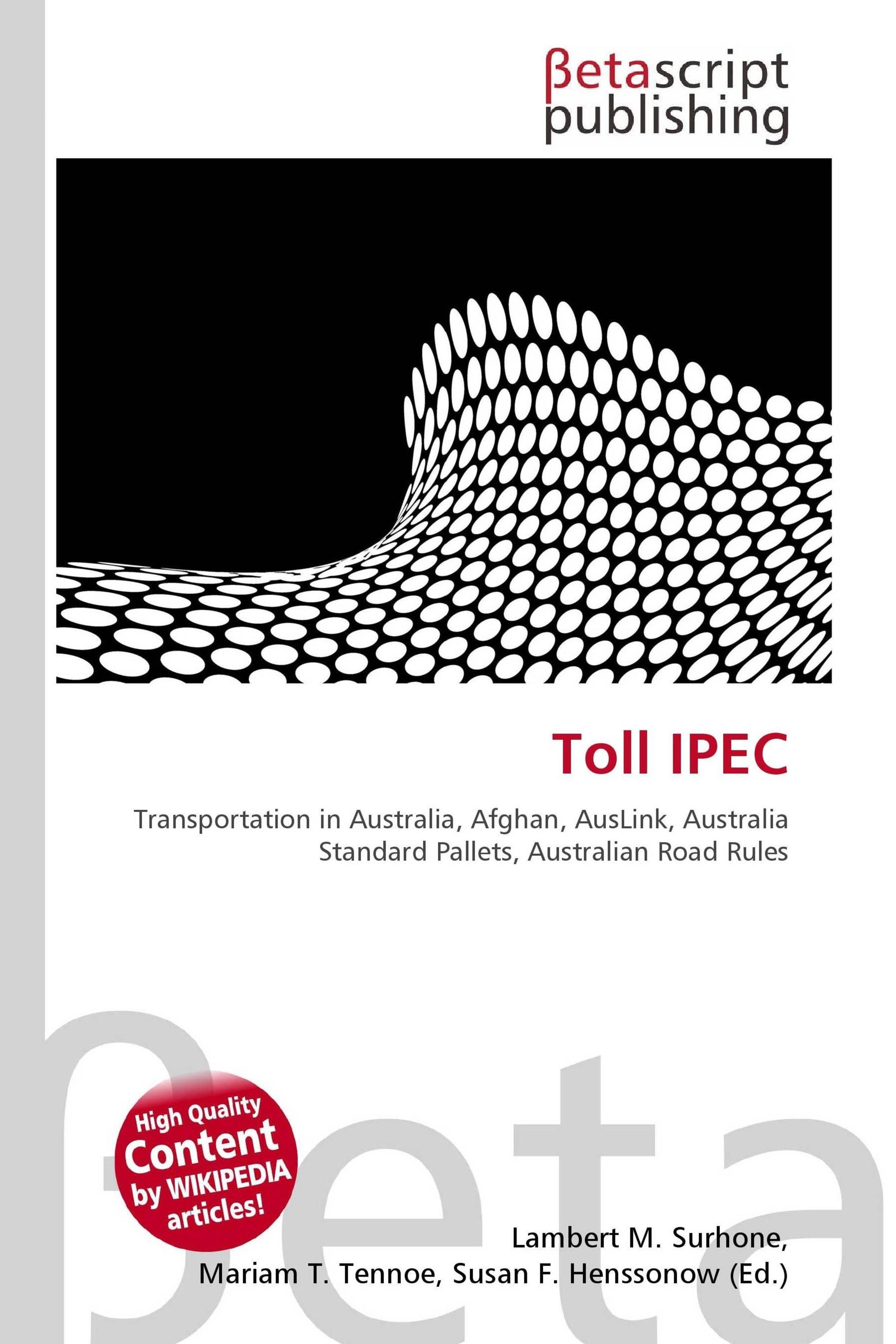 Please note that the content of this book primarily consists of articles available from Wikipedia or other free sources online. Toll IPEC is a major national logistics company headquartered in Melbourne, Australia, with operations in major capital and regional cities and towns around Australia. Toll IPEC is a wholly owned subsidiary of Toll Holdings. IPEC began operations in Adelaide and Melbourne in early 1955 as Interstate Parcel Express Company. IPEC pioneered the road linehaul and overnight freight industry as we know it in Australia by sending a vehicle from each depot, meeting half way to swap freight and returning to their origins for the morning delivery runs. After this route was successful, new routes were opened between major capital cities over the ensuing years, employing similar founding principles, expanding throughout the country. IPEC was purchased from Mayne Nickless in 1998 by Toll Holdings and renamed Toll IPEC.
