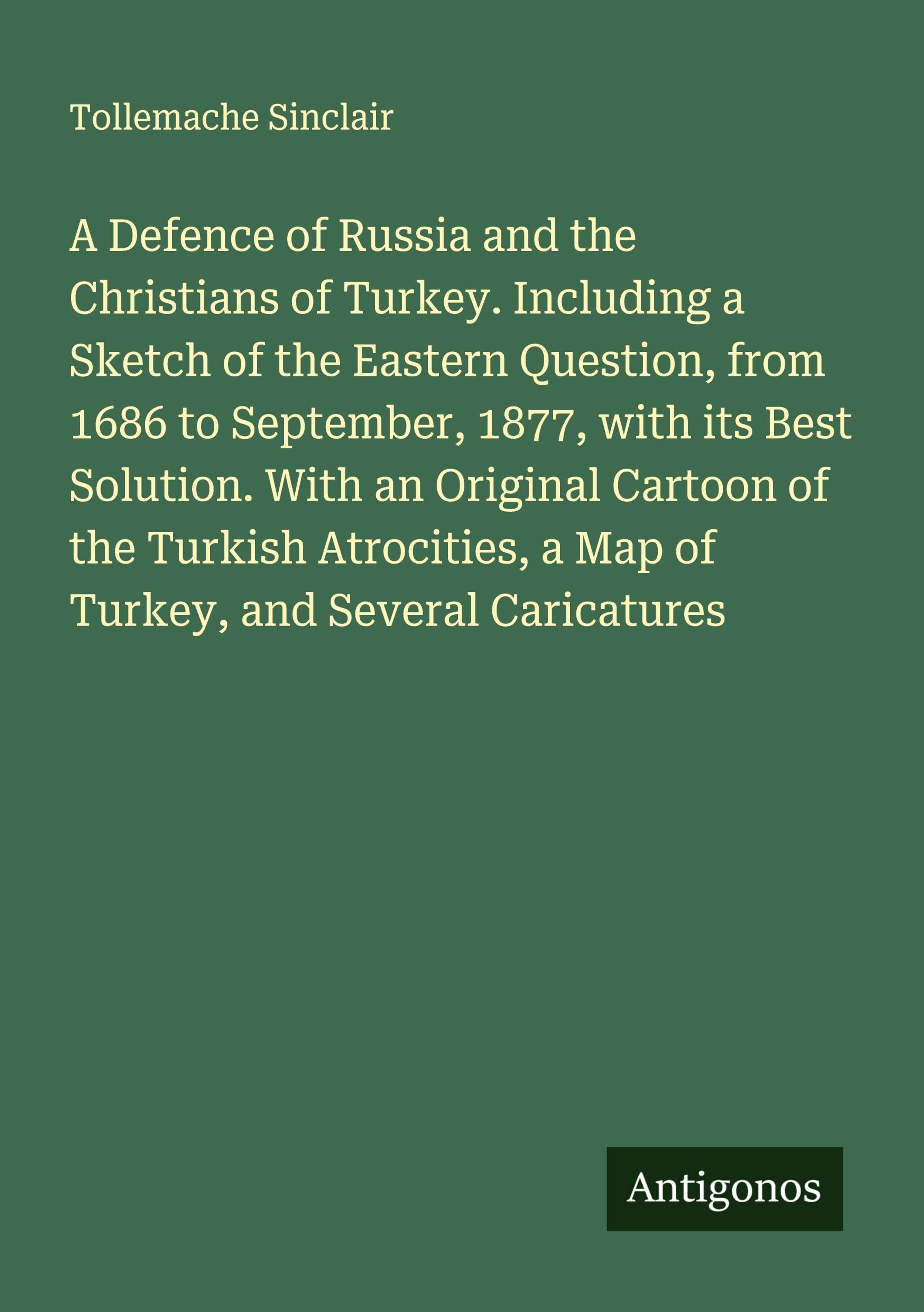 A Defence of Russia and the Christians of Turkey. Including a Sketch of the Eastern Question, from 1686 to September, 1877, with its Best Solution. With an Original Cartoon of the Turkish Atrocities, a Map of Turkey, and Several Caricatures