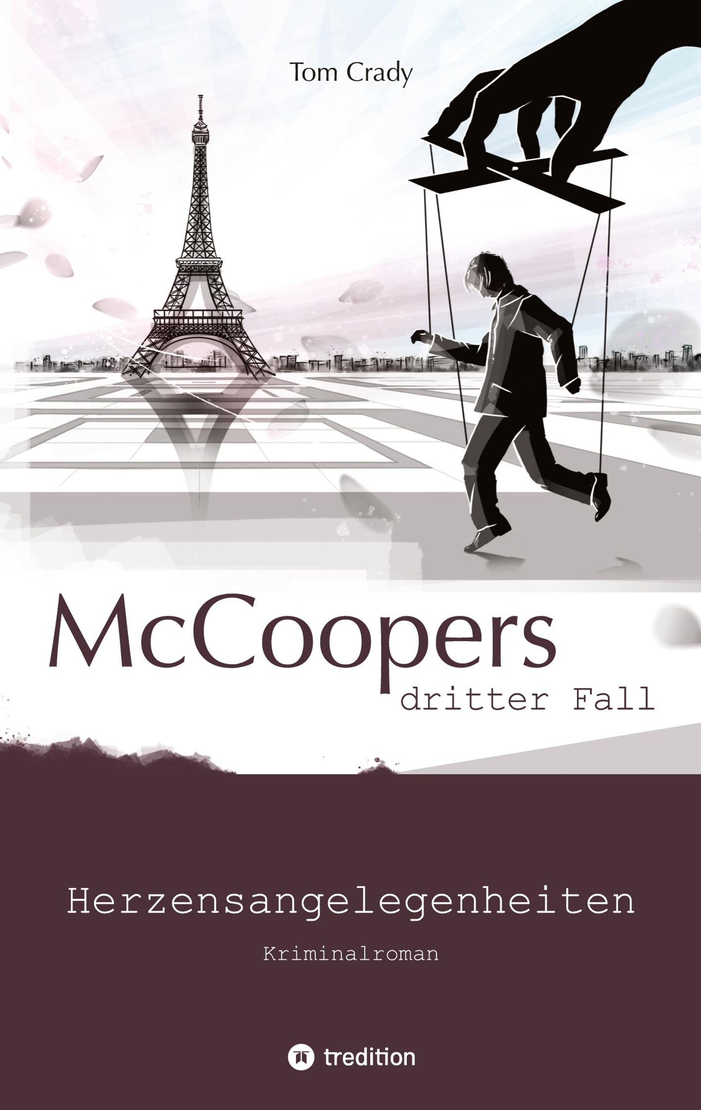 "Tom Crady. McCoopers dritter Fall. Herzensangelegenheiten. Kriminalroman." Illustration mit Eiffelturm und Marionette., Buch