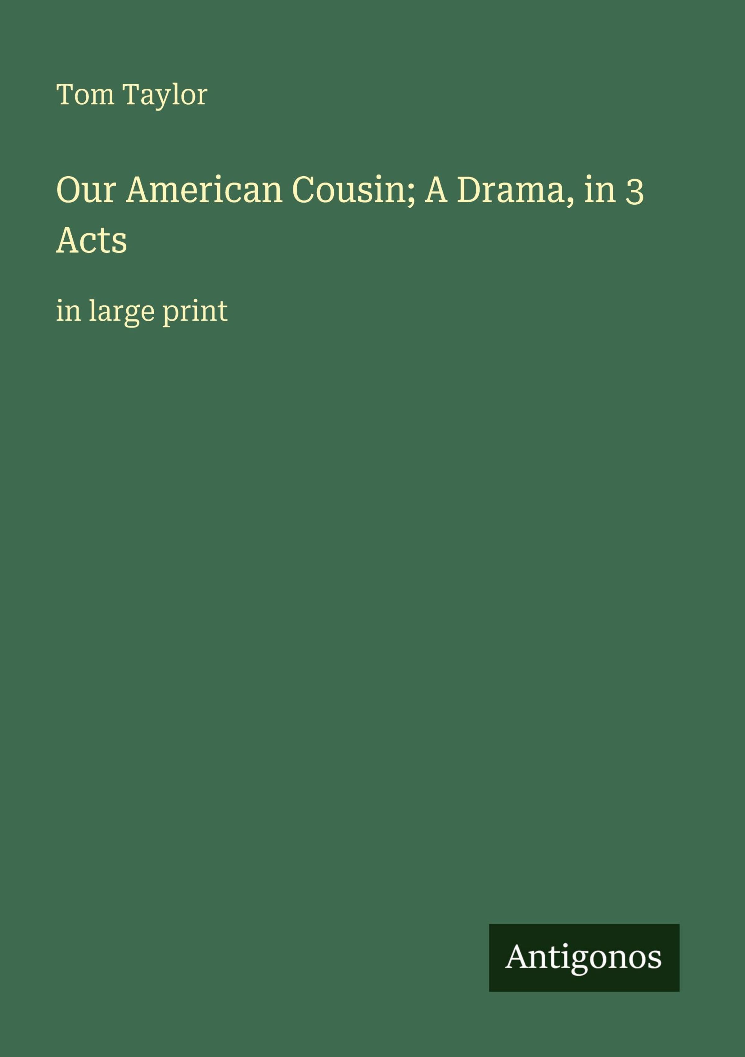 „Our American Cousin; A Drama, in 3 Acts“ von Tom Taylor, in Großdruck. Unten rechts ein Logo mit „Antigonos“., Buch