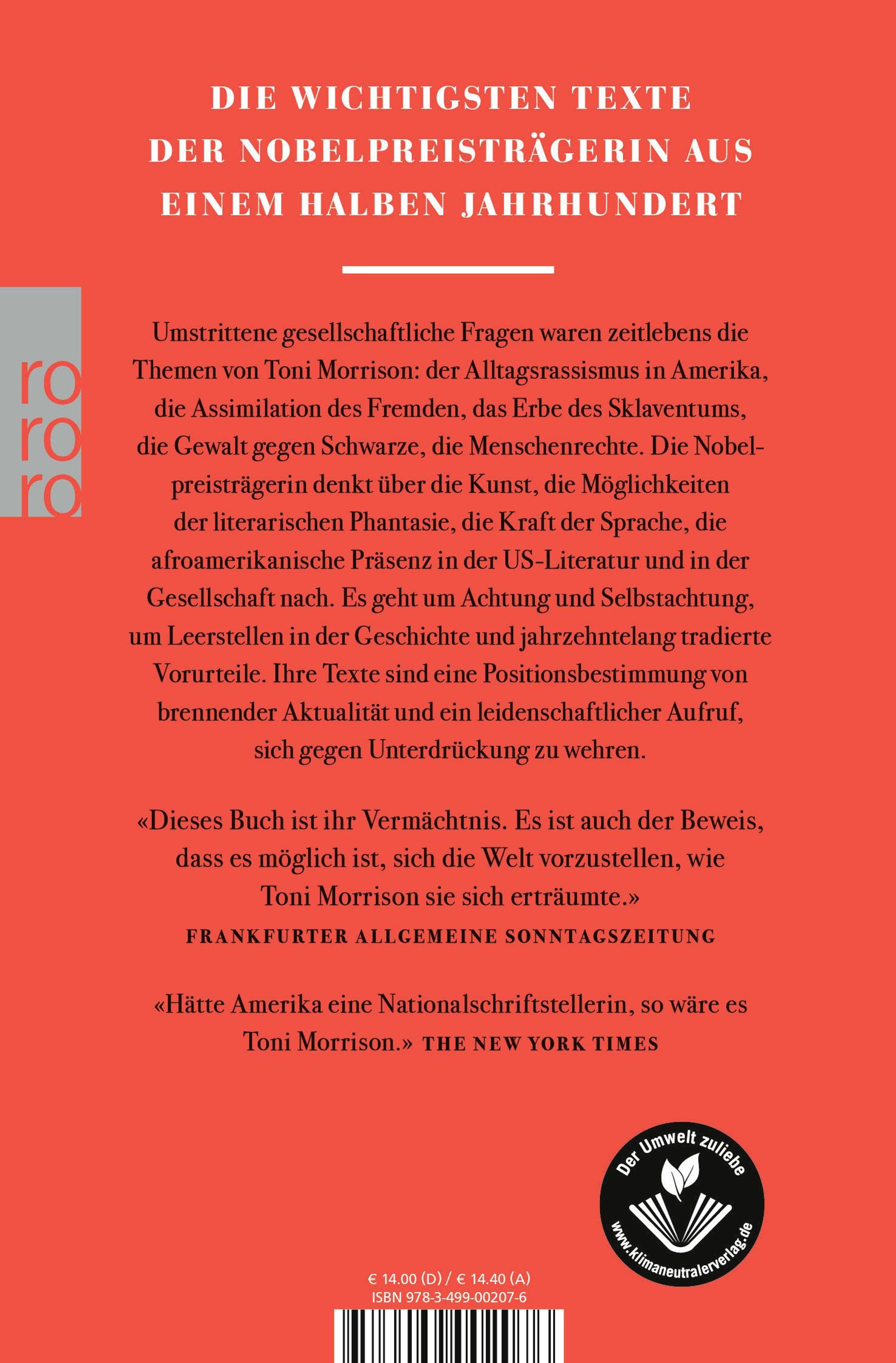 Die Eleganz ihres Denkens, die klare Schönheit ihrer Sprache und, vor allem, ihre aufrechte moralische Haltung waren ihre herausragenden Kennzeichen und maßgeblich dafür, dass Toni Morrison 1993 mit dem Nobelpreis für Literatur geehrt wurde. Diese Texte sind eine Positionsbestimmung von brennender Aktualität und ein leidenschaftlicher Aufruf, sich gegen Unterdrückung zu wehren.