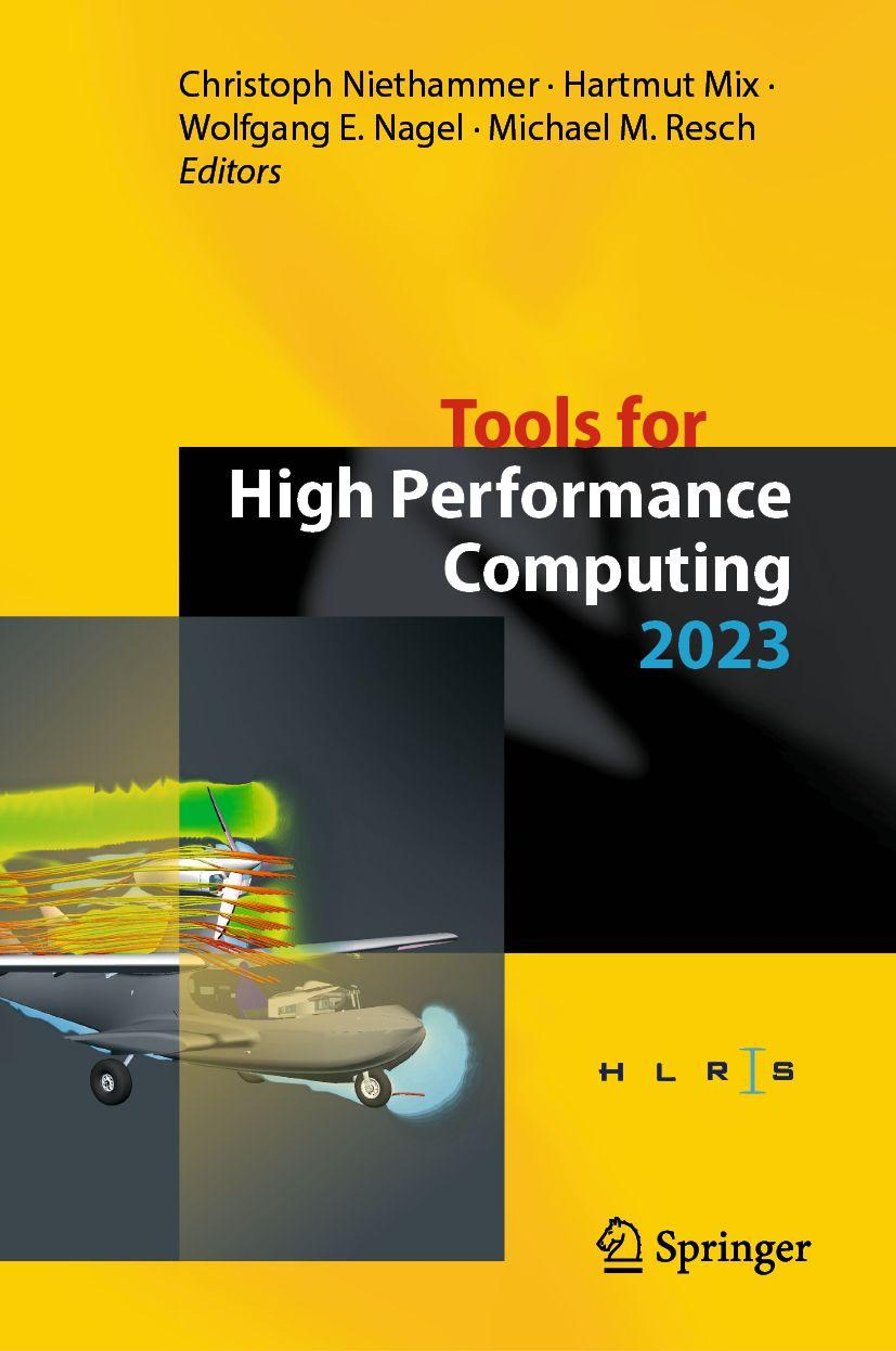 Titel: "Tools for High Performance Computing 2023". Oben Namen der Herausgeber. Illustration eines Flugzeugs. Logos darunter., Buch