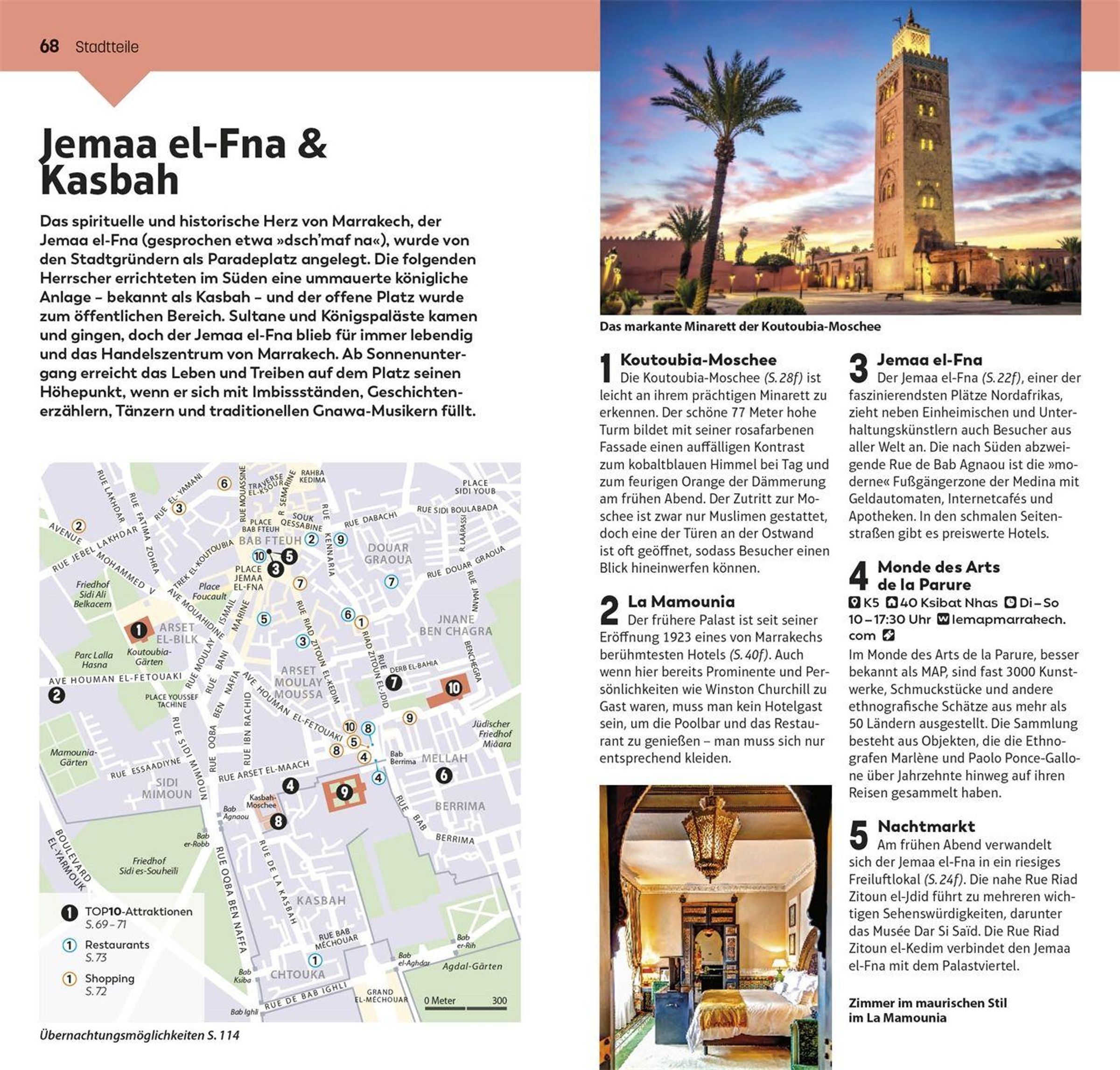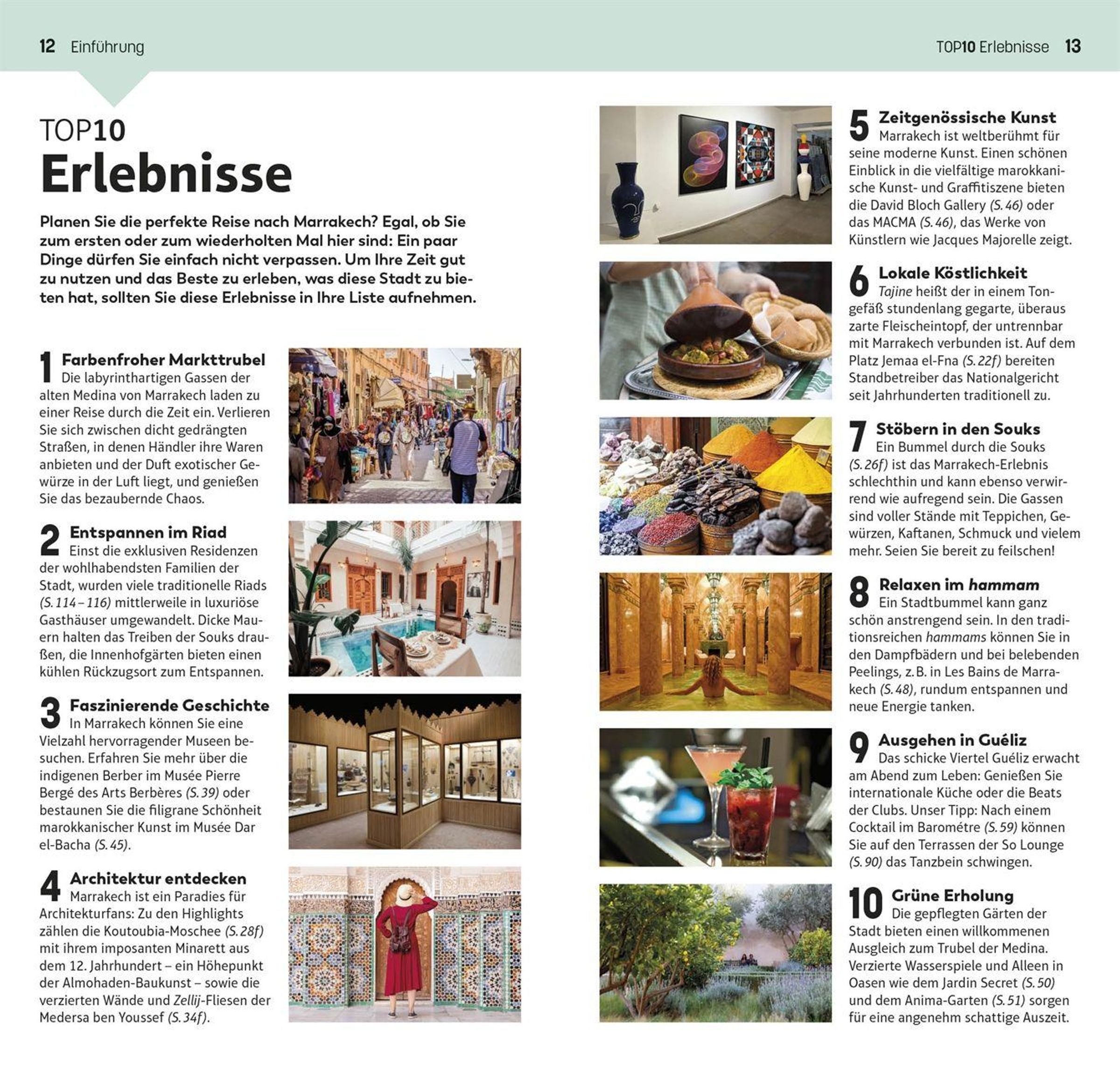 Die 10 interessantesten Souks, die 10 besten Hammams & Spas, die 10 schönsten historischen Gebäude: Mit dem TOP10-Prinzip planen Sie Ihre Marrakech-Reise einfach und ganz individuell. Die praktischen TOP10-Listen präsentieren alle Attraktionen auf einen Blick: von denabsoluten Highlights wie der Koutoubia-Moschee überbesondere Themen wie Parks & Gärten oder Kunst & Kultur bis zu den einzelnen Stadtteilen mit ihren Attraktionen, Restaurants und Shops. So gestalten Sie im NuIhre persönliche Bucket List. Außerdem erwarten Sie Empfehlungen für die TOP10-Erlebnisse , spannende Erkundungstouren und ein Streifzug durch Marrakechsfaszinierende Geschichte . Vor Ort ist der leichte, kompakte TOP10-Reiseführer schnell zur Hand, bietet Ihnen wertvolle Reise-Infos und führt Sie mit detaillierten Karten und dem herausnehmbaren wetterfesten Stadtplan sicher an jedes Ziel.