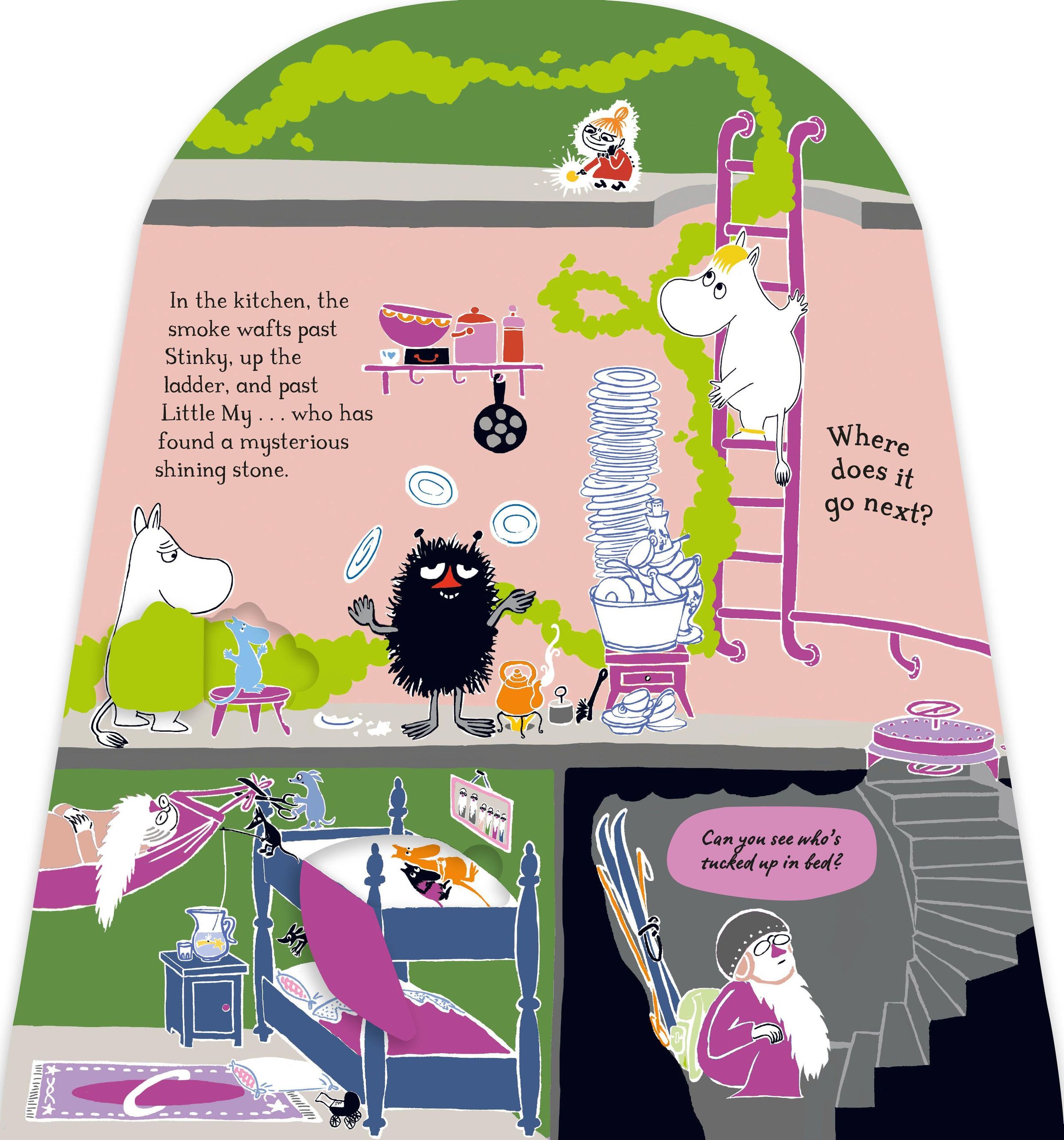 Moomintroll and Snorkmaiden are following a trail of green smoke as they search for a Martian in the Observatory . . . but what will happen when they find him? Join Moomintroll and Snorkmaiden as they find mysterious things happening while they follow the smoke, past Stinky, Little My and some shrunken Moomins and creeps. Along the way, lift the flaps to explore rooms, peek into cupboards and peer behind doors. There are all kinds of wonderful things to find!