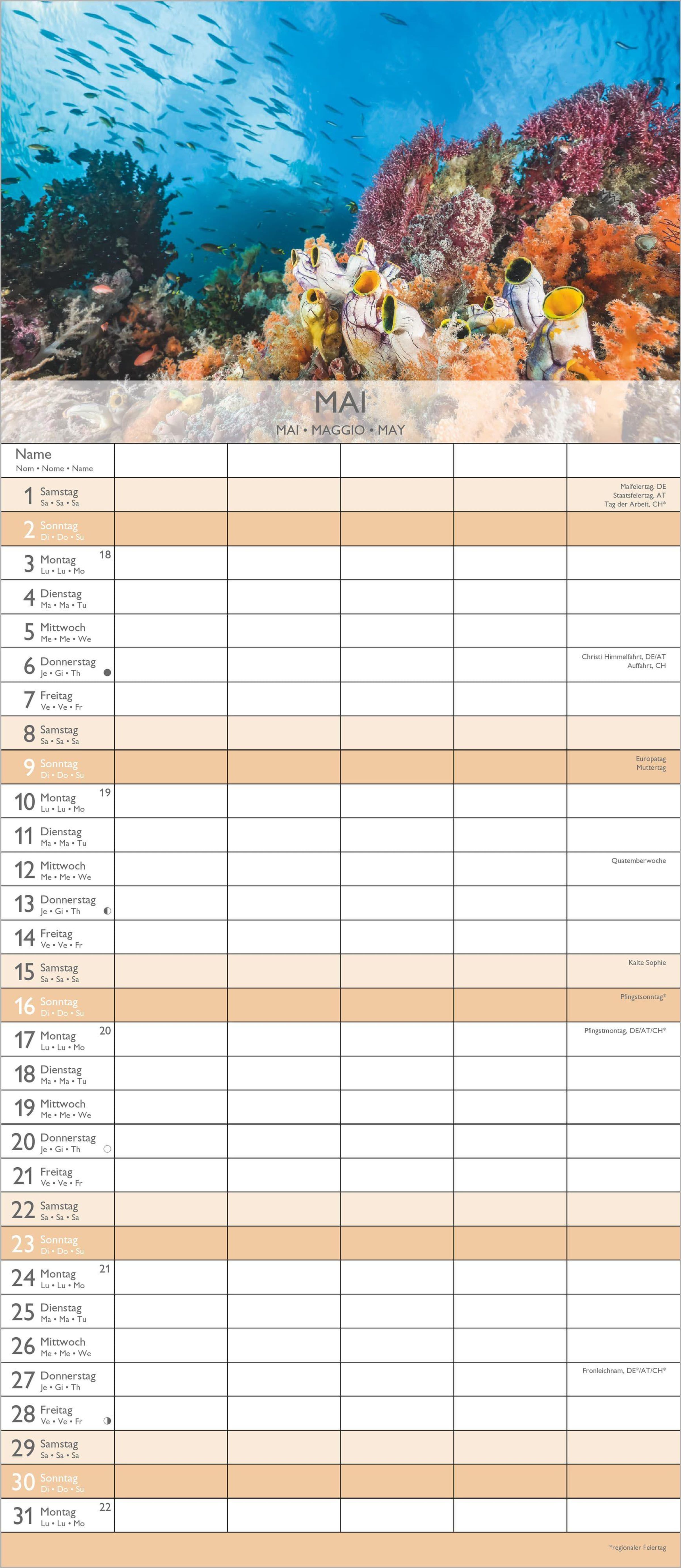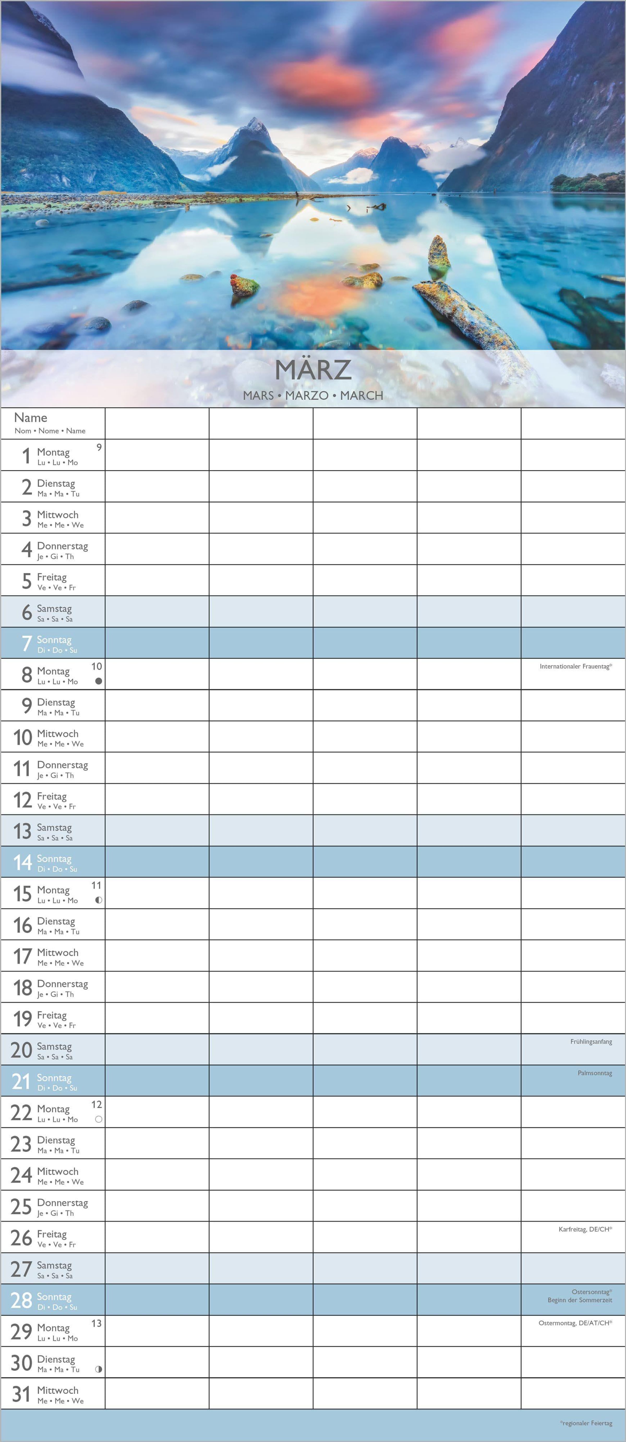 Übersichtliche Monatsansicht: 4-sprachiges Kalendarium (DE/FR/IT/GB) mit Feiertagen und Mondphasen für DE/AT/CH