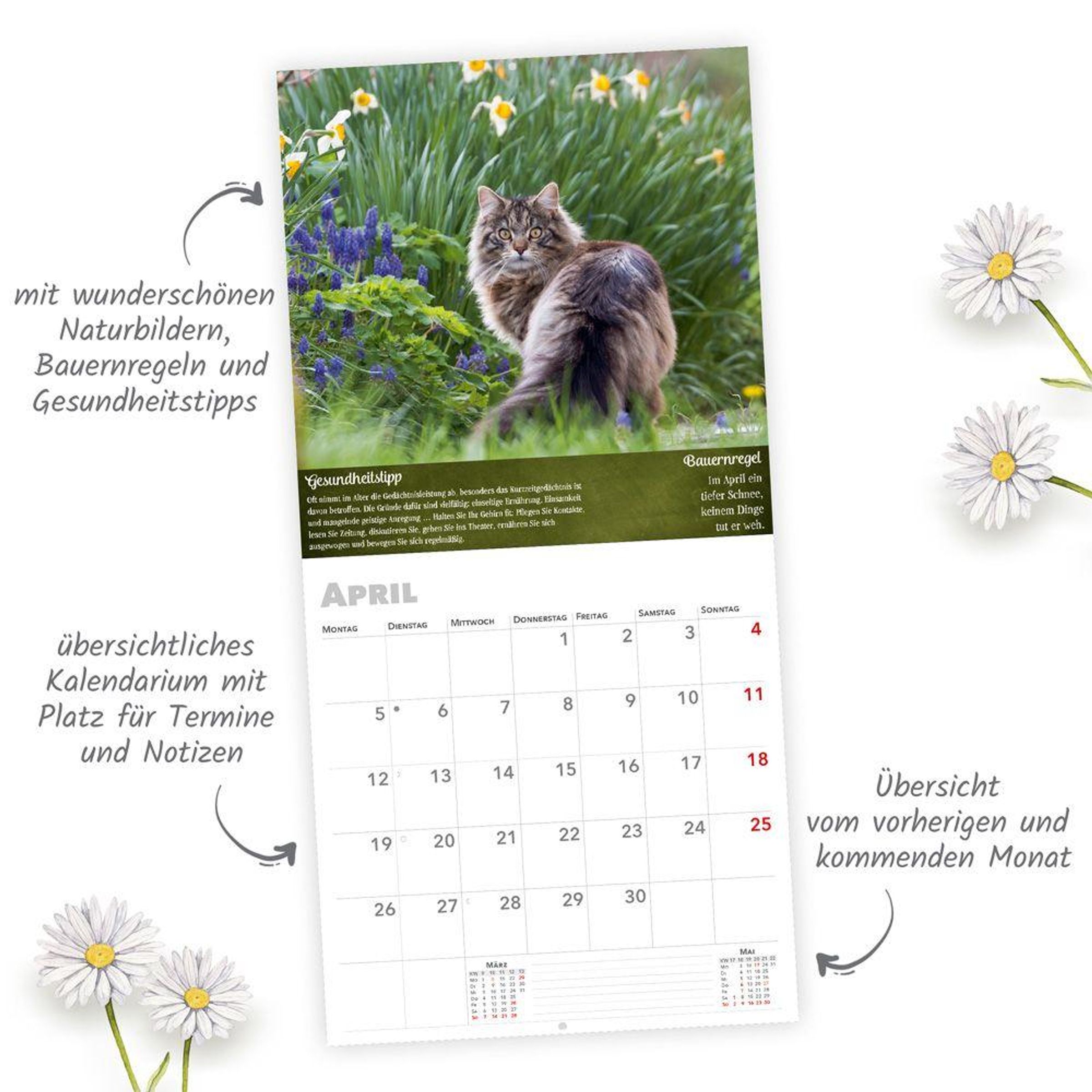 Im Wald, am Feldrand oder im Park um die Ecke - unsere großartige Landschaft umgibt uns zu jeder Zeit. Der dekorative Broschurkalender Landliebe im Format 30 x 30 cm präsentiert jeden Monat herrliche Fotos mit zusätzlichen Informationen. Dank des übersichtlichen Kalendariums mit viel Platz für Termine und Erinnerungen hilft der Kalender wunderbar beim Organisieren des Alltags. Das perfekte Geschenk für alle Naturliebhaber!