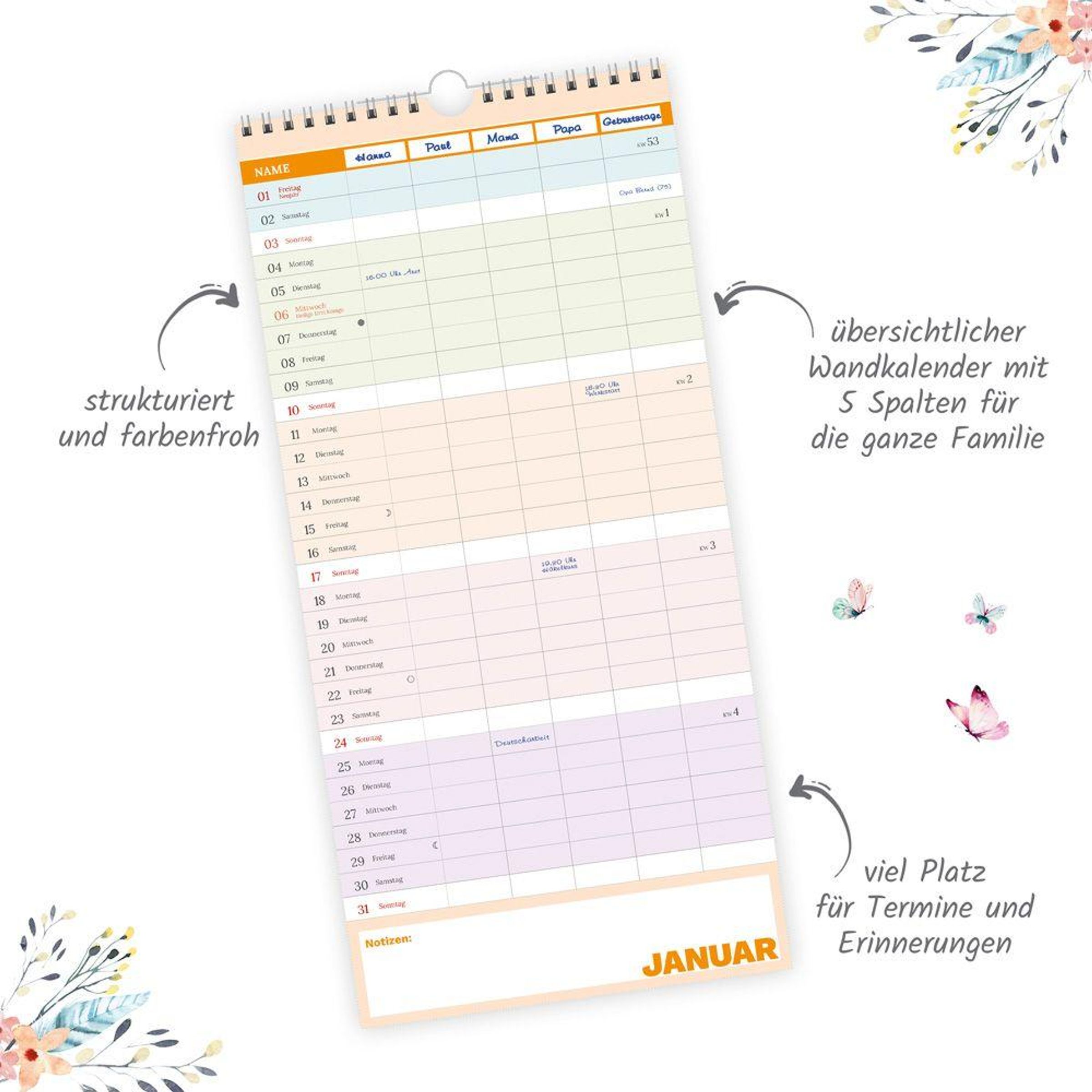 Damit keiner sagen kann, er hätte nichts gewusst! Der fröhlich-bunte Familienkalender zeigt alle wichtigen Termine der gesamten Familie auf einen Blick. So wird der Kalender ein unverzichtbarer Alltagshelfer im aktiven Familienleben. Wie jedes Jahr hilft der Familienkalender auch in den kommenden zwölf Monaten, Pläne und Termine im Griff zu behalten. Mit freundlichen Farben, dem übersichtlichen Kalendarium und jeder Menge Platz für Notizen, Termine oder Erinnerungen ist er ein perfekter Begleiter durch den Familienalltag. So kommt Ordnung in die Pläne aller Familienmitglieder und nichts gerät durcheinander.