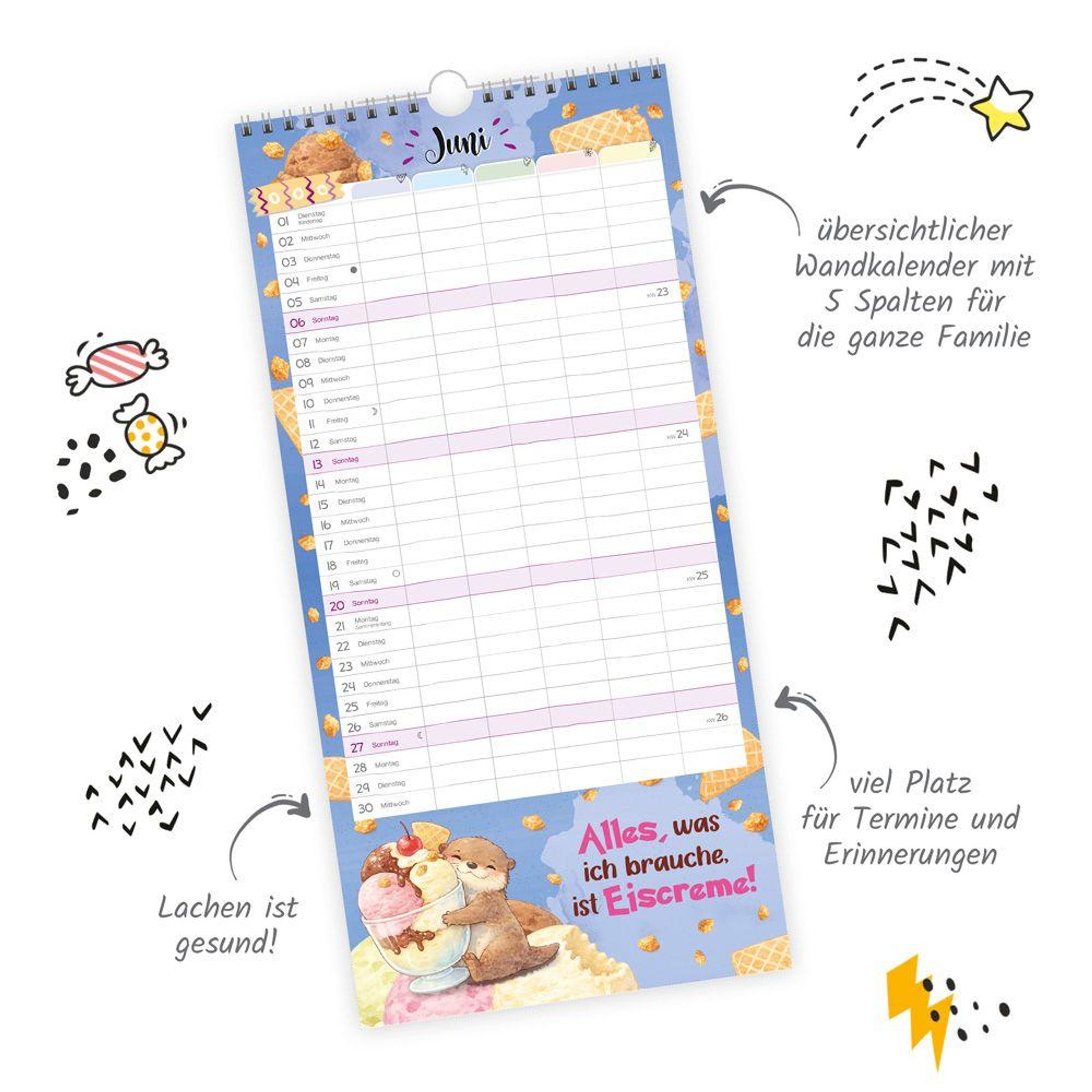 Damit keiner sagen kann, er hätte nichts gewusst! Der Familienkalender zeigt alle wichtigen Termine der gesamten Familie auf einen Blick. So wird der Kalender ein unverzichtbarer Alltagshelfer im aktiven Familienleben. Wie jedes Jahr hilft der Familienkalender auch in den kommenden zwölf Monaten, Pläne und Termine im Griff zu behalten. Mit freundlichen Farben, dezenten Grafiken, dem übersichtlichen Kalendarium und jeder Menge Platz für Notizen, Termine oder Erinnerungen ist er ein perfekter Begleiter durch den Familienalltag. So kommt Ordnung in die Pläne aller Familienmitglieder und nichts gerät durcheinander.