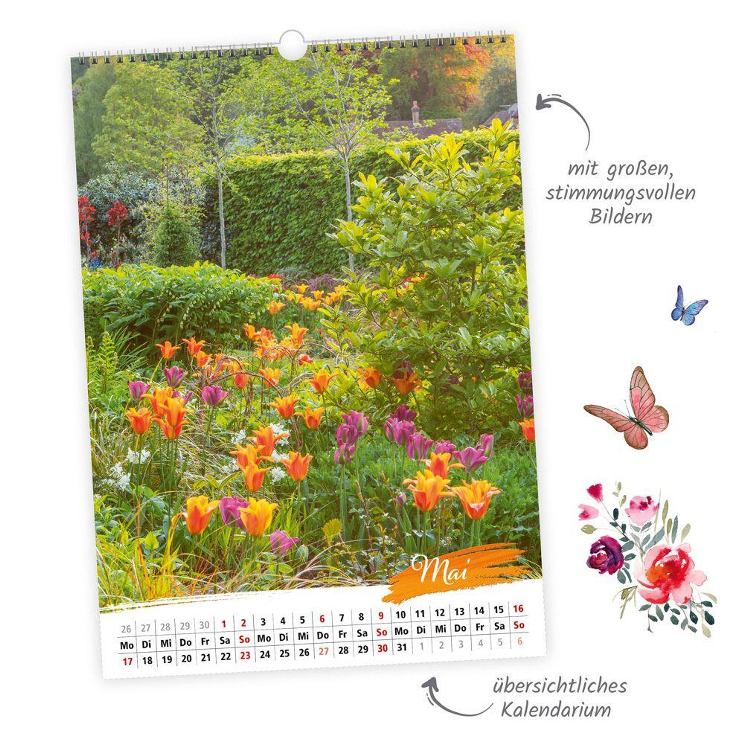 Die Schönheit der Natur ist nicht nur eine Wohltat für Augen und Seele, sie ist auch ein Schlüssel zu mehr Lebensfreude. Lassen wir uns also verzaubern vom Lächeln der Natur in seiner schönsten Form, der Gartenkunst! Unser dekorativer Großbild-Wandkalender TRAUMGÄRTEN im Format 34 x 48 cm entführt in zwölf zauberhafte Traumgärten, die in den eigenen vier Wänden oder im Büro Monat für Monat aufs Neue farbenfrohe Lebensfreude versprühen. Die herrlichen Fotos lassen dabei nicht nur so manche Sorge verfliegen, sie laden auch die Gedanken zum Verweilen ein und bilden so zugleich ein Blickfang und einen wohltuenden Ruhepol im Raum. Dank des gut ablesbaren Kalendariums und farbig markierter Feiertage hilft der Kalender neben all den fantastischen Fotos auch wunderbar beim Organisieren des Alltags. Das perfekte Geschenk um Familienmitgliedern, Freunden, Kollegen oder sich selbst ein ganzes Jahr lang Freude und Inspiration zu schenken. Und ein Muss für alle Freunde der Gartenkunst!