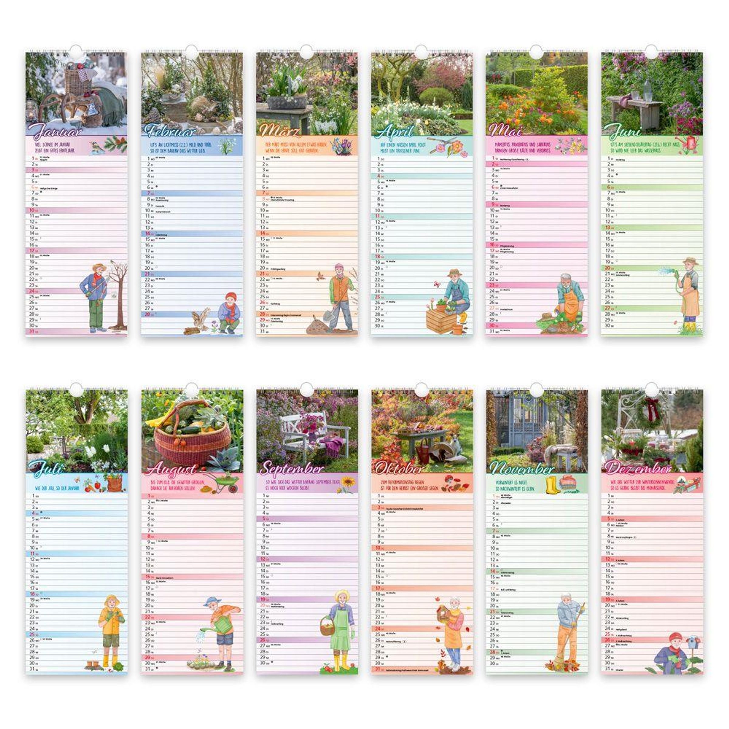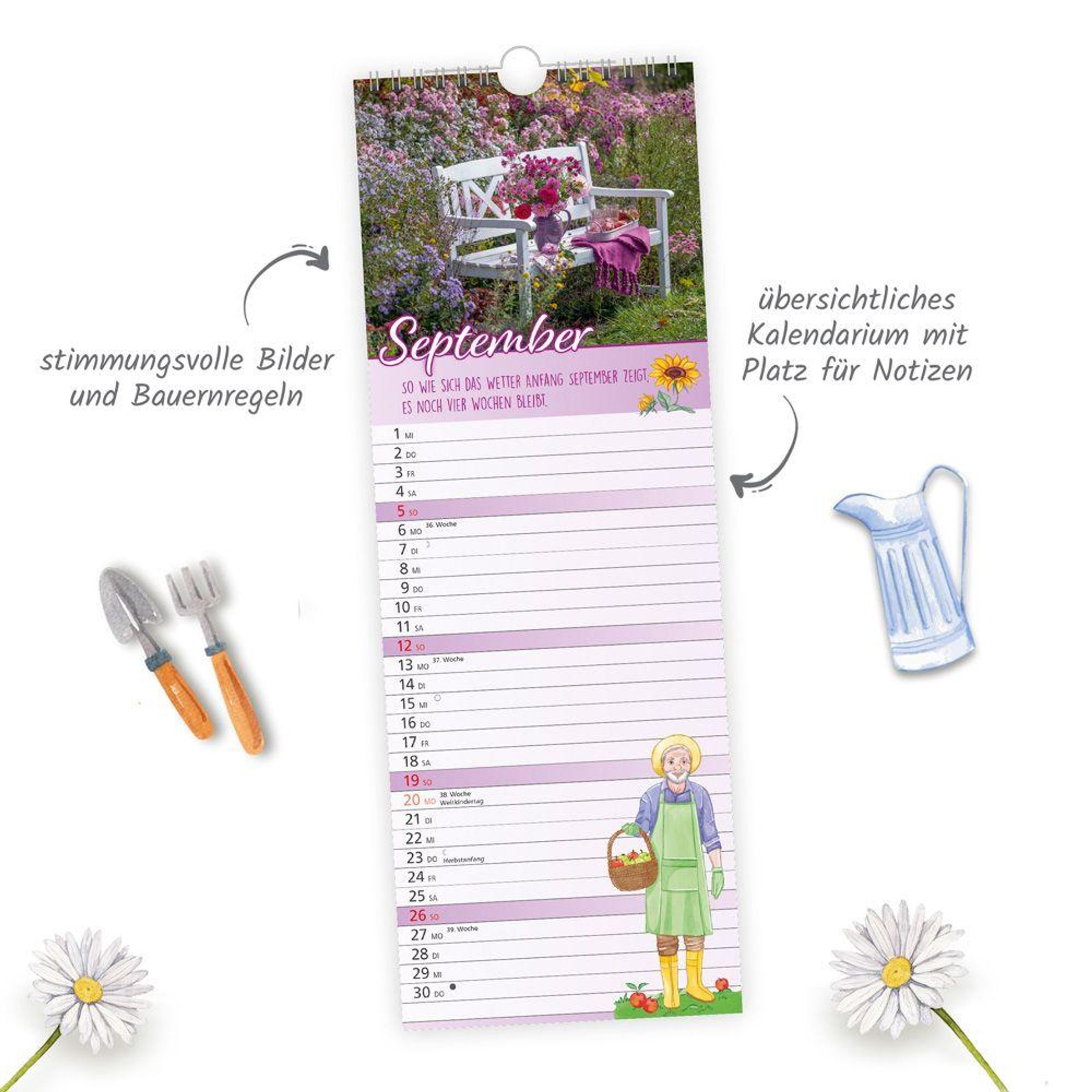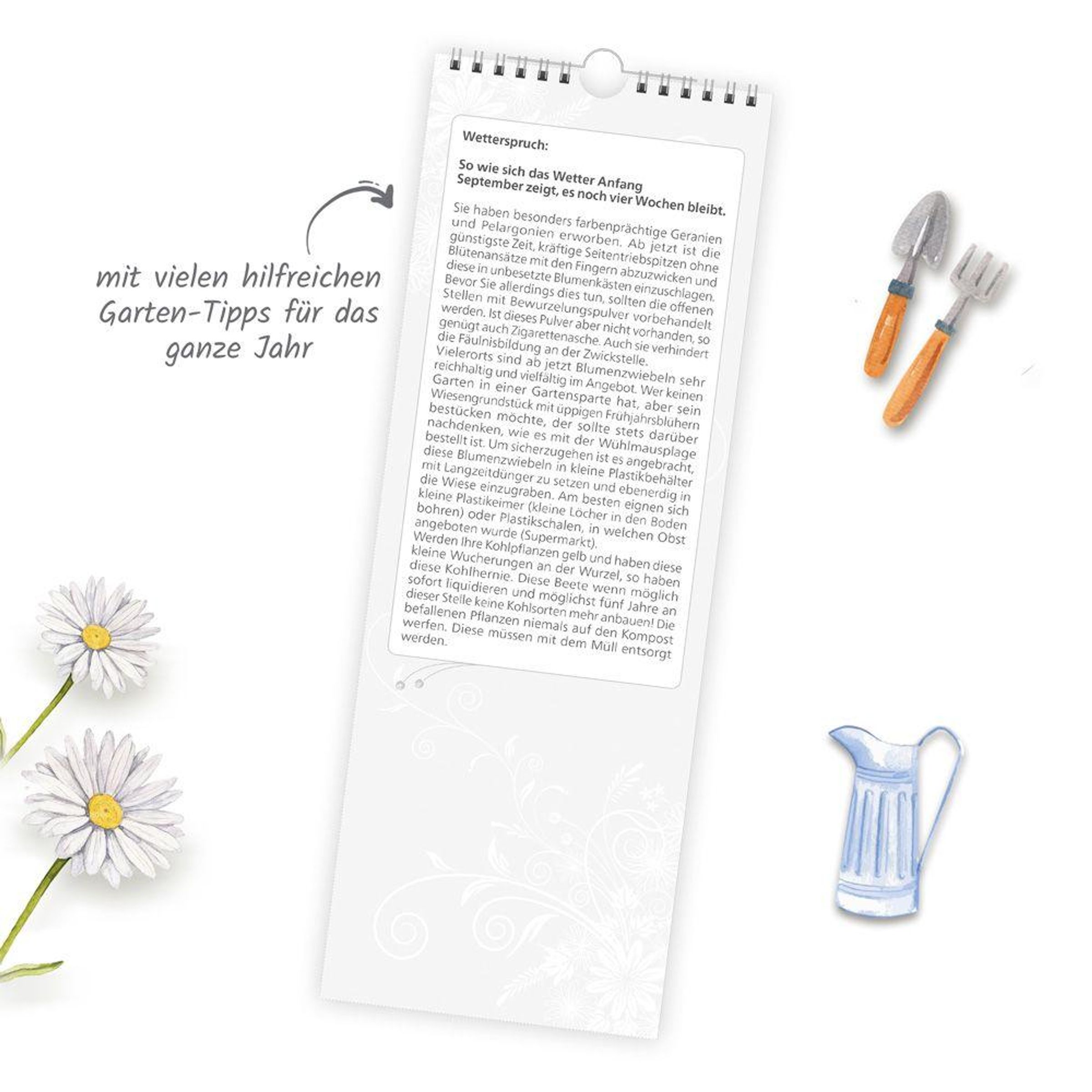 Die Beschäftigung im Grünen und die Besinnung auf Freuden der Natur, das ist oft ein direkter Weg zu mehr Lebensfreude, der allen Gartenfreunden wohlbekannt ist. Unser Streifenkalender GROßVATERS GARTENPLANER im Format 15 x 42 cm bietet deshalb ein ganzes Jahr voller Informationen für alle, die im Garten gerne selbst Hand anlegen und die Früchte Ihrer Arbeit genießen. Mit stimmungsvollen Fotos, althergebrachten Bauernregeln und informativen Gartentipps bringt der Kalender Gärtnerfreuden auch in die eigenen vier Wände und Inspiration in den Alltag. Dank integriertem Mondkalender, Feiertagen, Platz für Termin-Notizen und einer praktischen Schulferienübersicht auf der Rückseite hilft er neben all den tollen Zusatzinfos natürlich auch wunderbar beim Organisieren des Alltags. Das perfekte Geschenk um Familie, Freunden, Kollegen oder sich selbst ein ganzes Jahr lang Freude und Inspiration zu schenken.